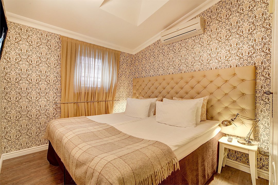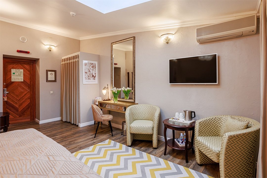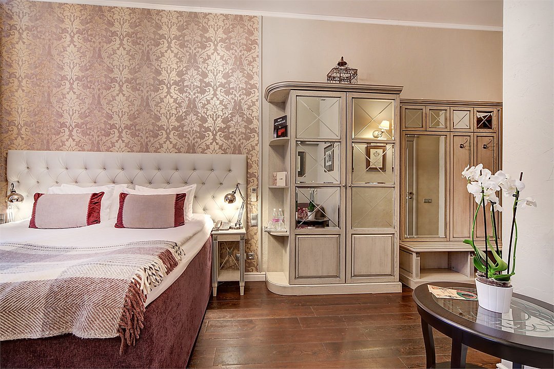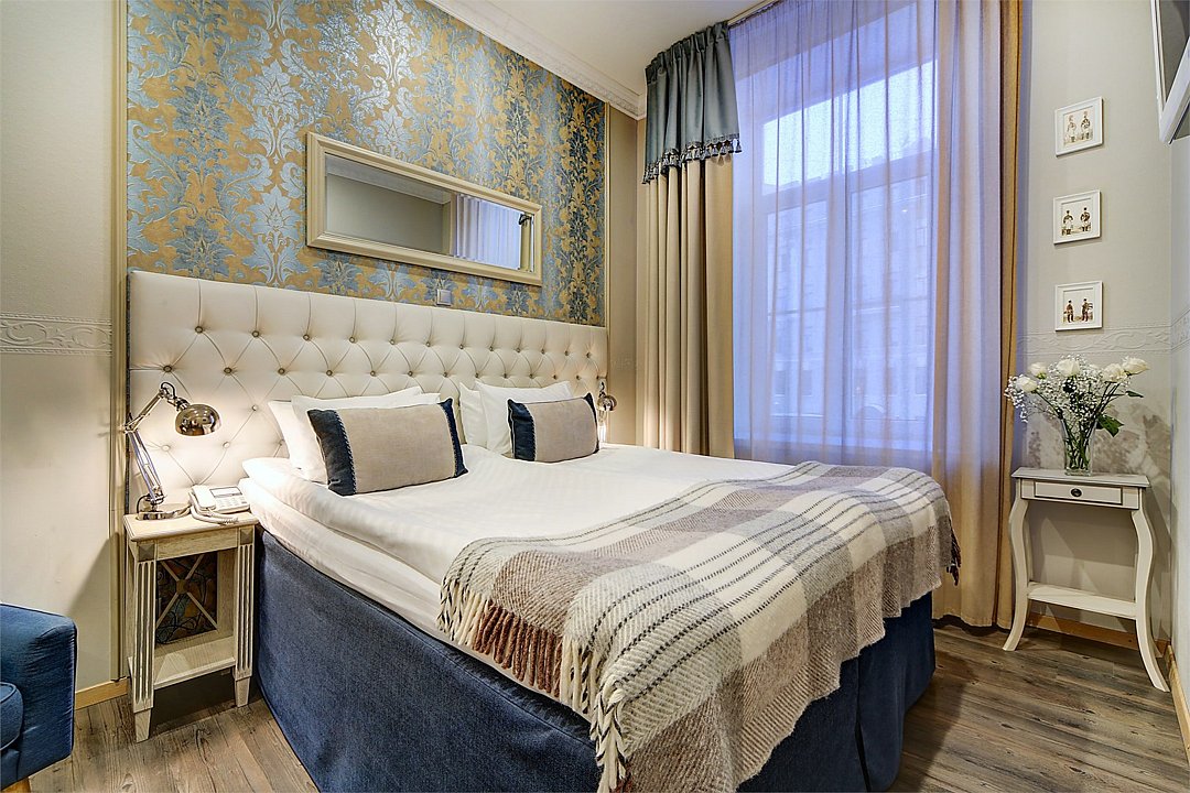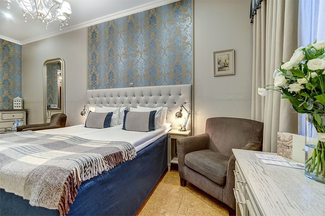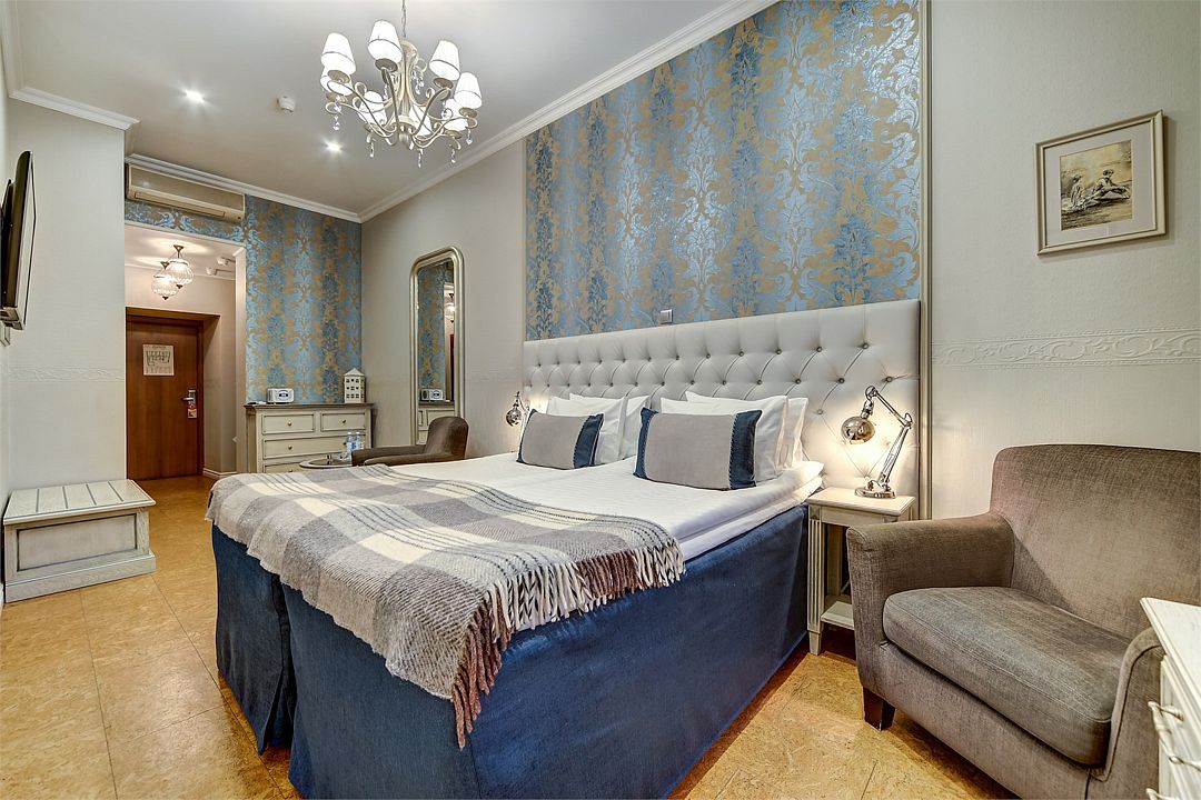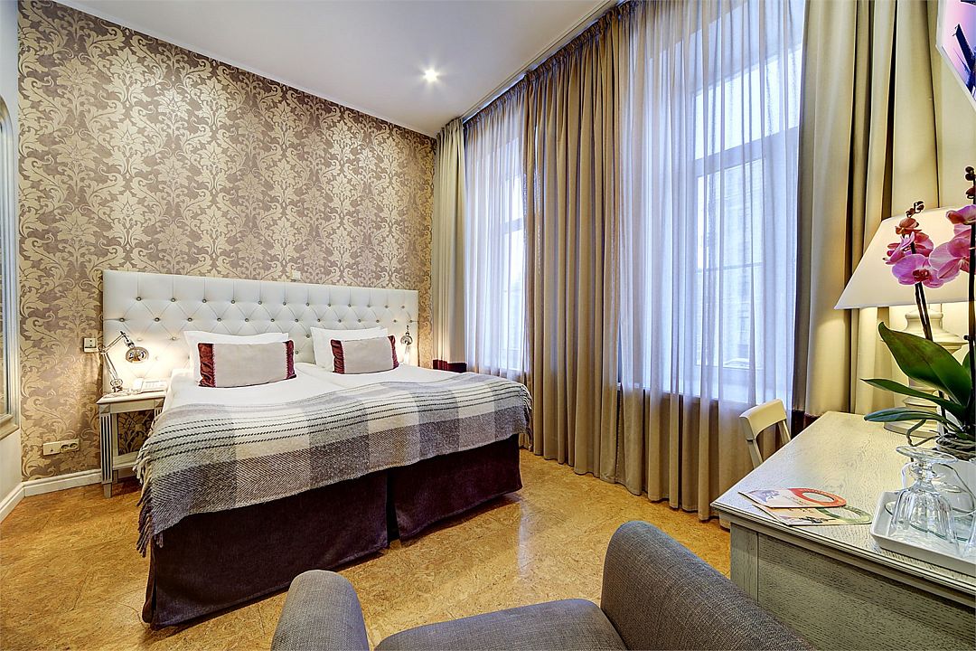 Классический двухместный номер средней площадью 18 кв. м с высоким потолком, большим окном и чудесным видом на набережную реки Мойки и Аракчеевский дворец. Высокие комфортабельные кровати и белье из шелковистого страйп-сатина обеспечат прекрасный сон. Можно выбрать одну двуспальную кровать или две отдельные (Dbl/Twin).Услуги и удобства