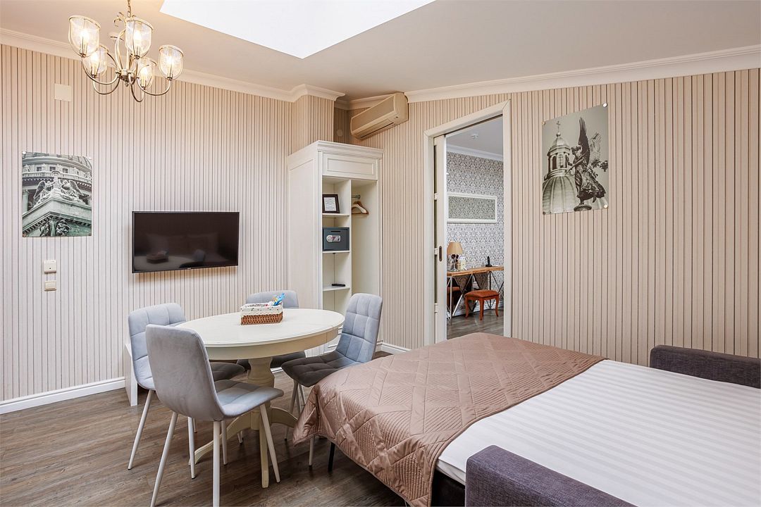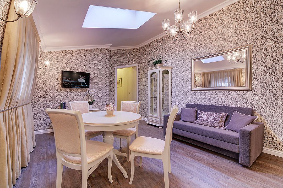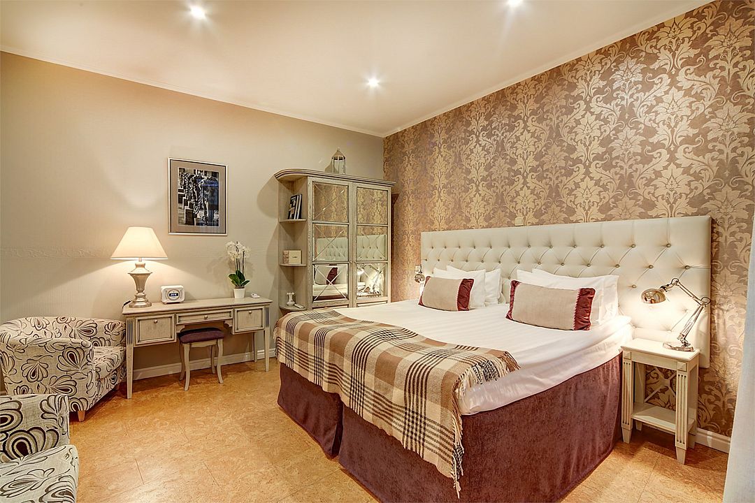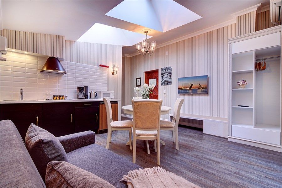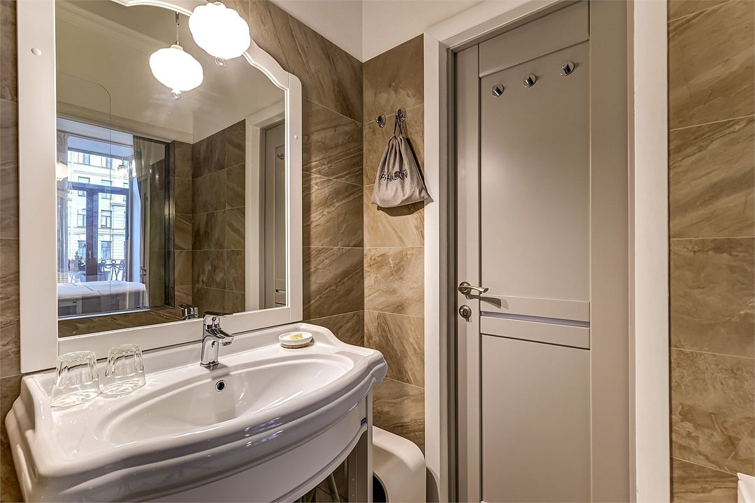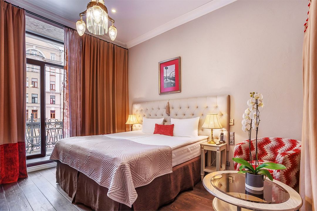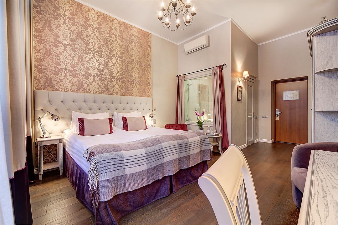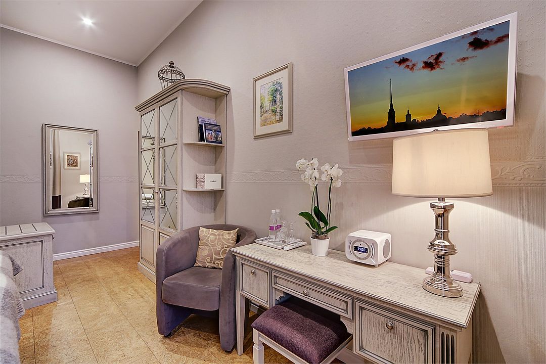 Прекрасный романтический номер площадью 25 кв. м с балконом, выходящим на набережную р. Мойки и Дворцовую площадь. Элегантная стилистика номера вдохновлена Петербургом XIX века. Высокие потолки, светлая мебель, венецианский текстиль, антикварная люстра - все это создает особую ауру изящества и уюта. А постельное белье премиального качества из страйп-сатина обеспечит прекрасный сон.Услуги и удобства