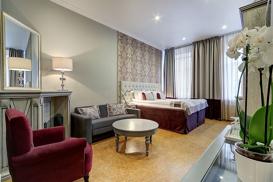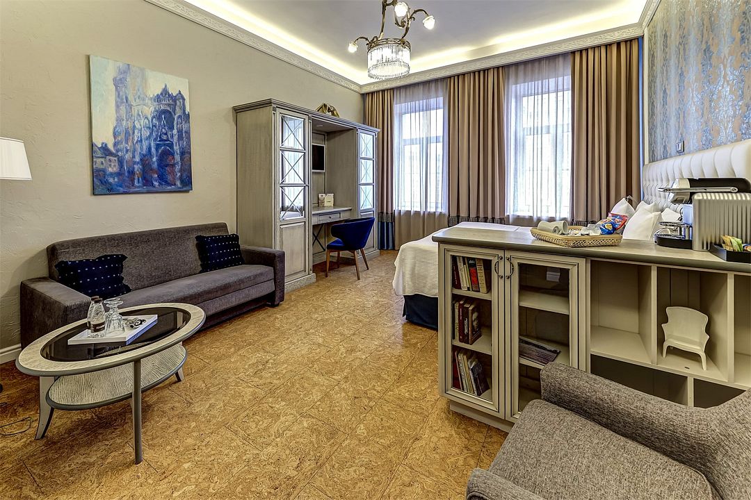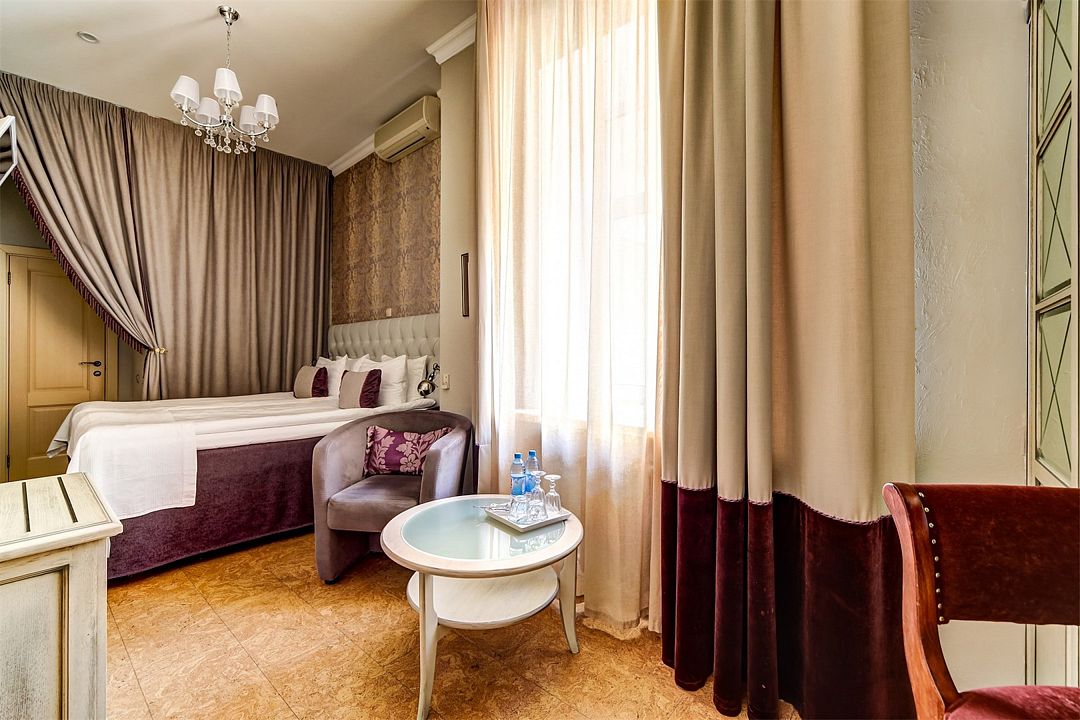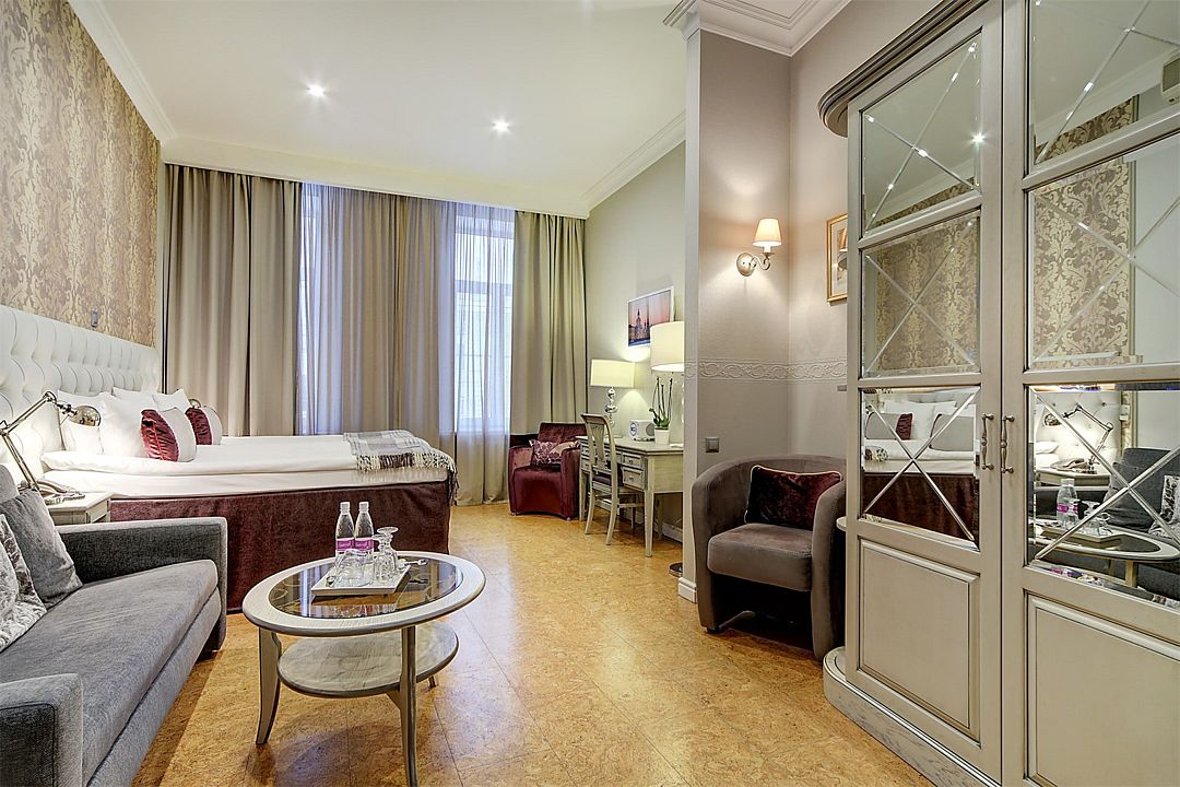 Номера располагаются на этажах с первого по третий. Просторные, светлые номера средней площадью 23 кв. м с двумя большими окнами и роскошным видом на набережную реки Мойки и Зимнюю канавку. Выделенные зоны спальни и гостиной. Прекрасный выбор для деловой поездки и комфортного отдыха. Комфортабельные кровати и белье из шелковистого сатина обеспечат прекрасный сон. Размещение детей до 5 лет включительно - бесплатно. При необходимости предоставляется детская кроватка.Услуги и удобства