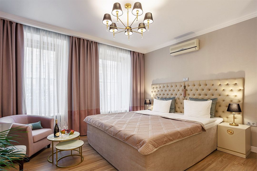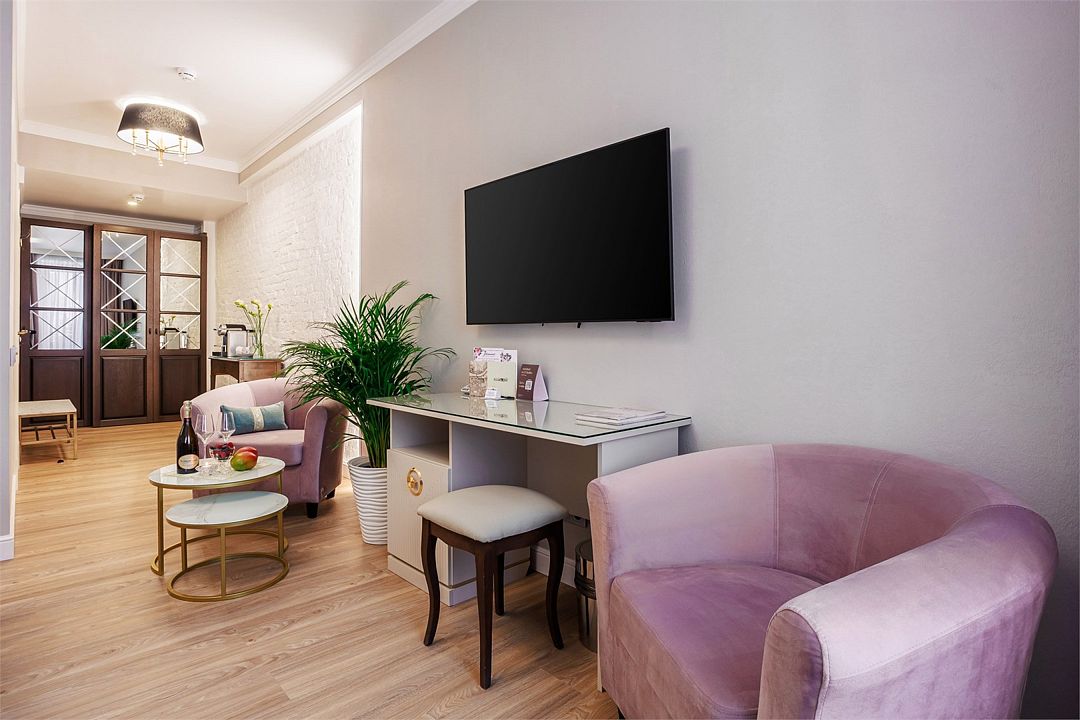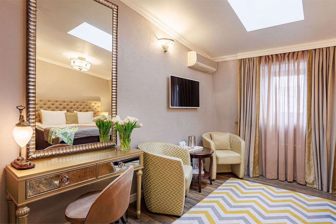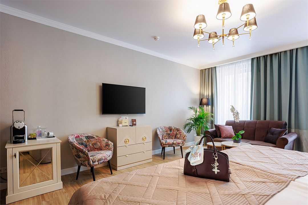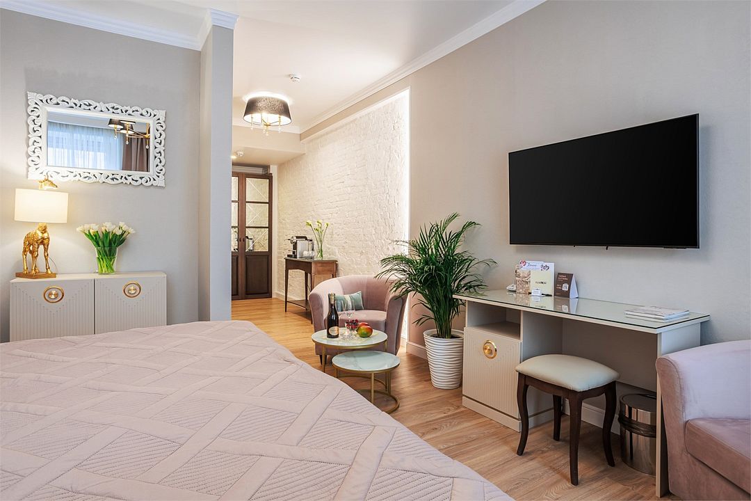 телевизор, Wi-Fi, телефон, кондиционер, фен, кофемашина, утюг, теплый пол, халаты, банные полотенца, тапочки, косметические средства, две односпальные или большая двуспальная кровать, гладильная доска, диван, кресла, тумбы, шкаф для одежды, журнальный столик, письменный стол, багажная тумба, зеркало, мини-бар, сейф, минеральная вода, душ, вид на город, вид на реку, диван-кроватьВ гостиничном номере
