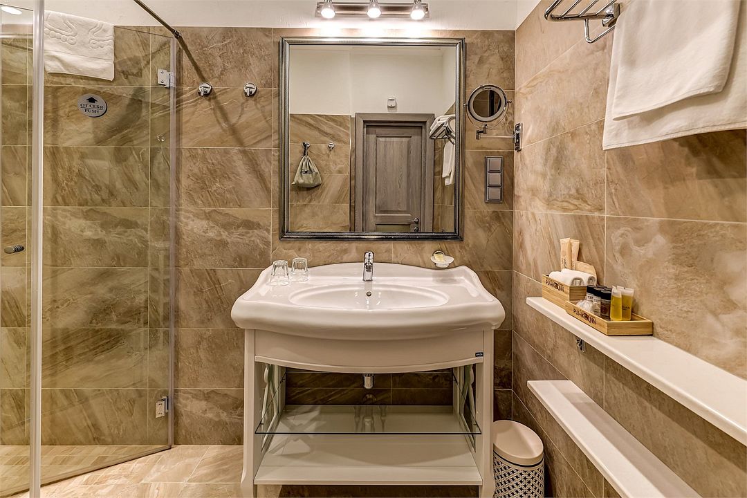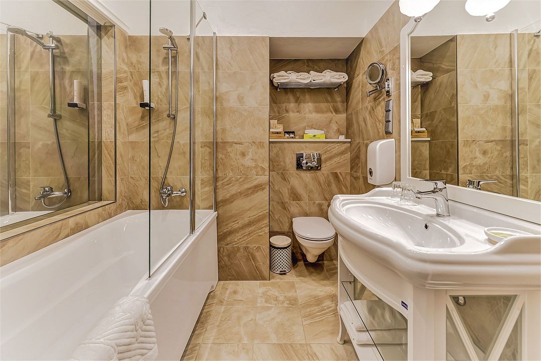 телевизор, Wi-Fi, телефон, холодильник, кондиционер, фен, утюг, душевая кабина, теплый пол, халаты, банные полотенца, тапочки, косметические средства, две односпальные или большая двуспальная кровать, гладильная доска, тумбы, шкаф для одежды, письменный стол, зеркало, мини-бар, сейф, минеральная вода, вид на реку, кресло, чайная станцияВ гостиничном номере
