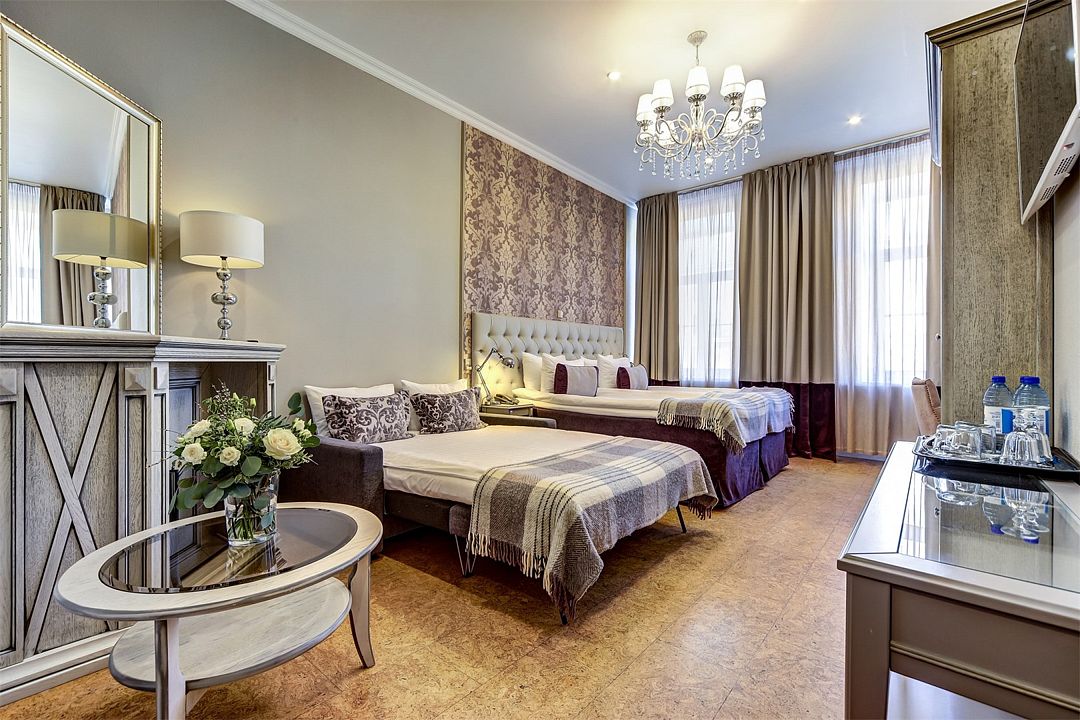 Номера располагаются на этажах с первого по третий. Просторные, светлые номера площадью 25-27кв. м с двумя большими окнами и роскошным видом на набережную реки Мойки и Зимнюю канавку. Выделенные зоны спальни и гостиной (диван, кресла, журнальный столик). Комфорт Плюс — прекрасный выбор для деловой поездки и комфортного отдыха семьей. Высокие комфортабельные кровати и белье из шелковистого сатина обеспечат прекрасный сон. При трехместном размещении диван разбирается и становится полноценным удобным спальным местом.Услуги и удобства