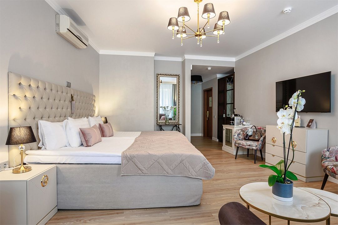 телевизор, Wi-Fi, телефон, кондиционер, фен, кофемашина, утюг, ванная комната, ванна, теплый пол, халаты, банные полотенца, тапочки, косметические средства, балкон с красивым видом, двуспальная кровать, гладильная доска, кресла, тумбы, шкаф для одежды, журнальный столик, письменный стол, багажная тумба, зеркало, мини-бар, сейф, минеральная водаВ гостиничном номере