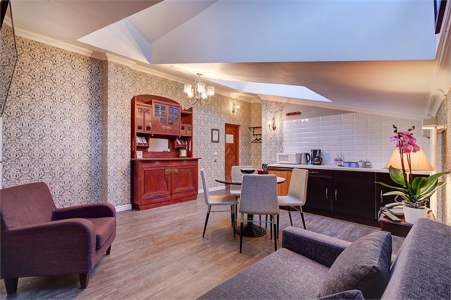 Номер на мансардном этаже площадью 61 кв.м с двумя двухместными спальнями (DBL или TWIN), гостиной, двумя душевыми комнатами. В гостиной выделена кухонная зона со всей необходимой встроенной техникой и набором посуды.Услуги и удобства