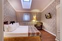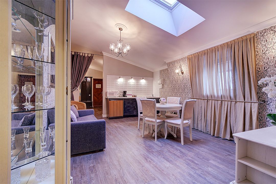 Номер на мансардном этаже площадью 73 кв.м для комфортного размещения 6 человек. В номере три двухместные спальни, гостиная, две душевые комнаты. В гостиной выделена кухонная зона со всей необходимой встроенной техникой и набором посуды.Услуги и удобства