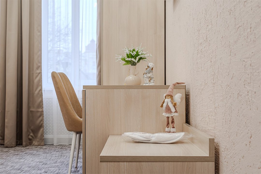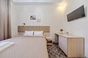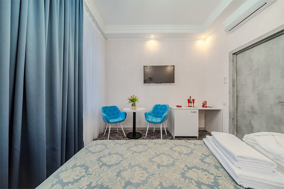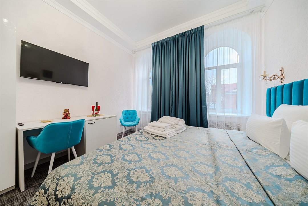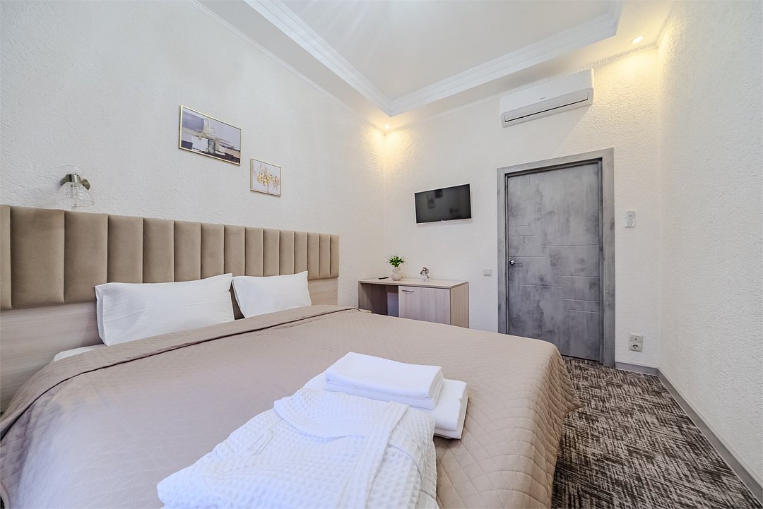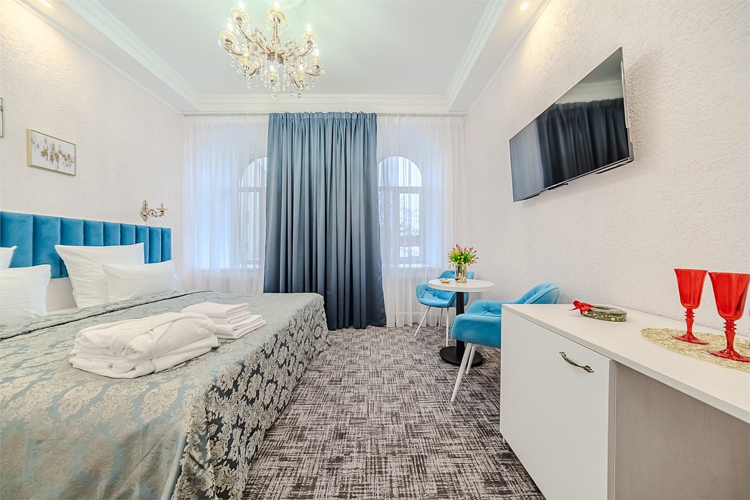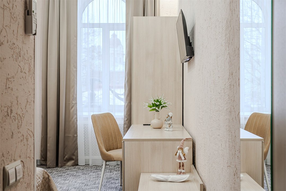 телевизор, Wi-Fi, кондиционер, светильник, фен, электронные замки, микроволновая печь, утюг, ванная комната, халаты, банные полотенца, тапочки, две односпальные или большая двуспальная кровать, ортопедический матрас, шкаф для одежды, вешалки, багажная тумба, зеркало, сейф, ковровое покрытие, вид на город, кулер на этаже, вид во двор, высокие потолки, стаканы, стул, стол, тумба, туалетные средства, сушилка для белья, цифровое тв, мини-холодильник, номер для некурящих, фригобар, уборка номера, вешалки-плечики, шапочка для душа, мыло, затемняющая штора, зеркало в полный рост, Android TVВ номере