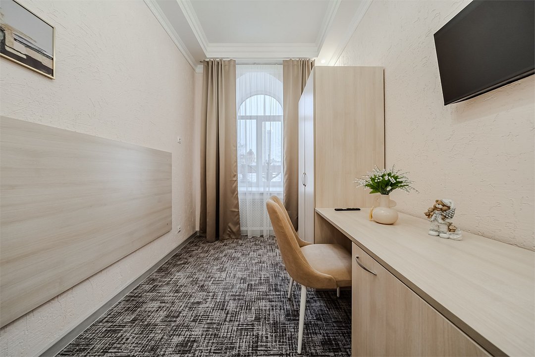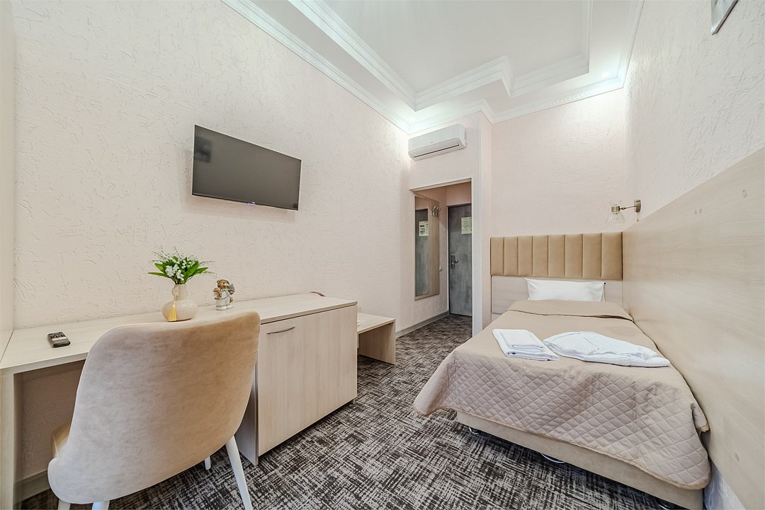 телевизор, Wi-Fi, кондиционер, светильник, фен, ванная комната, халаты, тапочки, гигиенические средства, односпальная кровать, шкаф для одежды, вешалки, письменный стол, багажная тумба, зеркало, сейф, ковровое покрытие, душ, вид на город, кулер на этаже, высокие потолки, стаканы, стул, стол, сушилка для белья, цифровое тв, мини-холодильник, номер для некурящих, фригобар, уборка номера, вешалки-плечики, шапочка для душа, затемняющая штора, зеркало в полный рост, Android TVВ номере