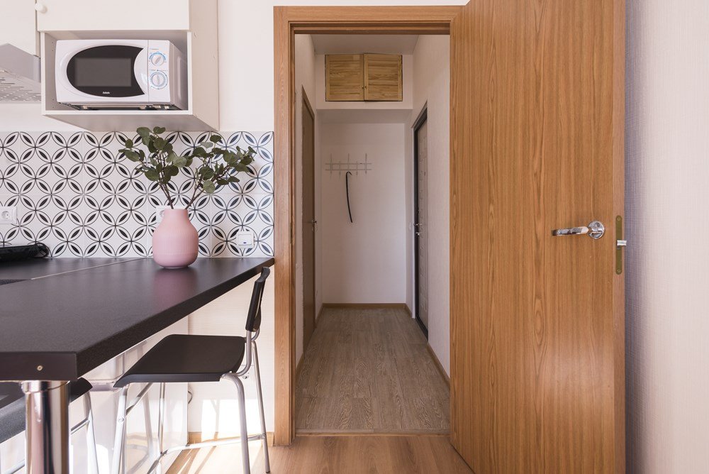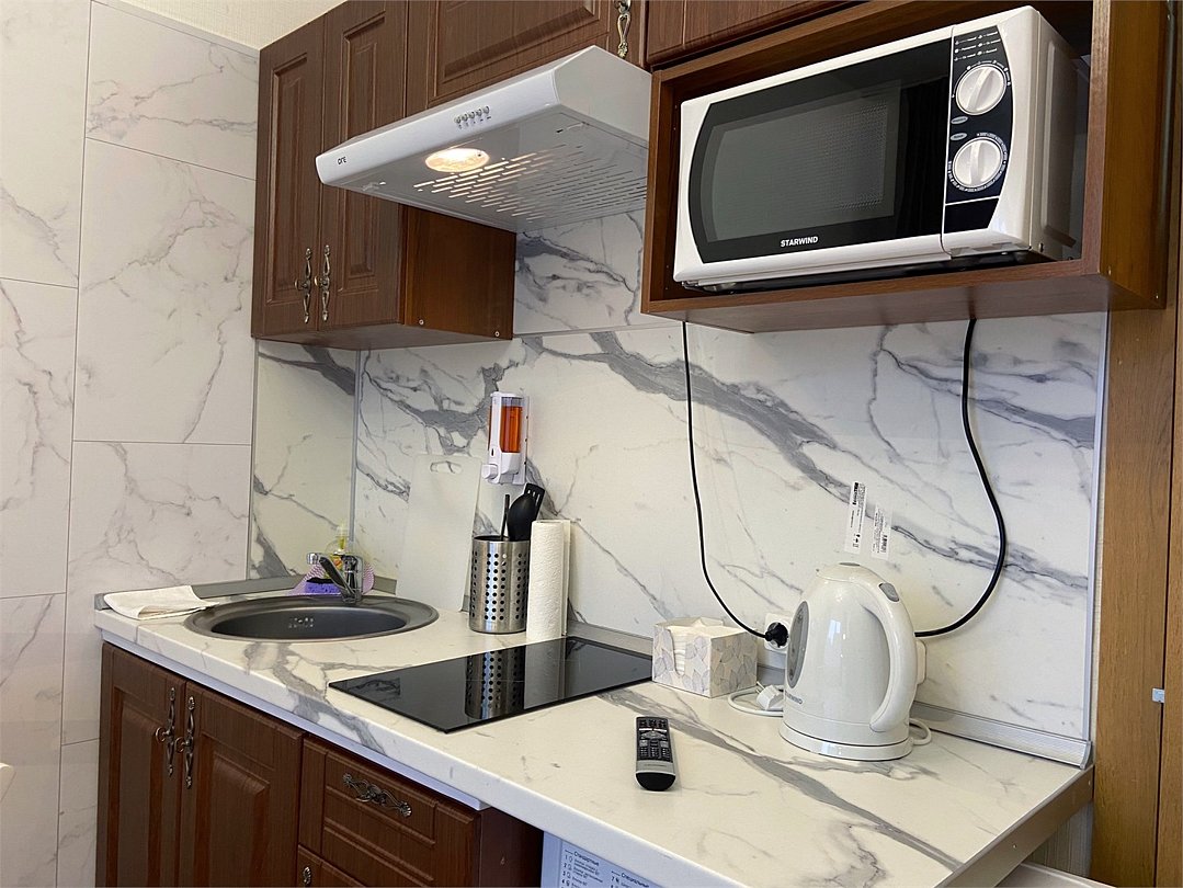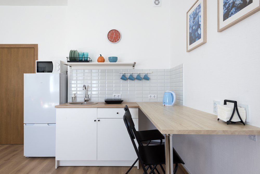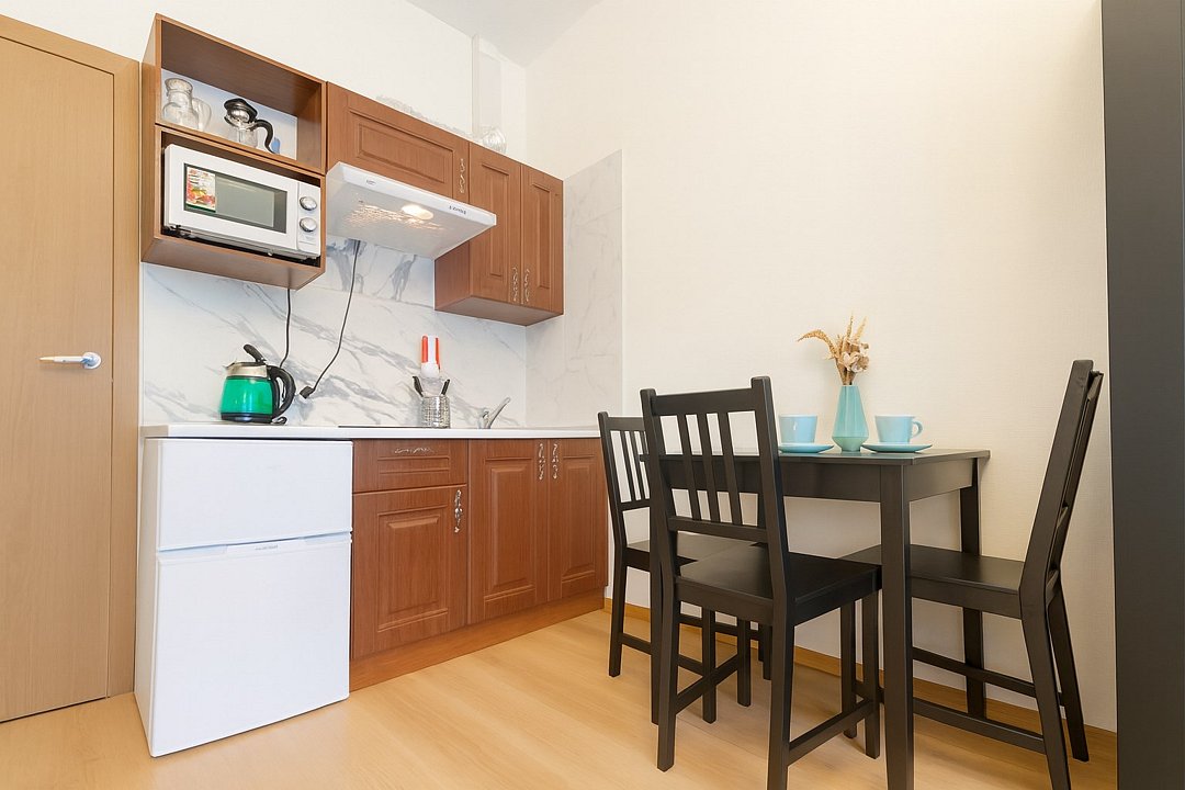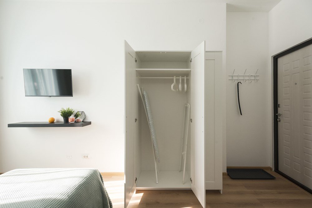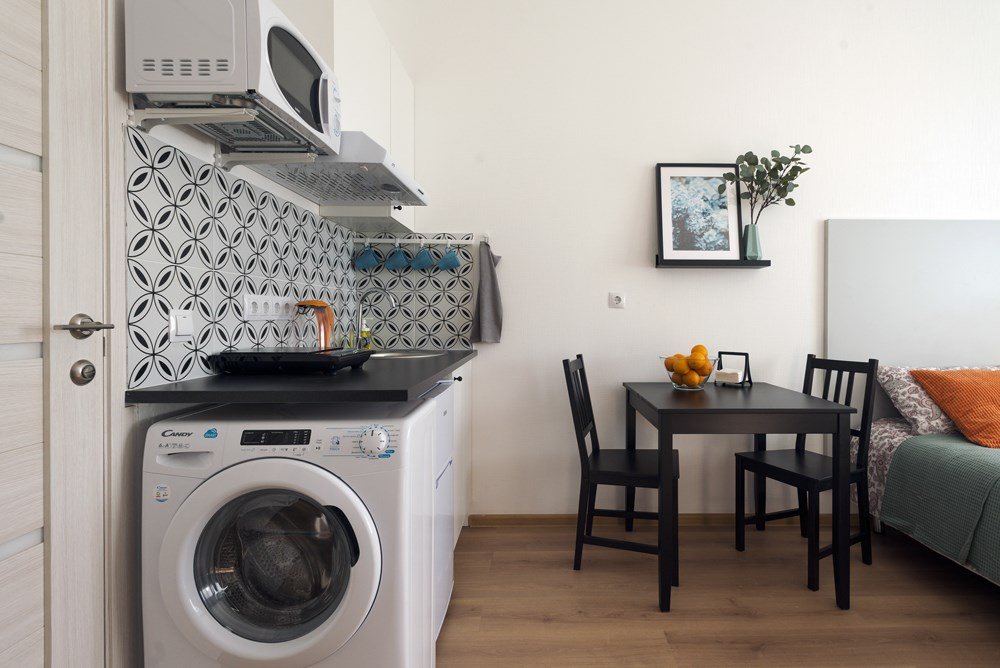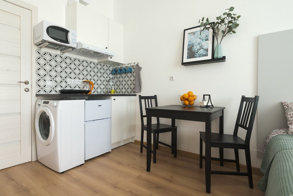 Wi-Fi, холодильник, светильник, фен, электронные замки, утюг, обогреватель, ванная комната, водонагреватель, банные принадлежности, кровать «Queen size», гладильная доска, стулья, шкаф для одежды, гардеробная, вешалки, обеденный стол, чайный набор, набор посуды, стиральная машина, чайник, унитаз, косметическое зеркало, обеденная зона, отопление, душ, плиточное покрытие, вид во двор, ламинат, кухонная посуда, стаканы, кухонная утварь, столовые приборы, стиральная машина и сушилка, стул, сушилка для белья, мини-холодильник, кухонный уголок, телевизор со Smart TV, холодильный шкафВ студии