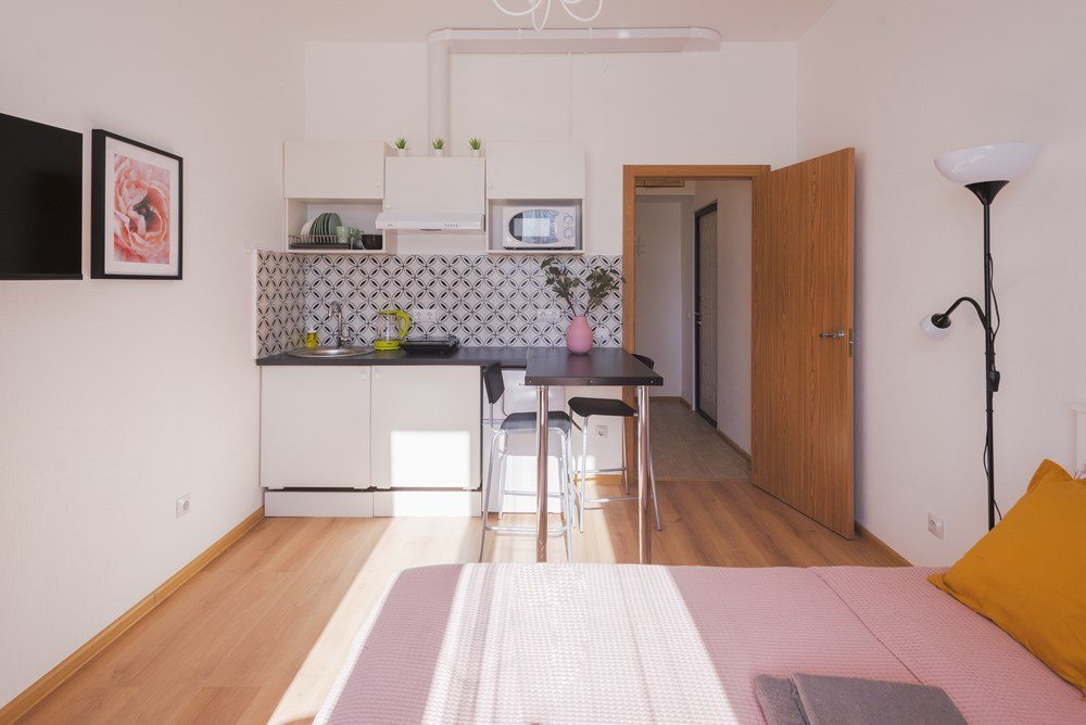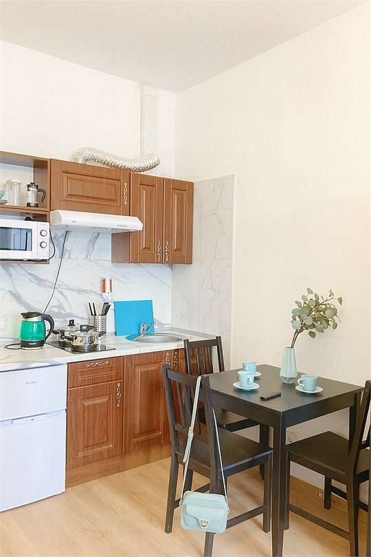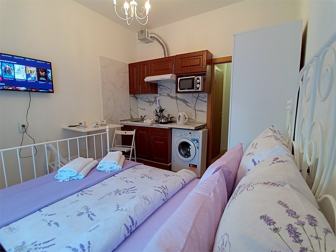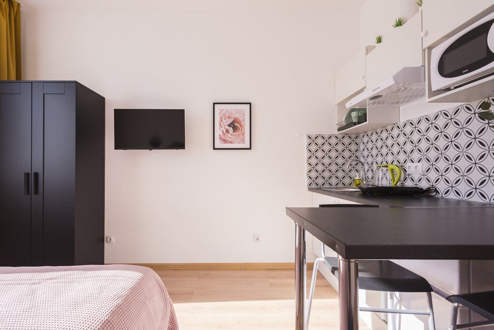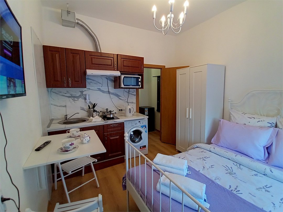 Wi-Fi, холодильник, светильник, фен, система безопасности, электронные замки, плита для приготовления пищи, микроволновая печь, утюг, ванна, ванна или душевая кабина, санузел, банные принадлежности, банные полотенца, гигиенические средства, кровать «Queen size», двуспальная кровать, тумбы, стулья, шкаф для одежды, вешалки, зеркало, комод, мебельный гарнитур, кухня, набор посуды, стиральная машина, чайник, унитаз, раковина, косметическое зеркало, обеденная зона, отопление, плиточное покрытие, вид во двор, ламинат, кухонная посуда, стаканы, столовые приборы, стиральная машина и сушилка, стол, туалет, сушилка для белья, кухонный уголок, телевизор со Smart TVВ студии