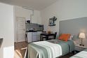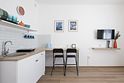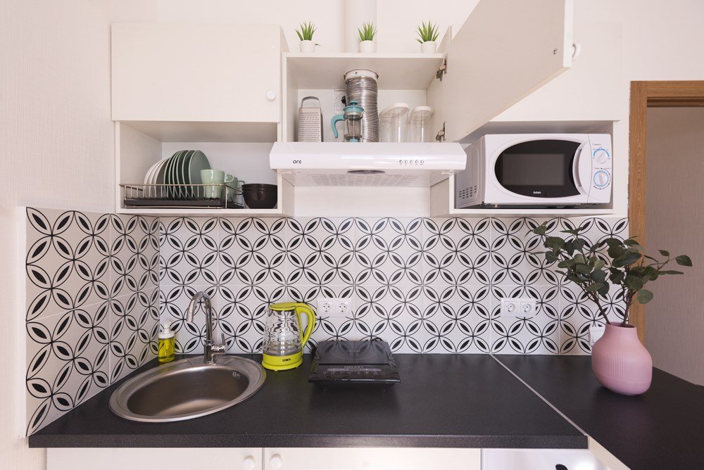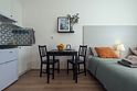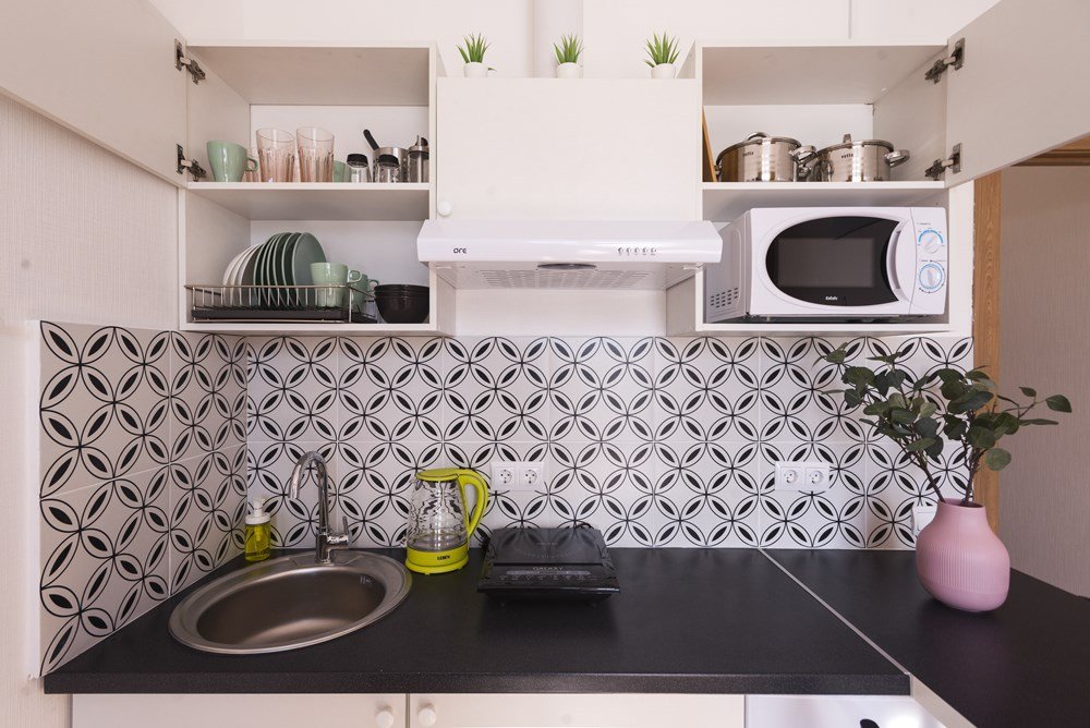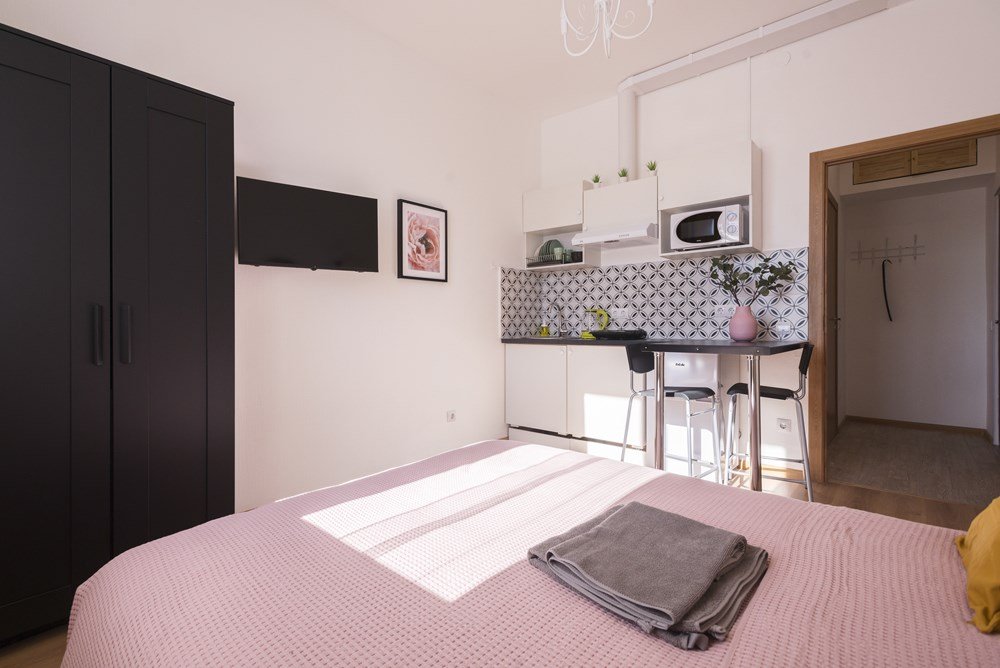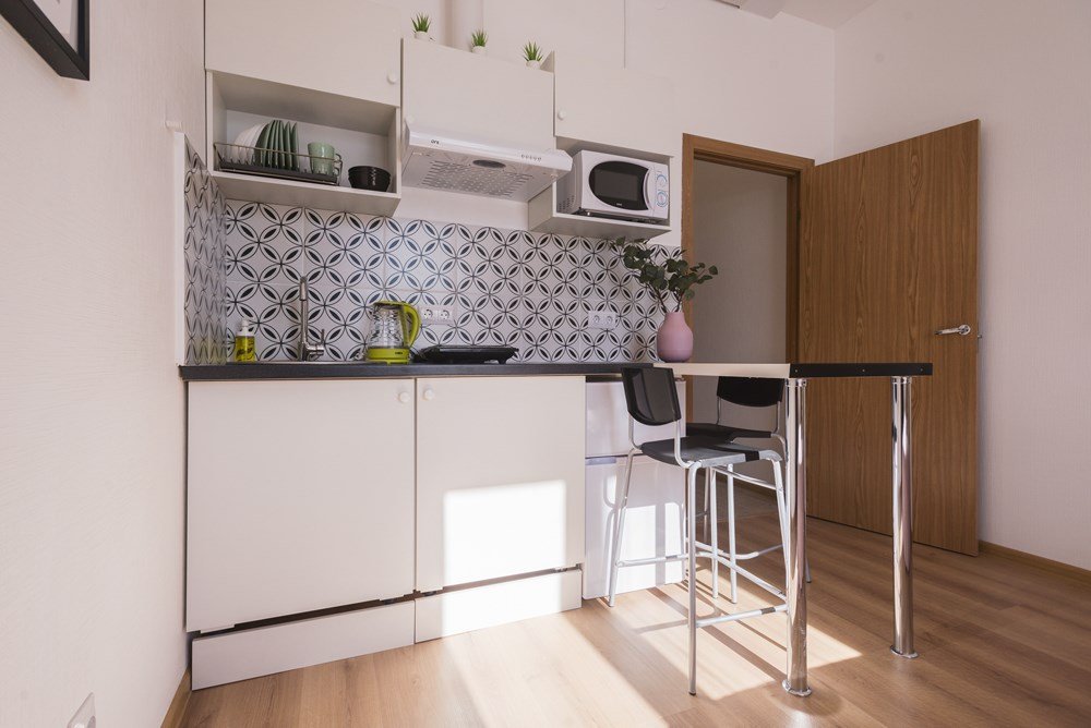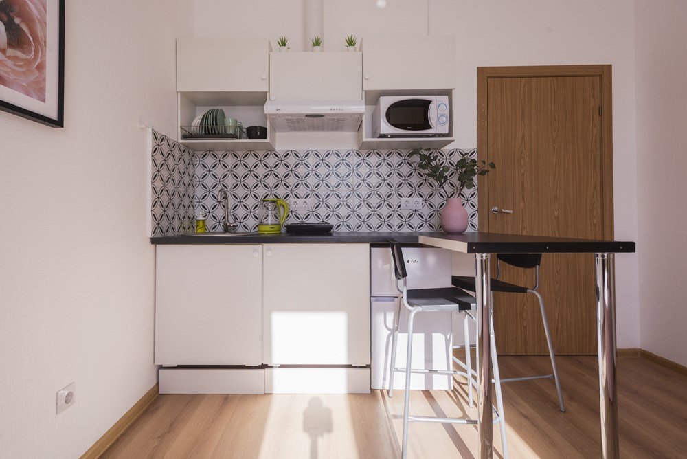 Wi-Fi, холодильник, светильник, фен, система безопасности, электронные замки, плита для приготовления пищи, микроволновая печь, утюг, ванна, ванна или душевая кабина, санузел, банные принадлежности, банные полотенца, гигиенические средства, кровать «Queen size», двуспальная кровать, тумбы, стулья, шкаф для одежды, вешалки, зеркало, комод, мебельный гарнитур, кухня, набор посуды, стиральная машина, чайник, унитаз, раковина, косметическое зеркало, обеденная зона, отопление, плиточное покрытие, вид во двор, ламинат, кухонная посуда, стаканы, столовые приборы, стиральная машина и сушилка, стол, туалет, сушилка для белья, кухонный уголок, телевизор со Smart TVВ студии