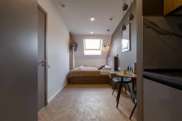 Стандартная мансардная студия, оснащенная всем необходимым для проживания.Услуги и удобства