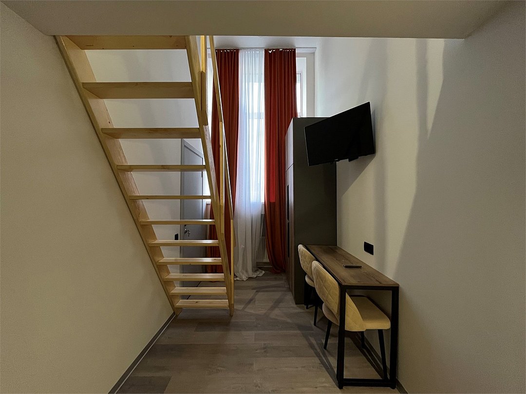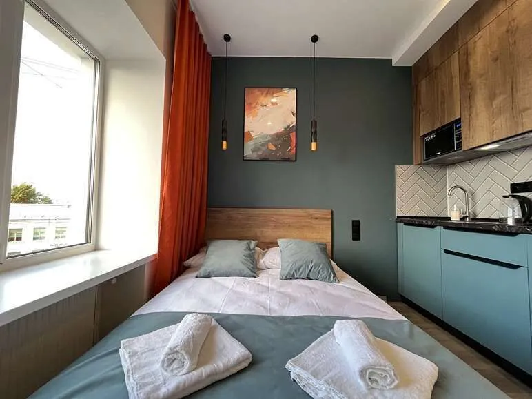 Улучшенная студия площадью от 18 м2 с двуспальной кроватью, кухонным уголком, рабочей и столовой зонами, мансардными окнамиУслуги и удобства