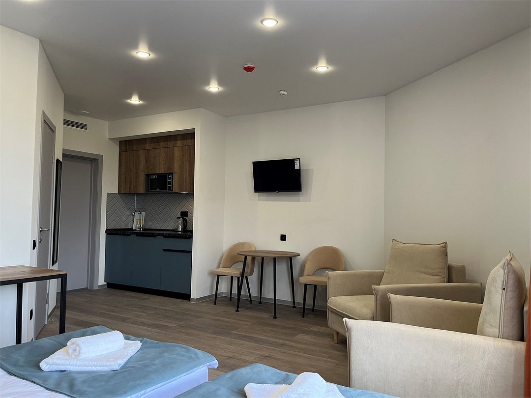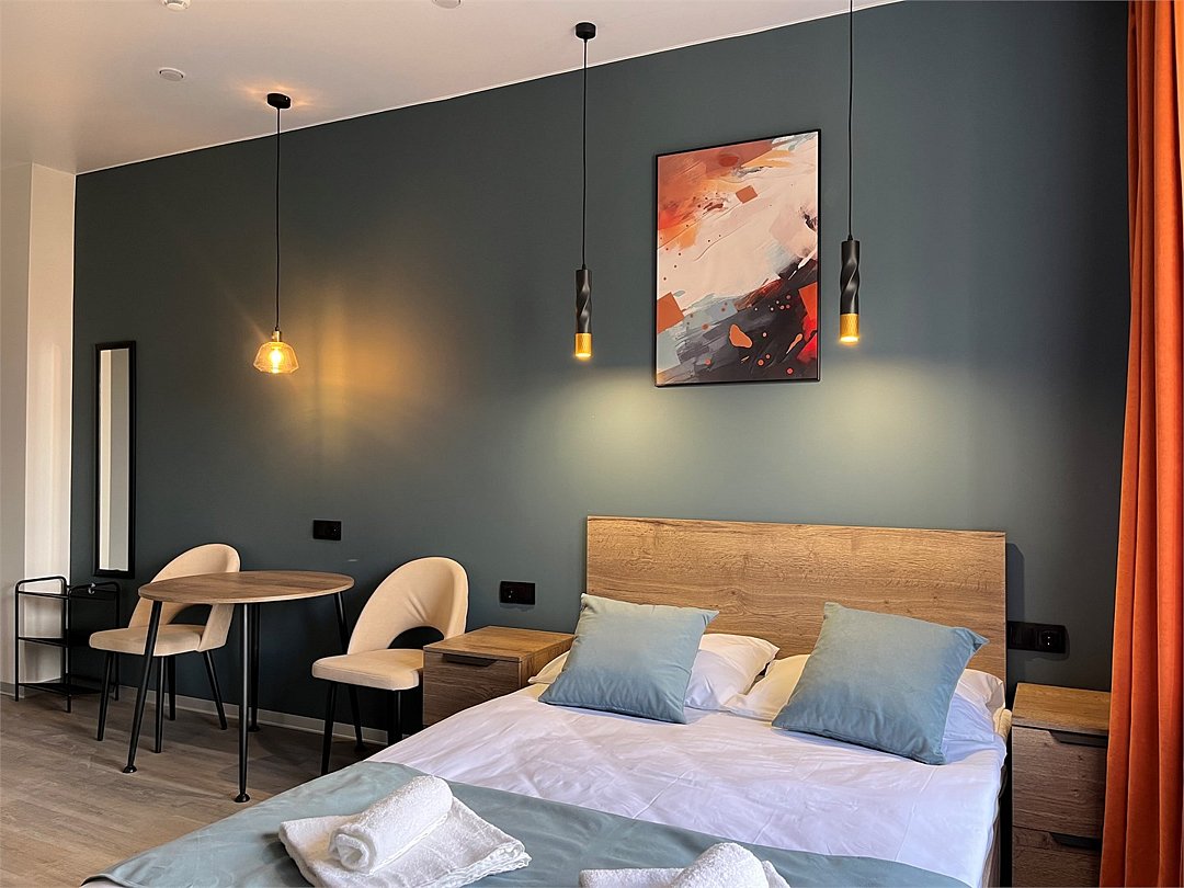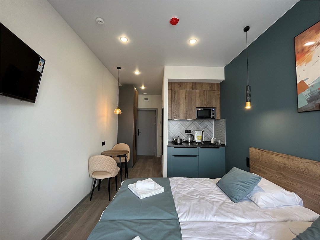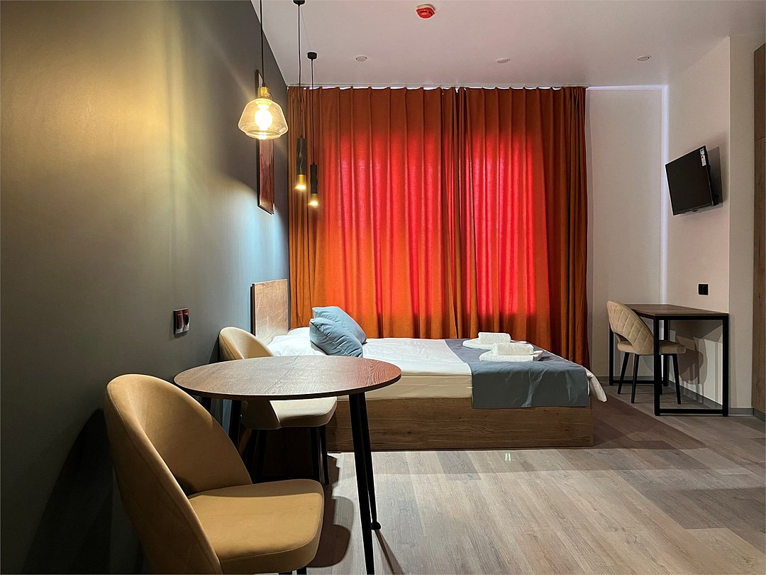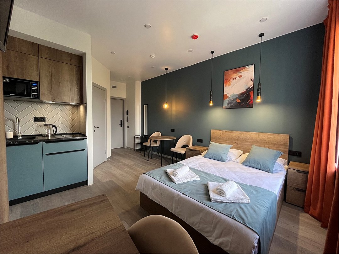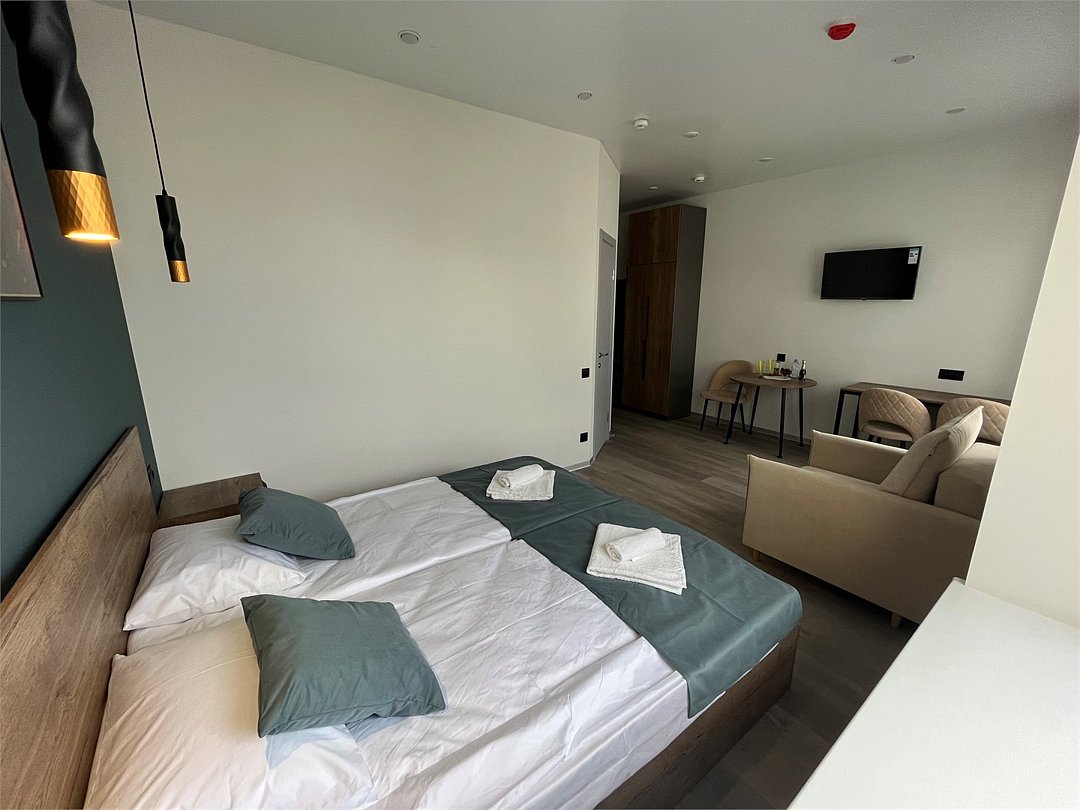 Отдохнуть после насыщенного дня туристы смогут в подготовленных уютных студиях. В них выполнен свежий современный ремонт в теплых оттенках. Имеется приятная мягкая мебель, телевидение, собственная ванная комната со средствами личной гигиены. Прилагается постельное белье, полотенца и тапочки.