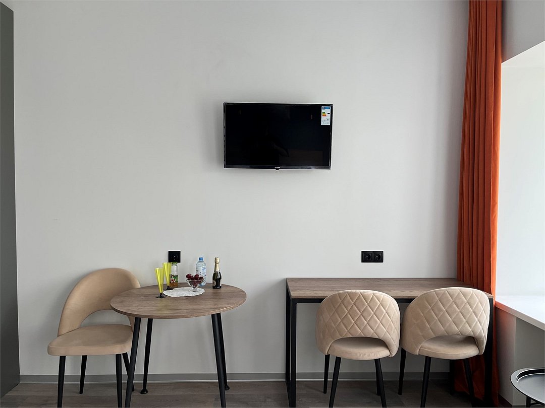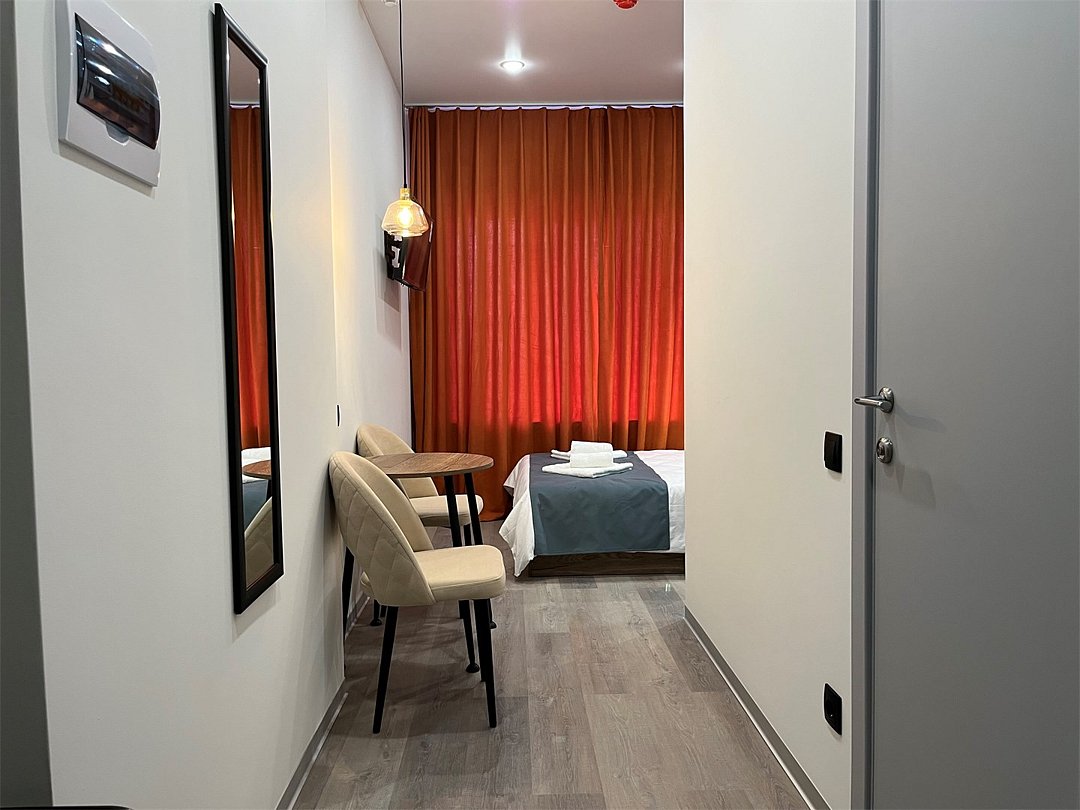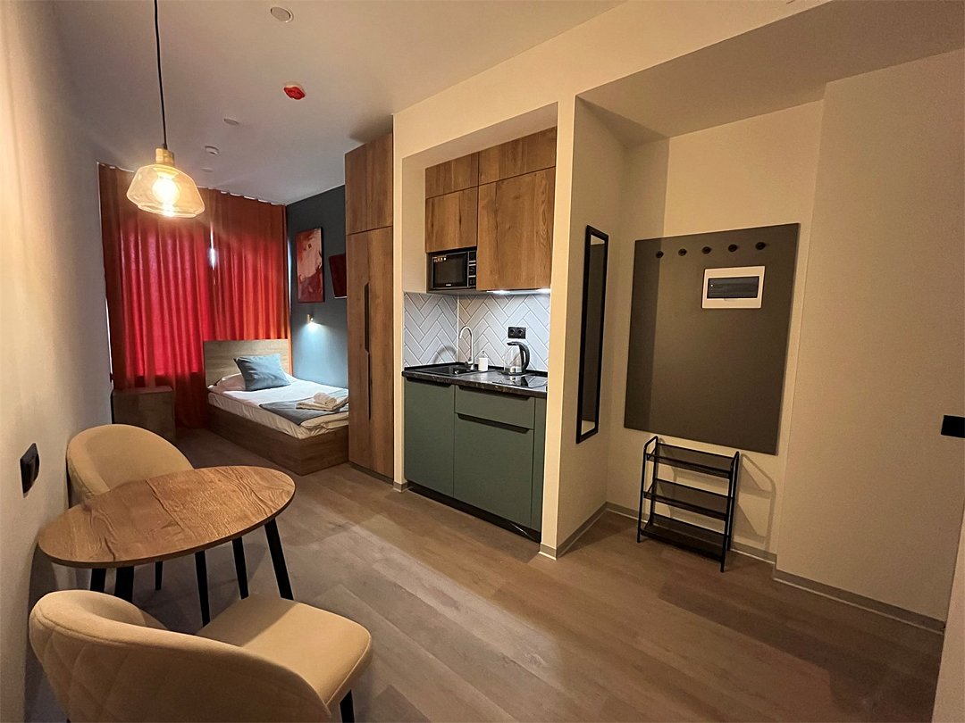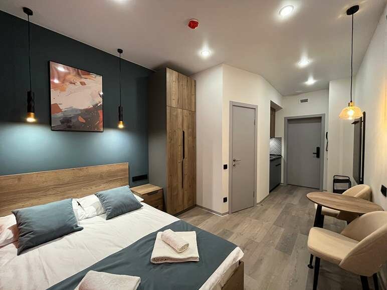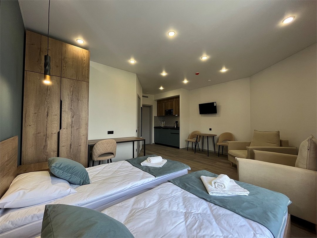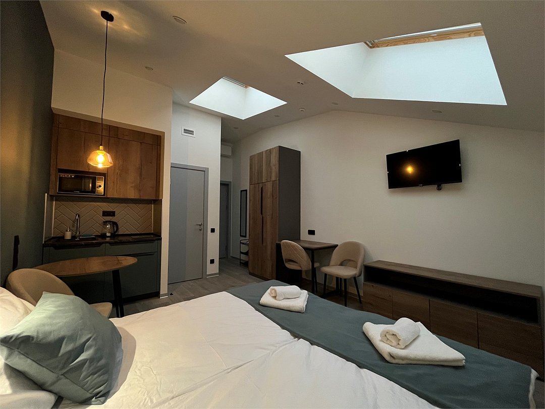 Отдохнуть после насыщенного дня туристы смогут в подготовленных уютных студиях. В них выполнен свежий современный ремонт в теплых оттенках. Имеется приятная мягкая мебель, телевидение, собственная ванная комната со средствами личной гигиены. Прилагается постельное белье, полотенца и тапочки.