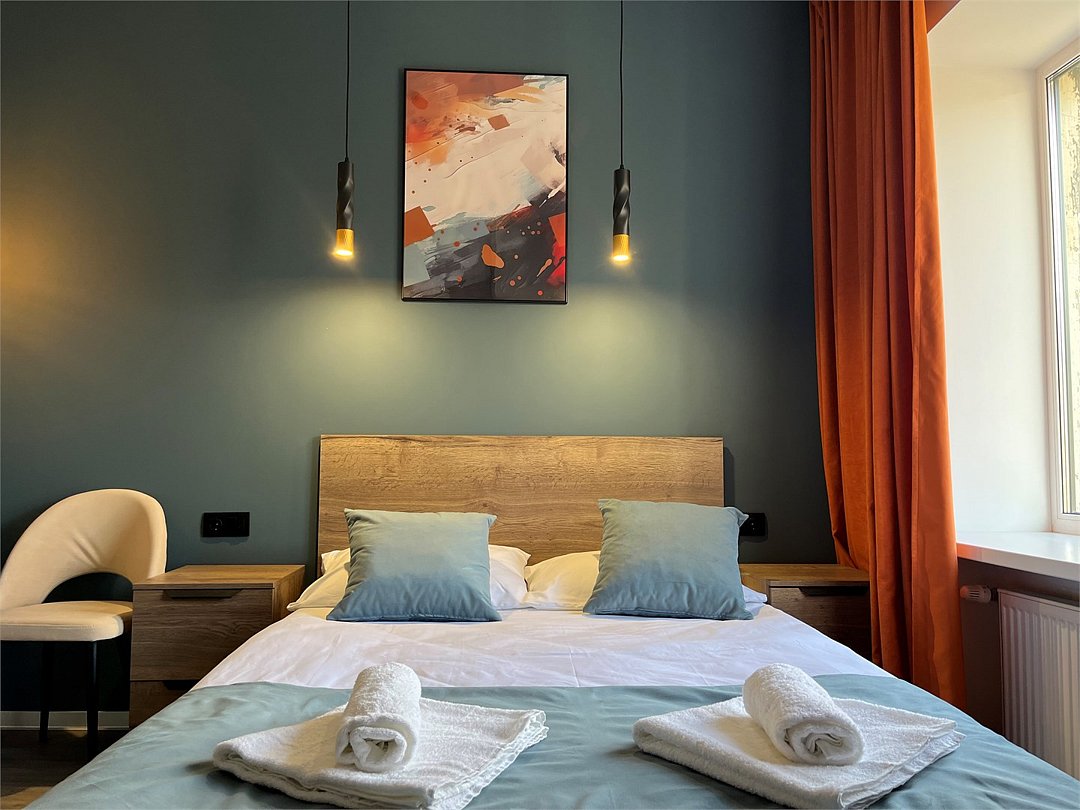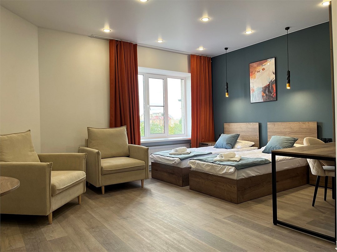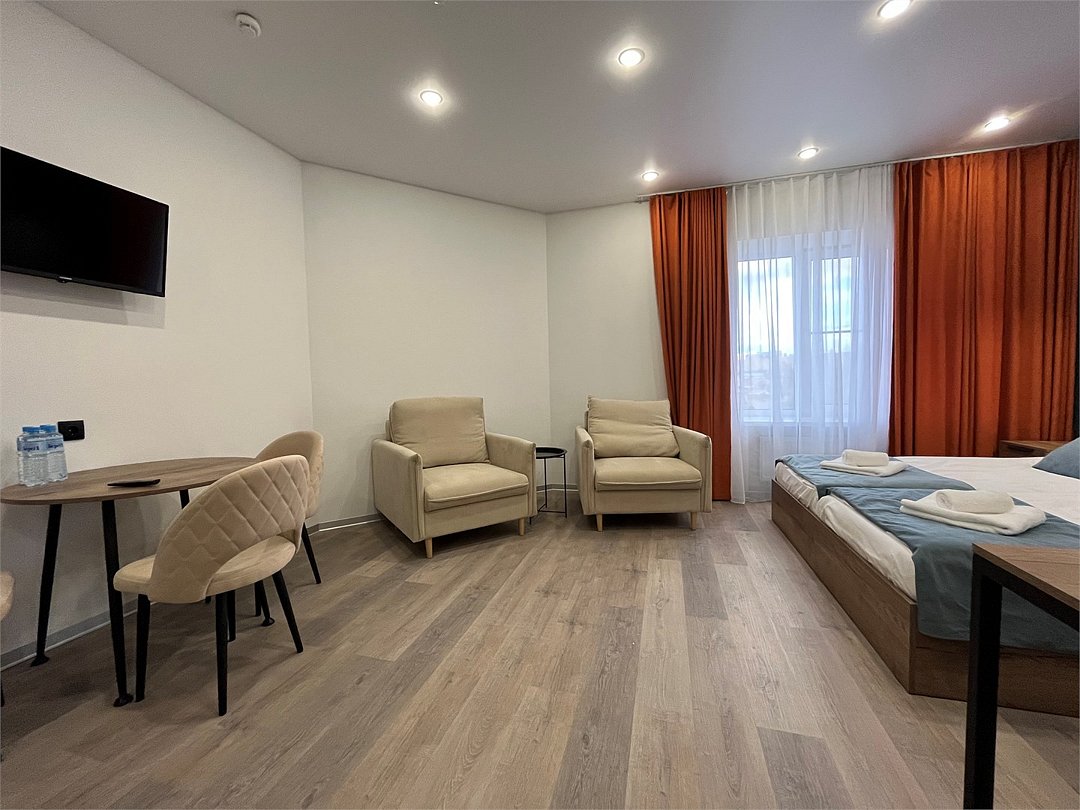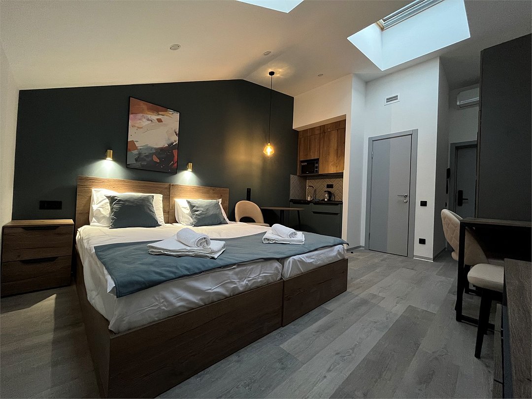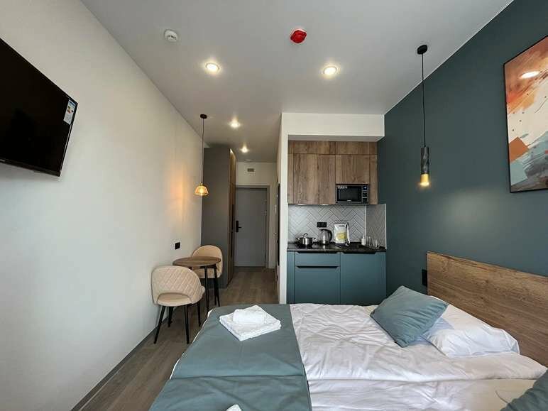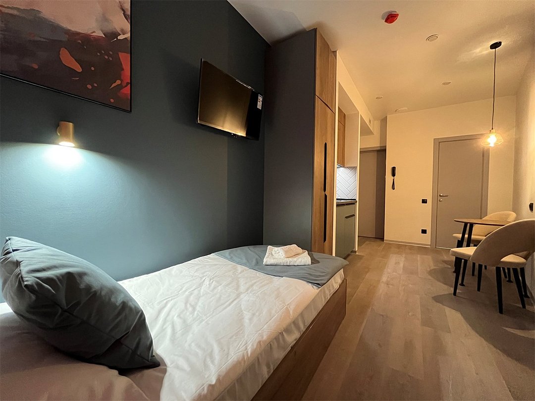 Отдохнуть после насыщенного дня туристы смогут в подготовленных уютных студиях. В них выполнен свежий современный ремонт в теплых оттенках. Имеется приятная мягкая мебель, телевидение, собственная ванная комната со средствами личной гигиены. Прилагается постельное белье, полотенца и тапочки.
