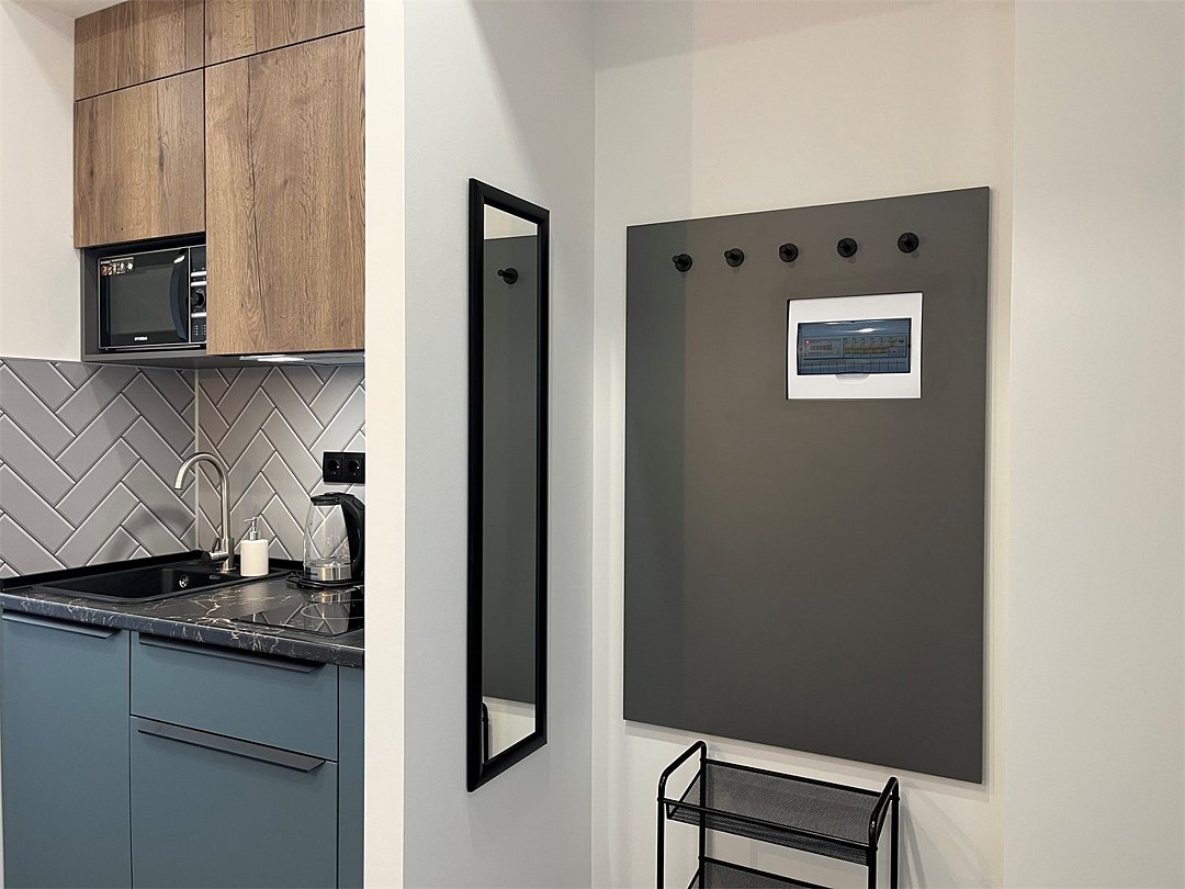 Кухня оснащена гарнитуром, варочной поверхностью, чайником и набором посуды. В округе есть многообразные заведения с вкусной едой.