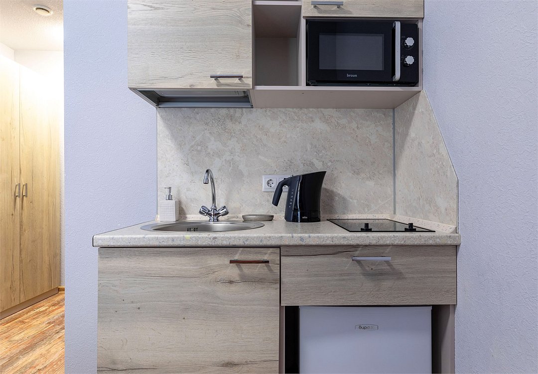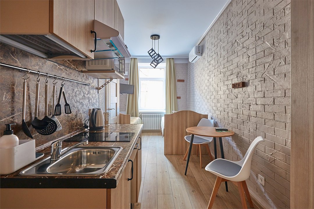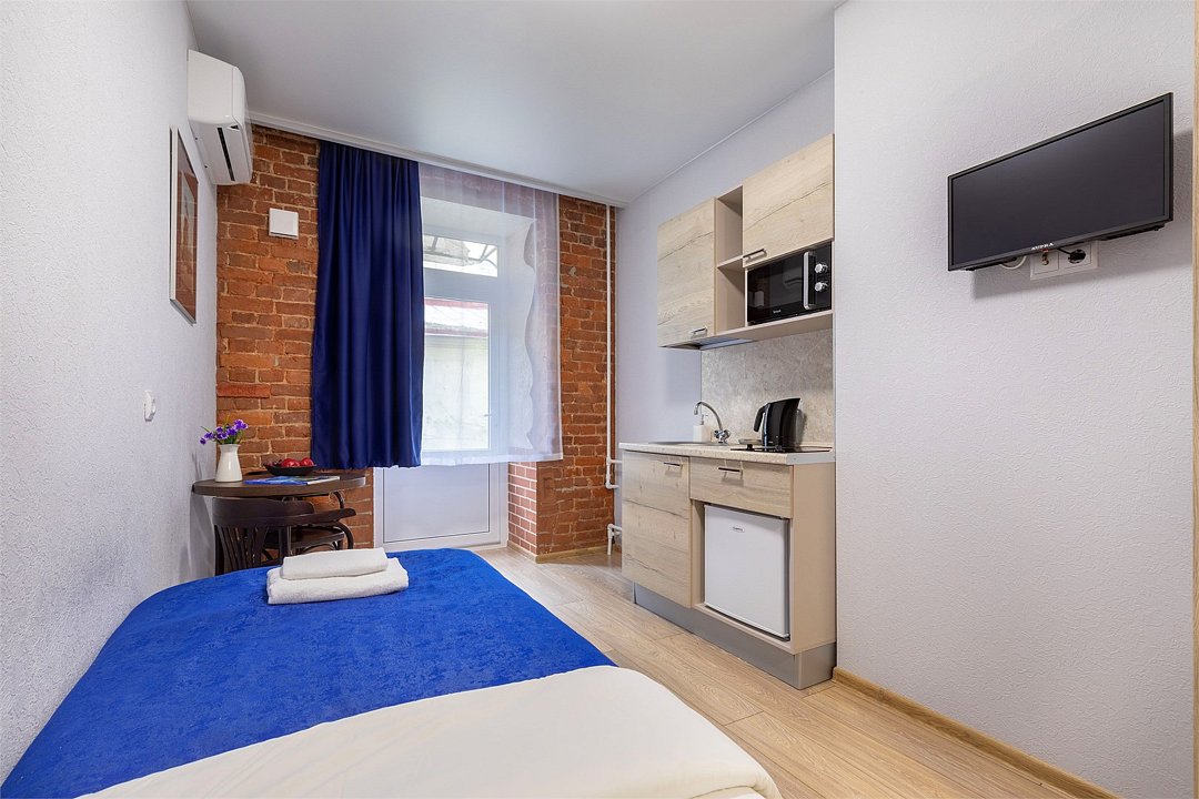 Wi-Fi, кондиционер, фен, плита для приготовления пищи, микроволновая печь, утюг, банные полотенца, односпальная кровать, гладильная доска, стулья, шкаф для одежды, вешалки, обеденный стол, зеркало, набор посуды, чайник, раковина, душ, вид во двор, кухонная посуда, стаканы, столовые приборы, туалет, сушилка для белья, телевизор с плоским экраном, мини-кухня, номер для некурящих, онлайн-регистрация до заездаВ студии