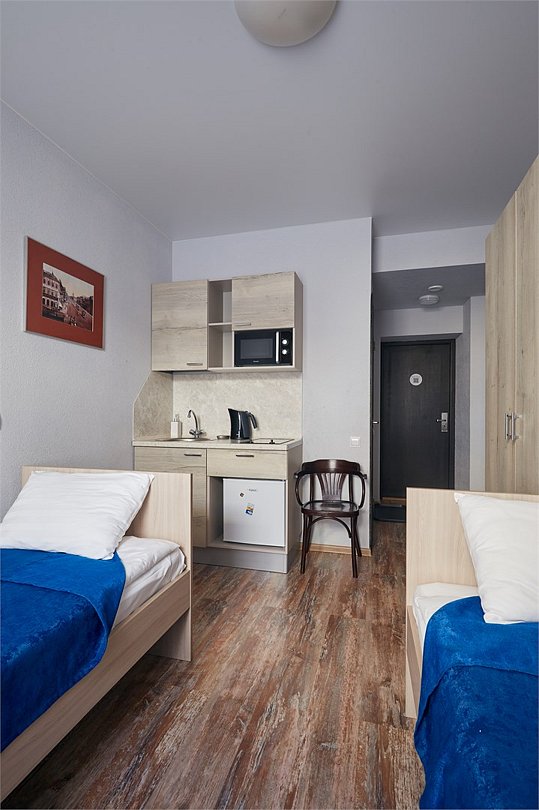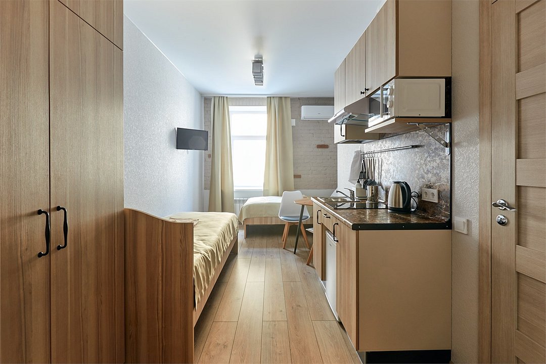 Студия с двумя раздельными кроватями, полностью оборудованная для проживания по адресу Суворовский проспект, 65, литера БУслуги и удобства