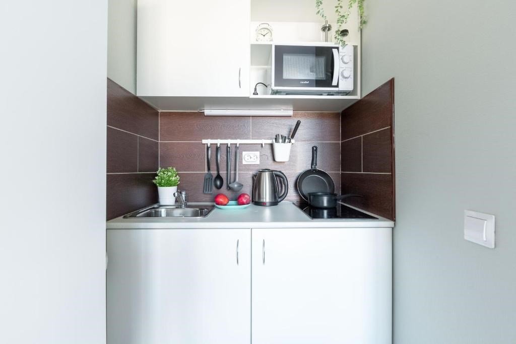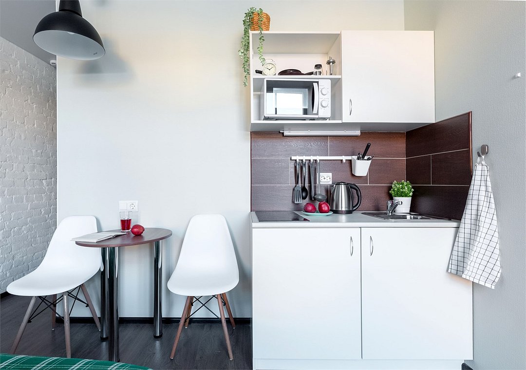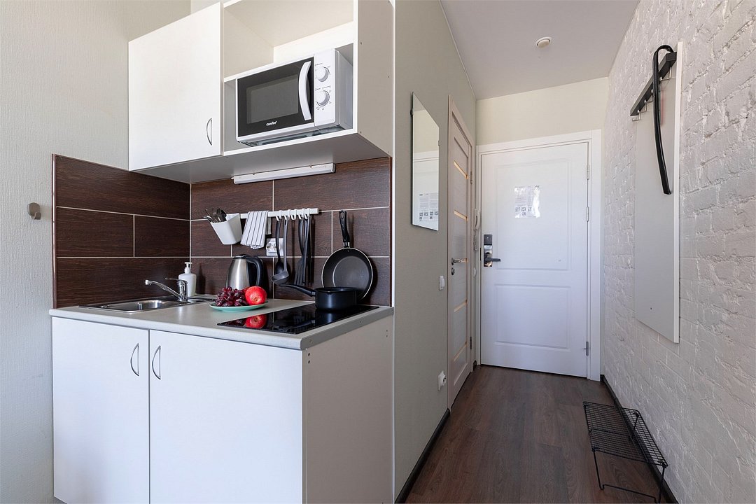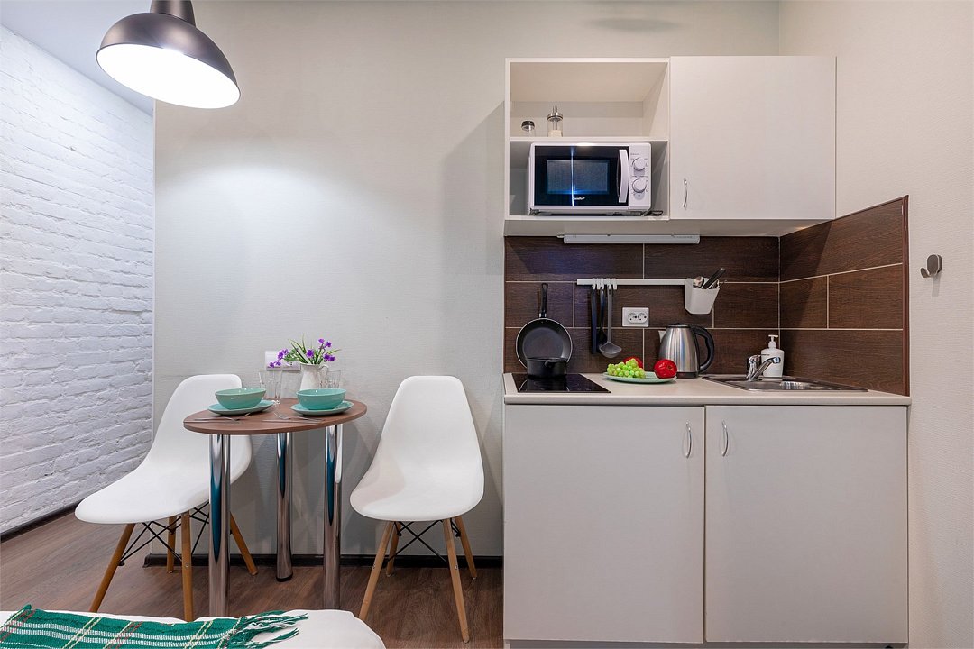 Все 38 меблированных апартаментов представляют собой комфортные студии с индивидуальным дизайном. Светлый и уютный интерьер апартаментов располагает к отдыху после деловых встреч и культурных прогулок. К услугам гостей предоставляются беспроводной интернет Wi-Fi, телевизор, собственная ванная комната с душем, фен, а также мини-кухня с микроволновой печью, холодильником и плитой, посудой и столовыми приборами.