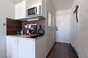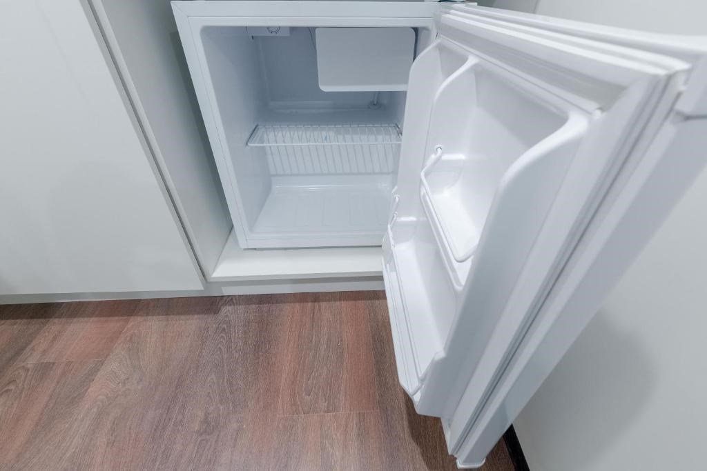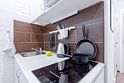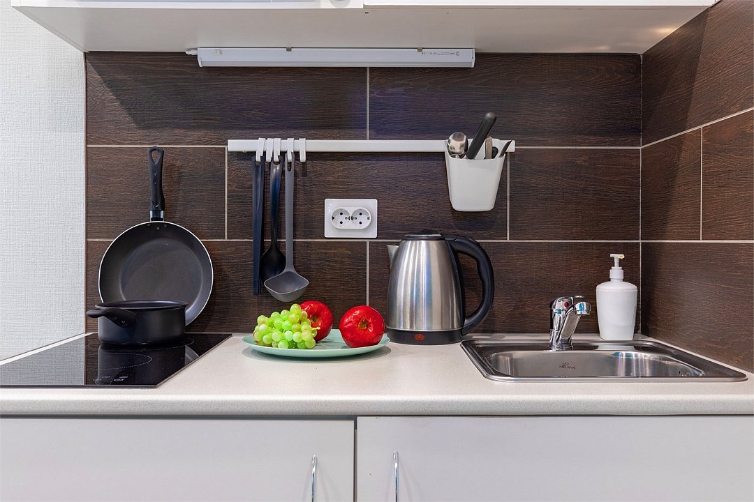 - мини-кухня с холодильником, набором посуды, микроволновкой, чайником и плитой. Наличие этой мини-кухни большой плюс (можно готовить или разогреть купленное), вот только есть и минусы. И один из них, это пластиковая кухонная утварь (половник/ложка/лопатка/щипцы, разделочные доски), которая хорошо впитывает запах и отмыть её порой бывает проблематично. Лопатку и половник отмыть получилось, а вот запах у разделочных досок не исчезал даже после неоднократного мытья, так что я просто убрал их в шкаф. Возможно это мне только так повезло.