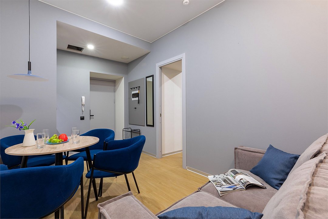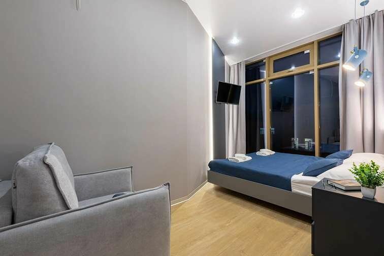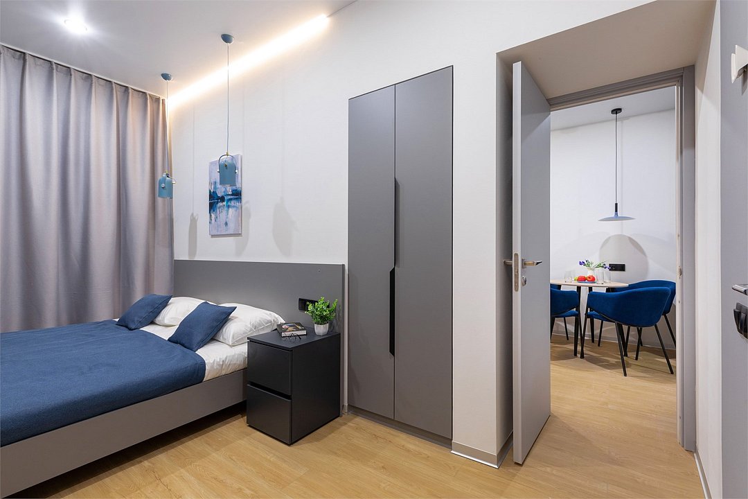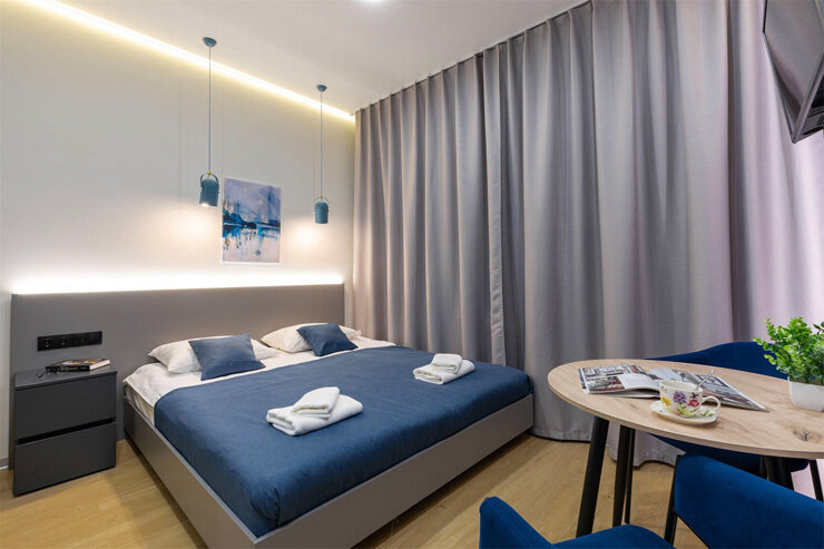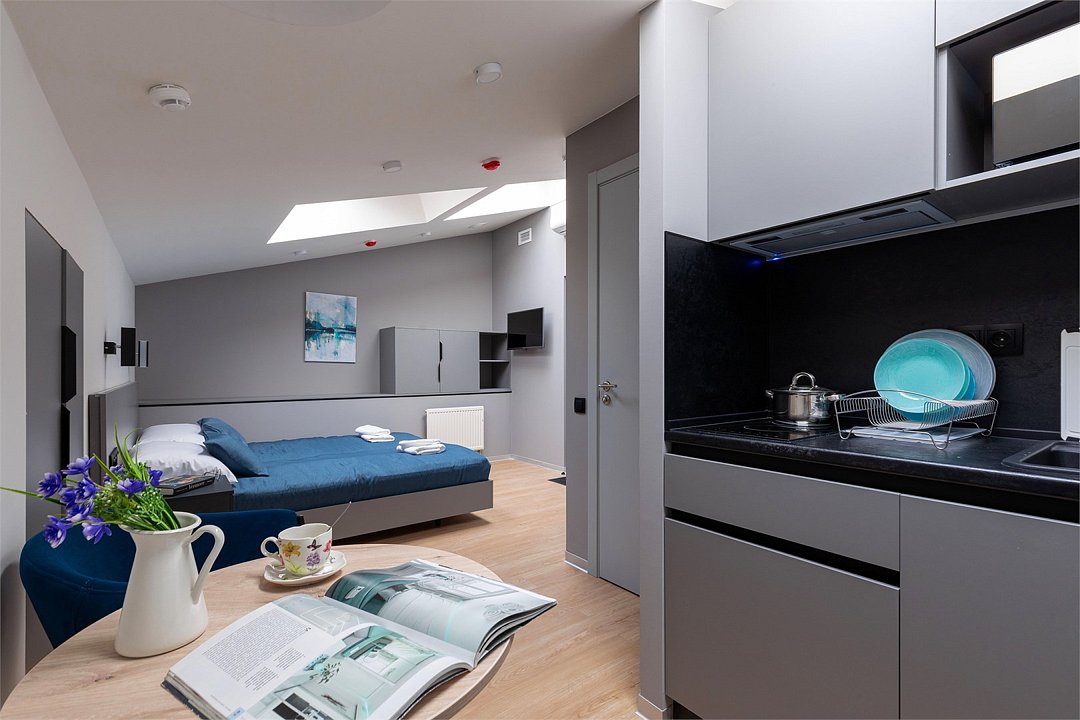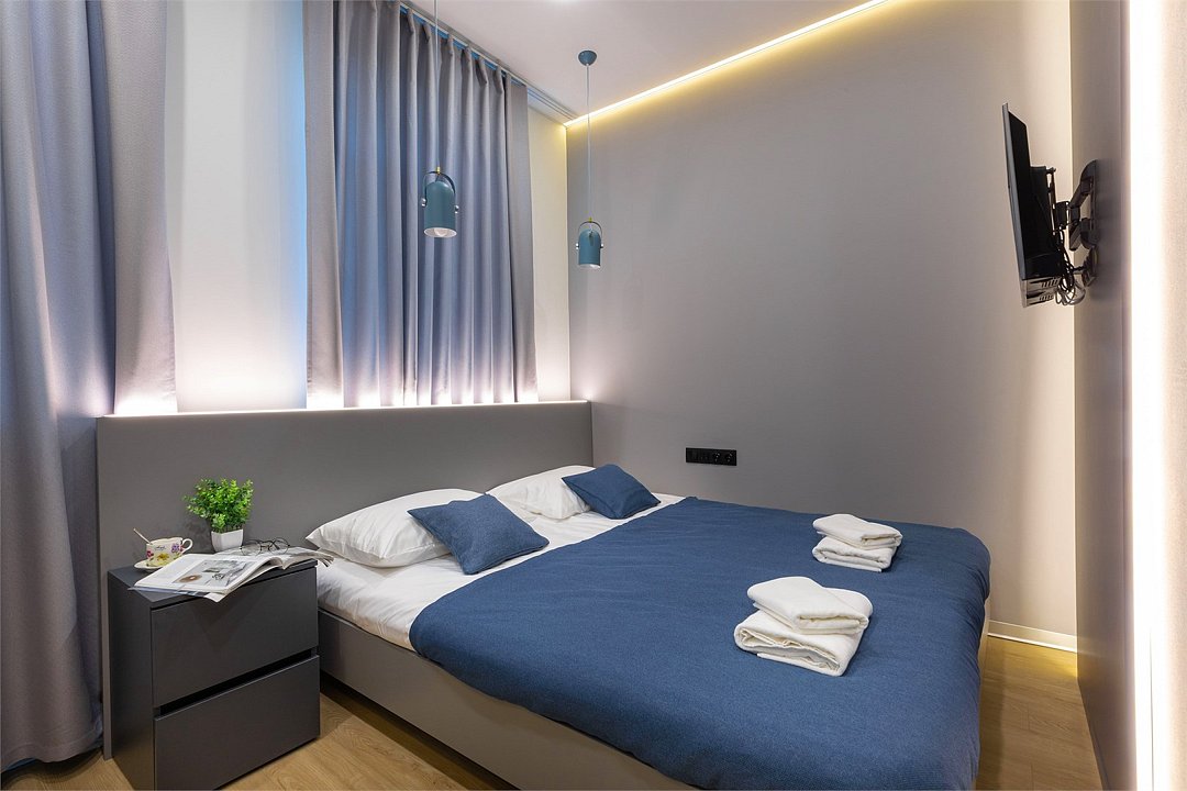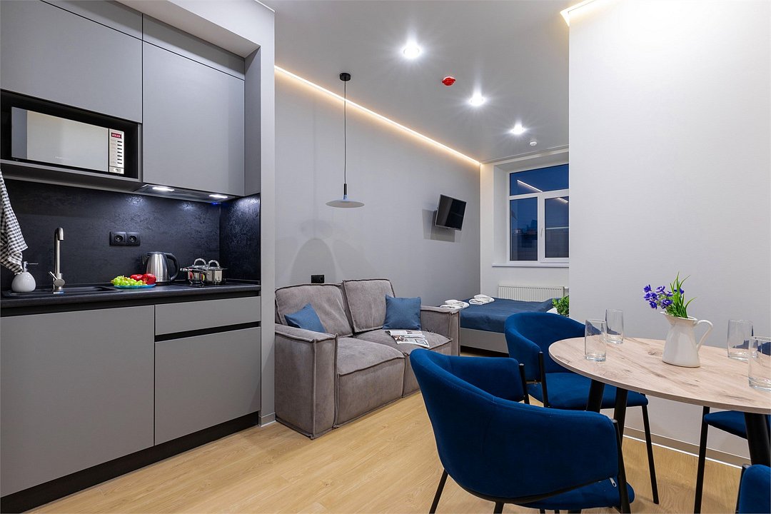 Апартаменты разного уровня вместимости и комфорта имеют современное оснащение, располагаются на 1 этаже 5-этажного здания. В комнатах установлена удобная кровать, шкаф для хранения одежды, телевизор, кондиционер, работает Wi-Fi. Санузел с ванной или душем, есть фен и туалетно-косметические принадлежности. Кухонная зона оснащена электрической плитой, холодильником, микроволновой печью, электрическим чайником, набором посуды и столовых приборов.