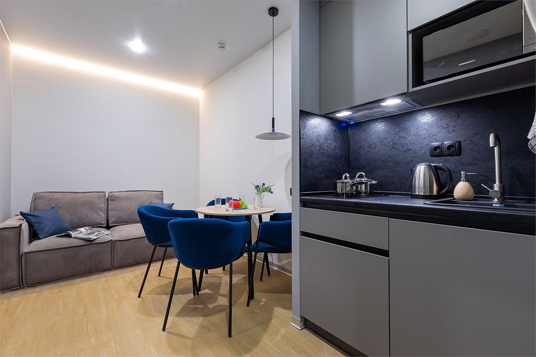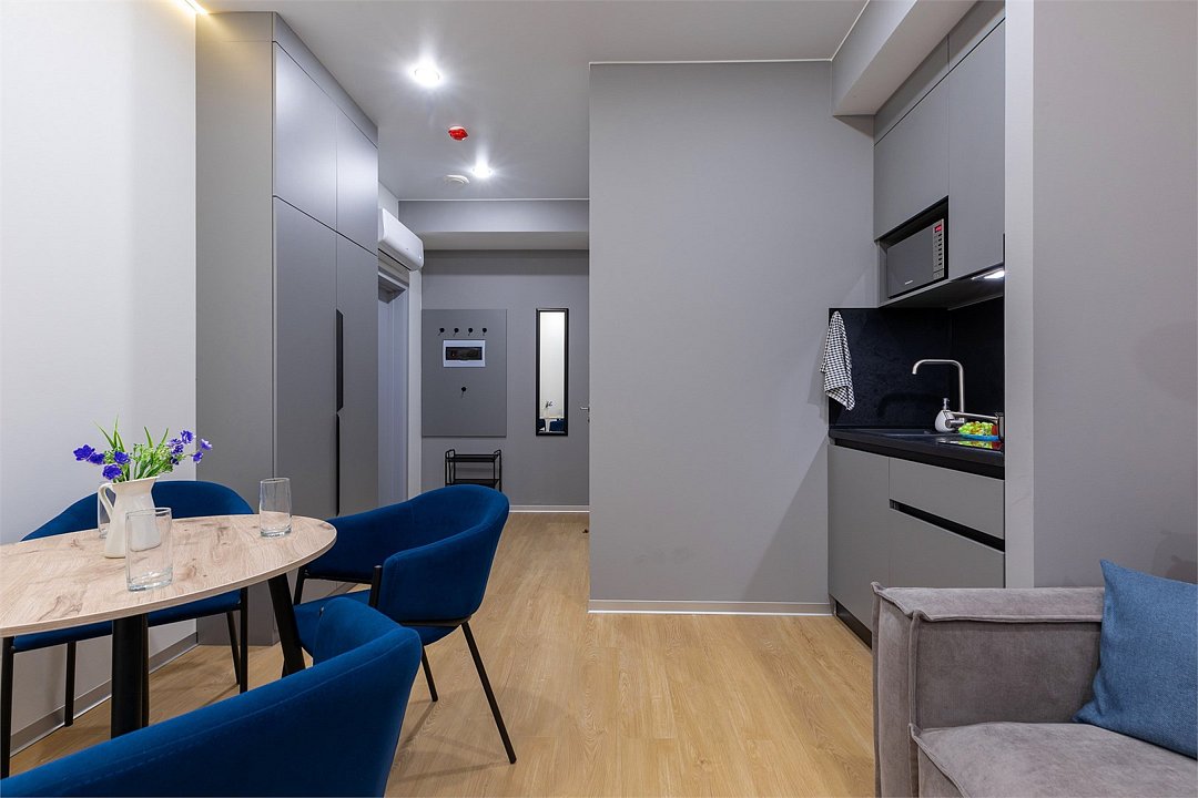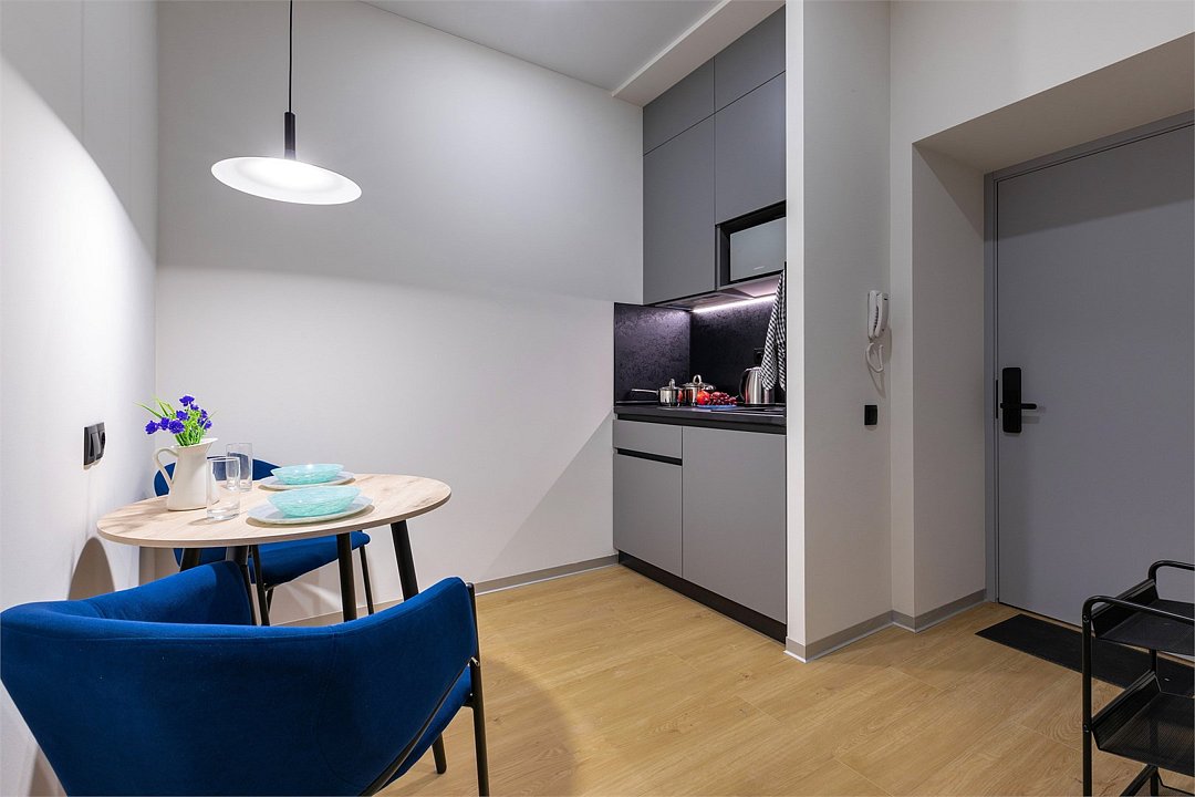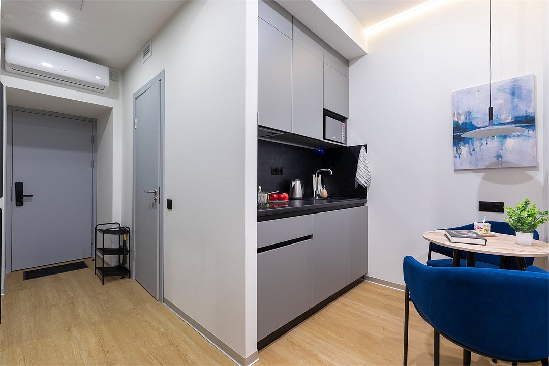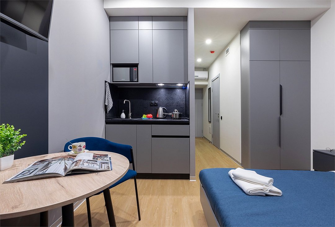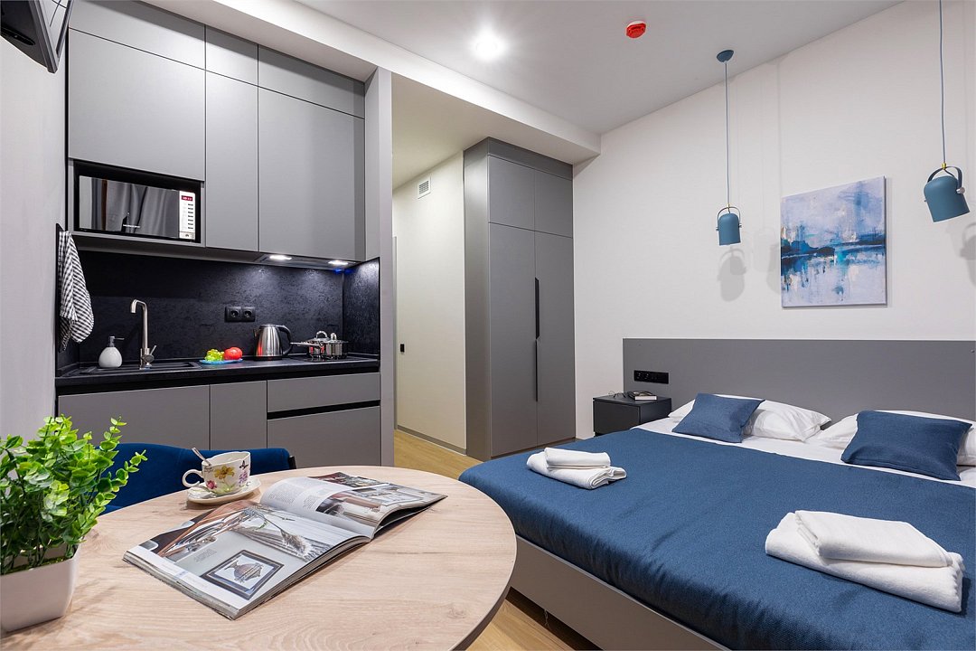 Одноместный номер с кроватью, с кухонным уголком и многофункциональной столовой зоной.Услуги и удобства