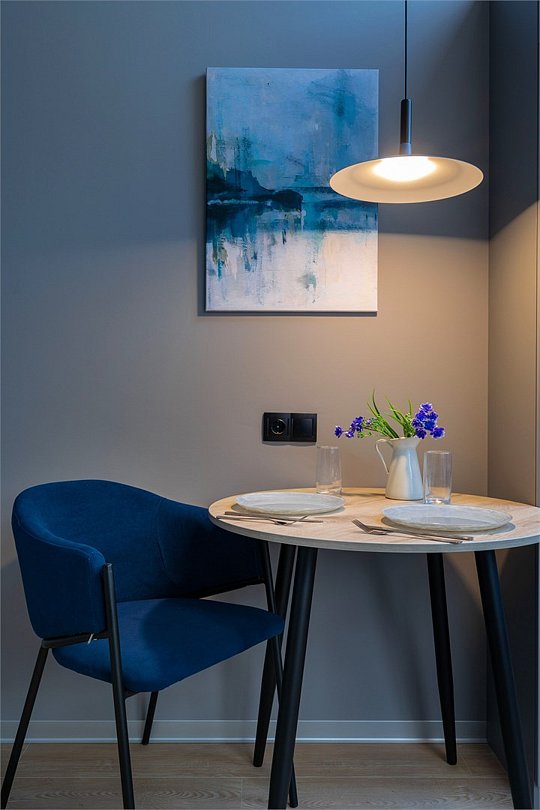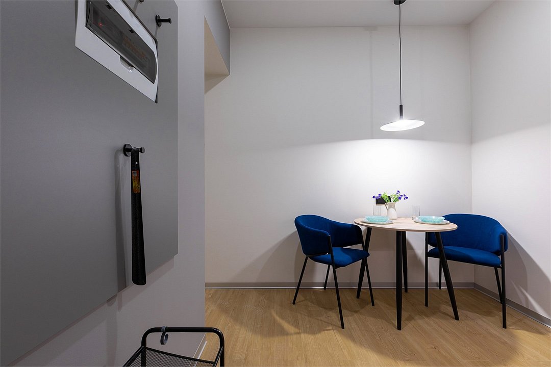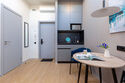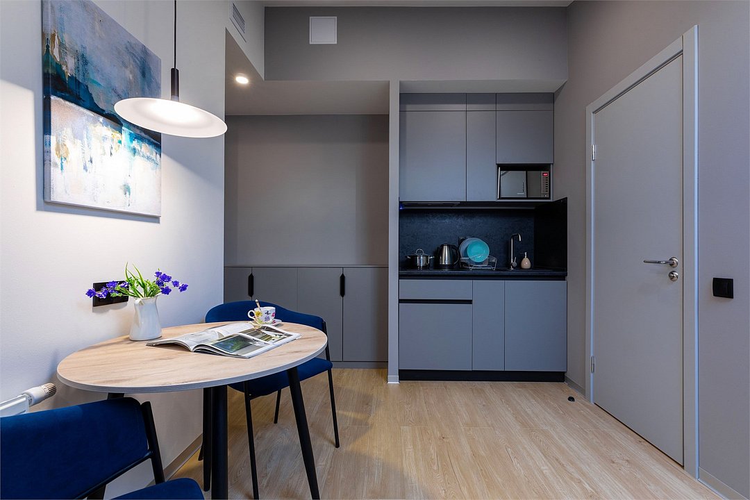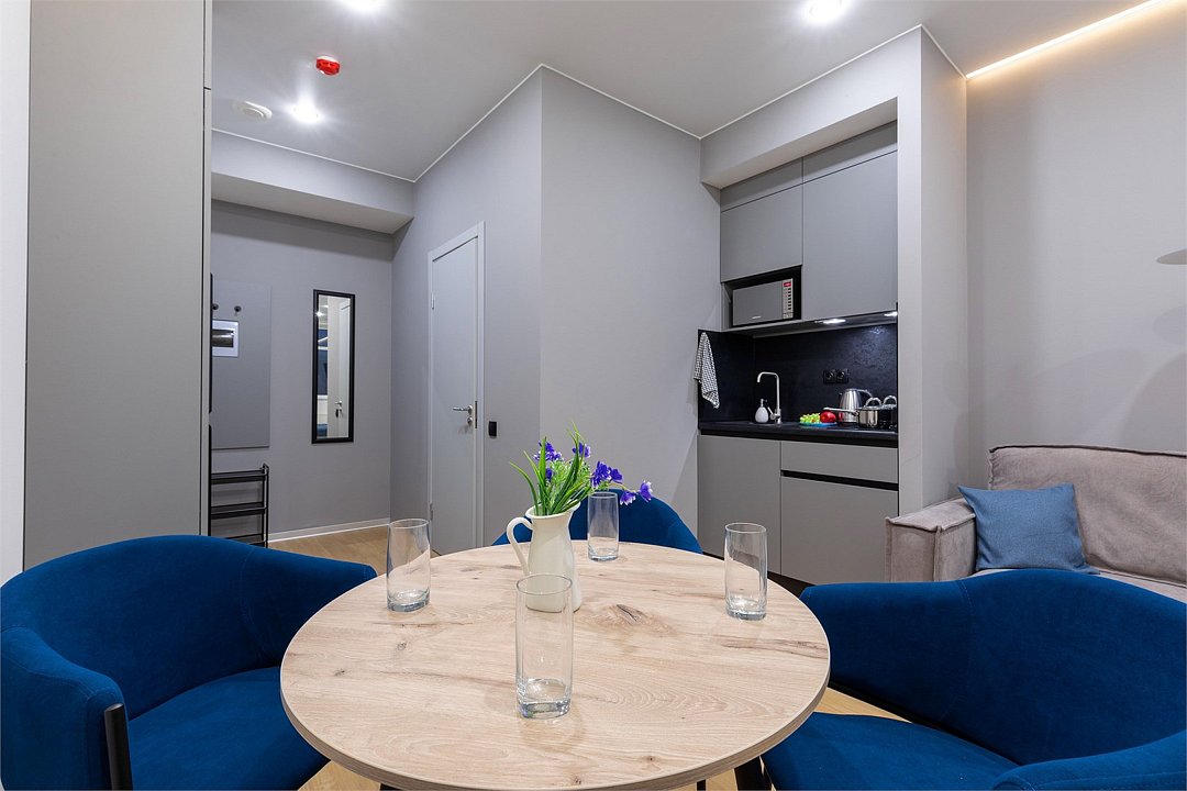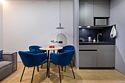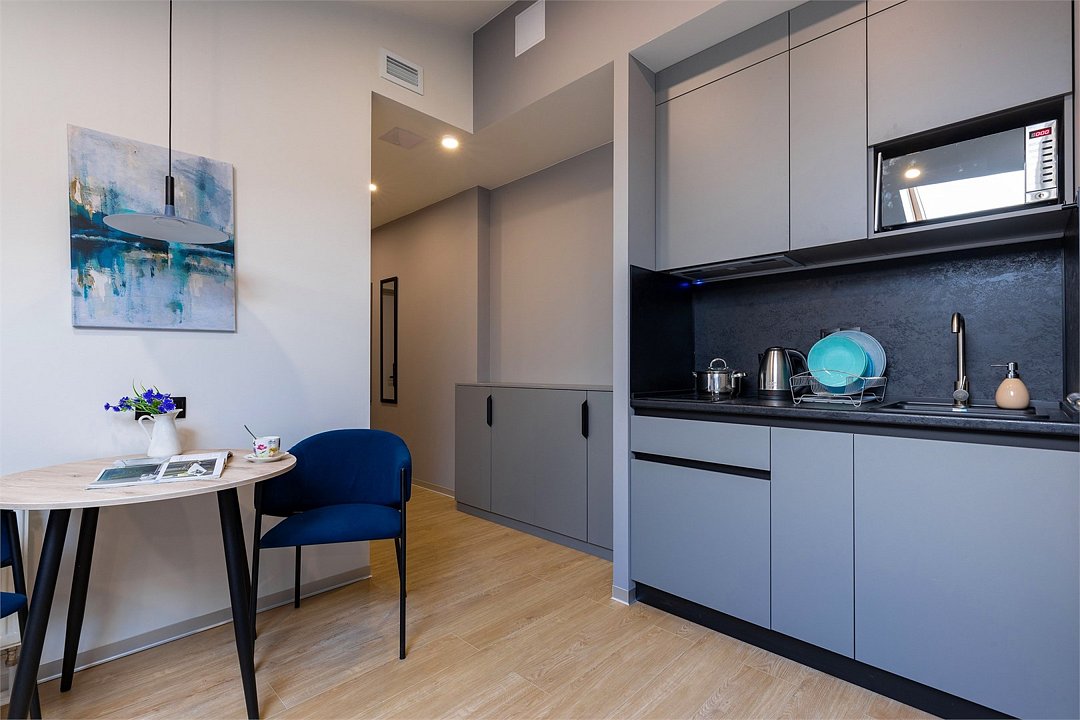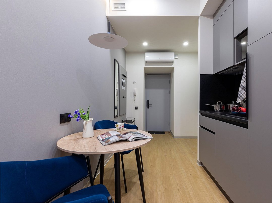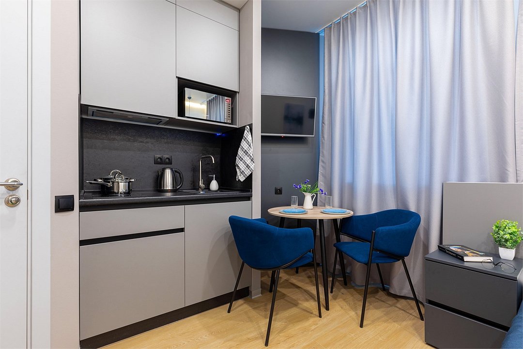 Одноместный номер с кроватью, с кухонным уголком и многофункциональной столовой зоной.Услуги и удобства