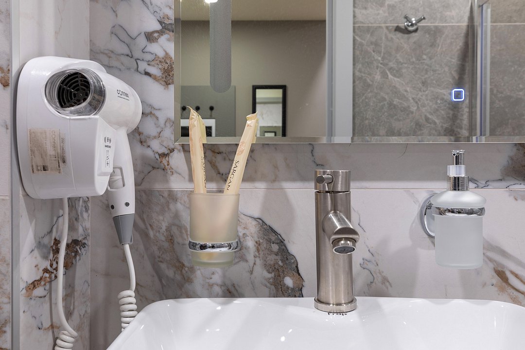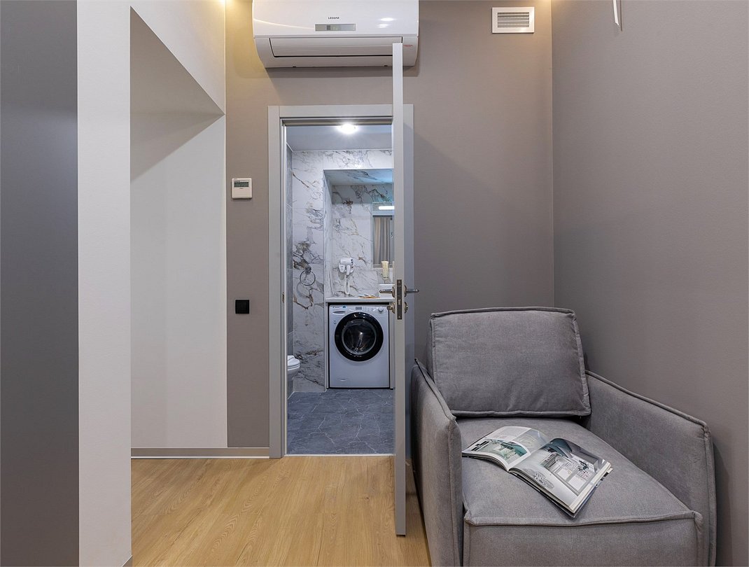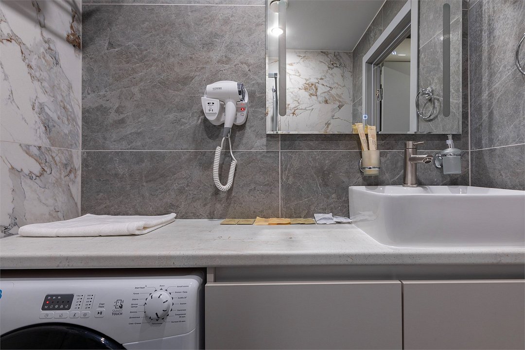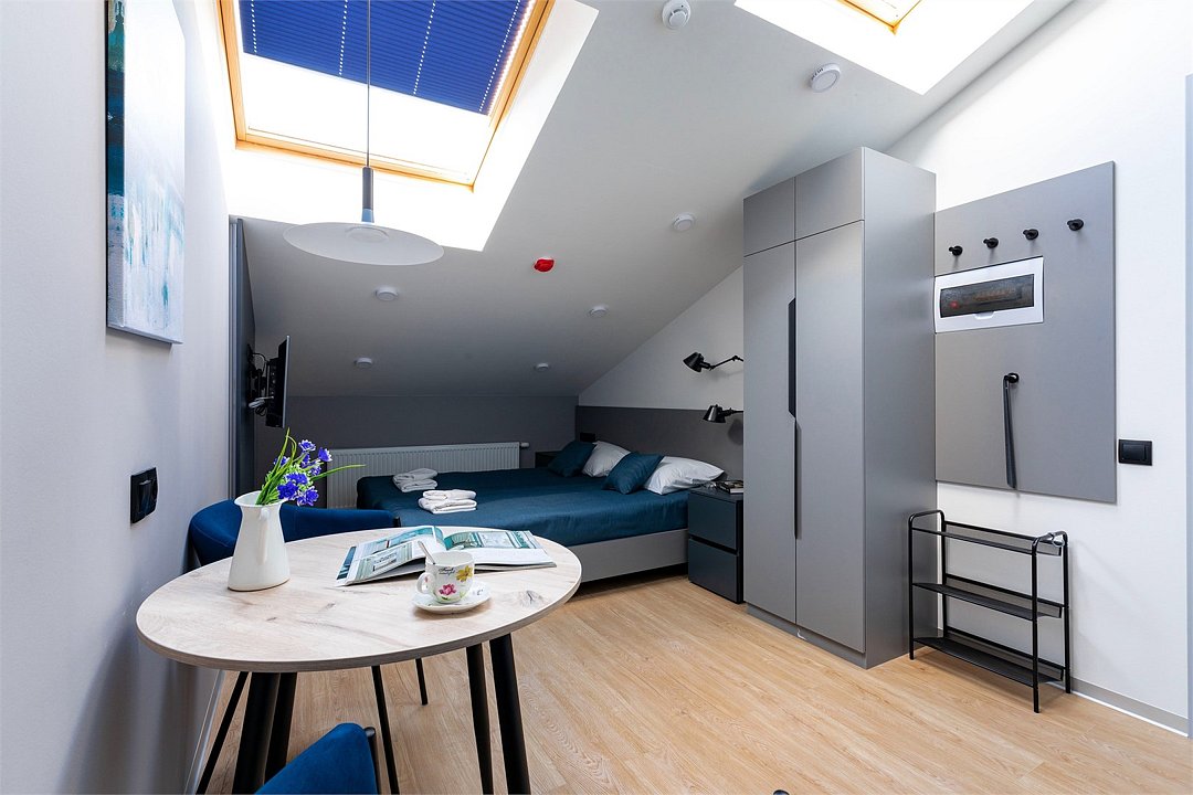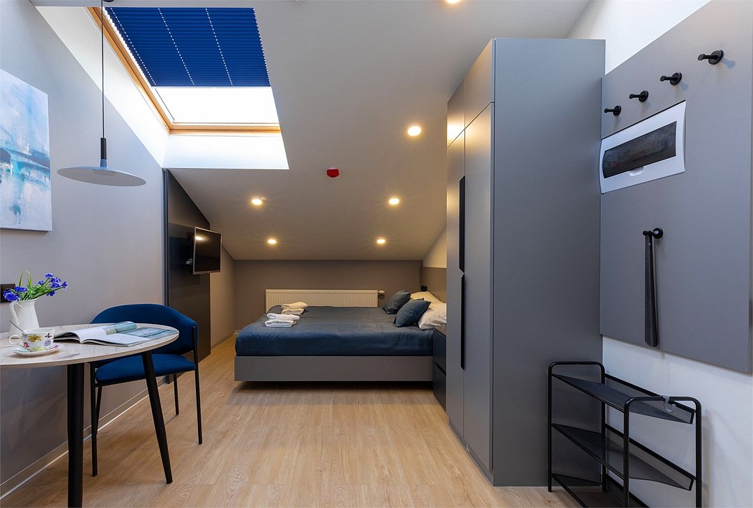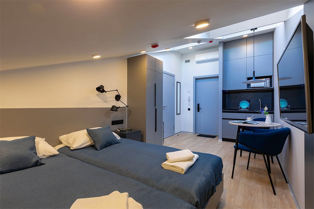Wi-Fi, кондиционер, фен, электронные замки, плита для приготовления пищи, микроволновая печь, утюг, обогреватель, ванная комната, водонагреватель, халаты, банные полотенца, тапочки, гигиенические средства, косметические средства, две односпальные или большая двуспальная кровать, гладильная доска, стулья, шкаф для одежды, вешалки, зеркало, набор посуды, информационная карта, меню, сейф, стиральная машина, чайник, унитаз, раковина, косметическое зеркало, питьевая вода, обеденная зона, отопление, душ, кресло, ламинат, кухонная посуда, стаканы, кухонная утварь, столовые приборы, стол, туалетные средства, туалет, сплит-система, сушилка для белья, внутренний телефон, телевизор с плоским экраном, мини-холодильник, мини-кухня, кухонный уголок, мансардные окна, номер для некурящих, электронный консьерж 24/7, кресло-кровать, можно с питомцамиВ аппартаментах