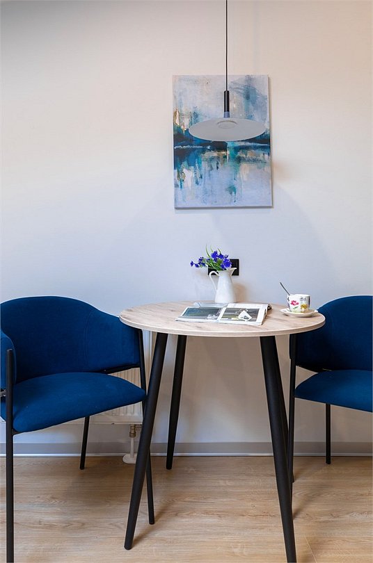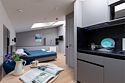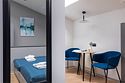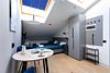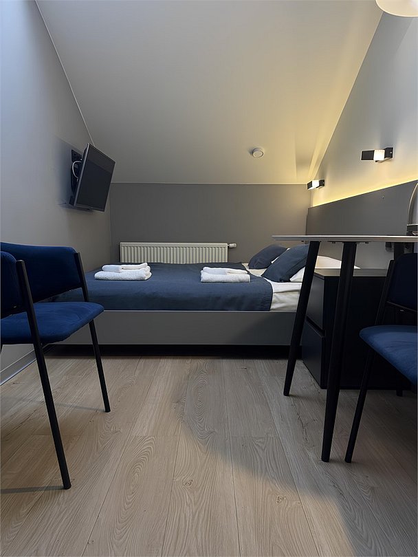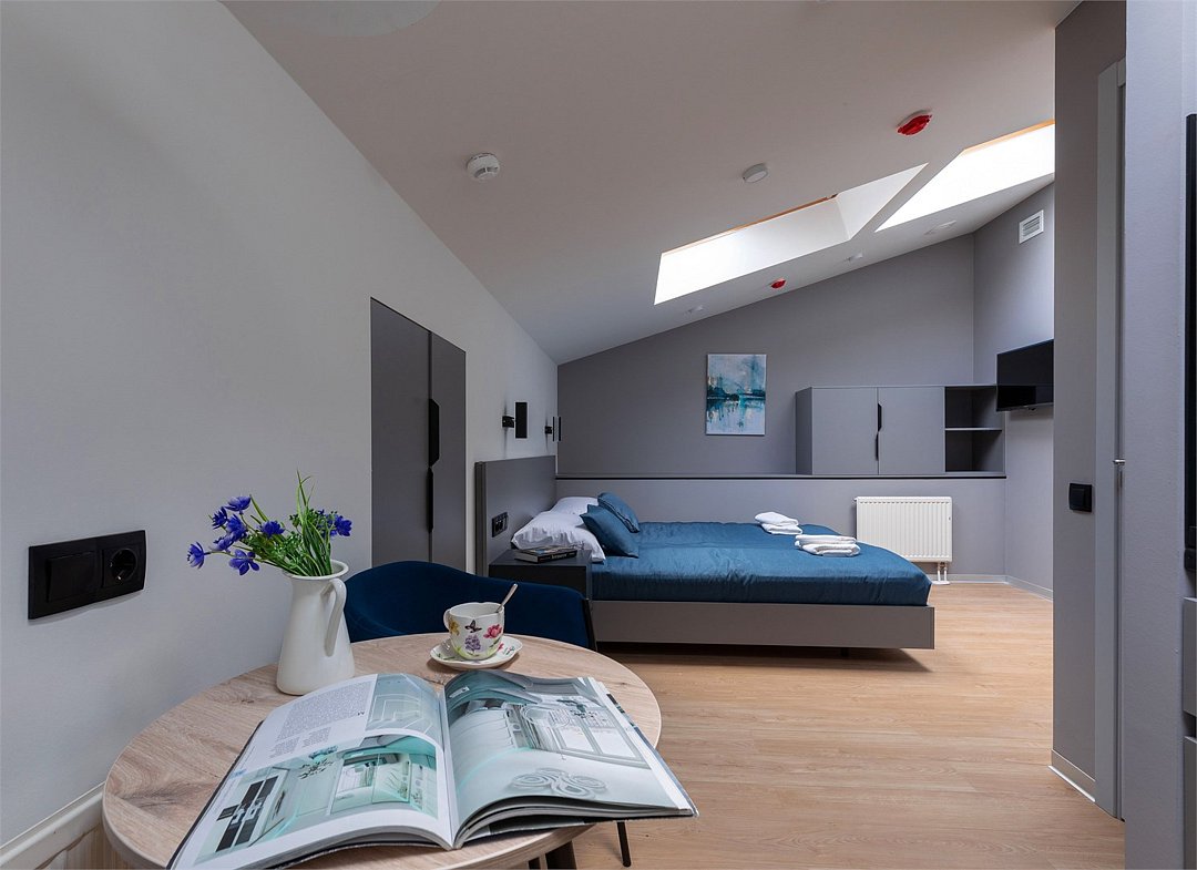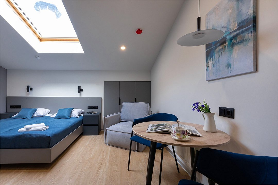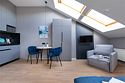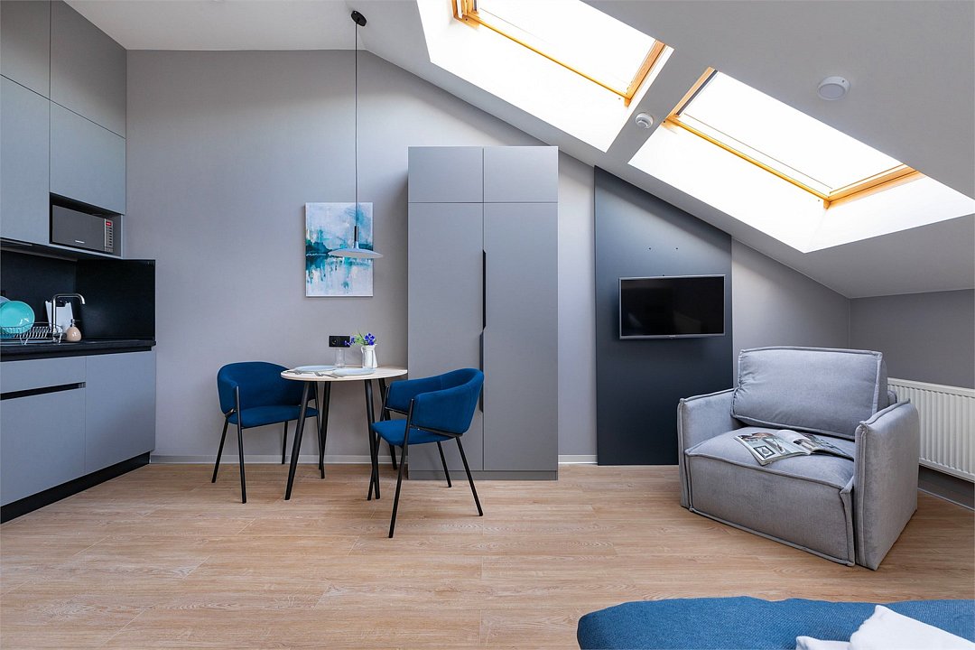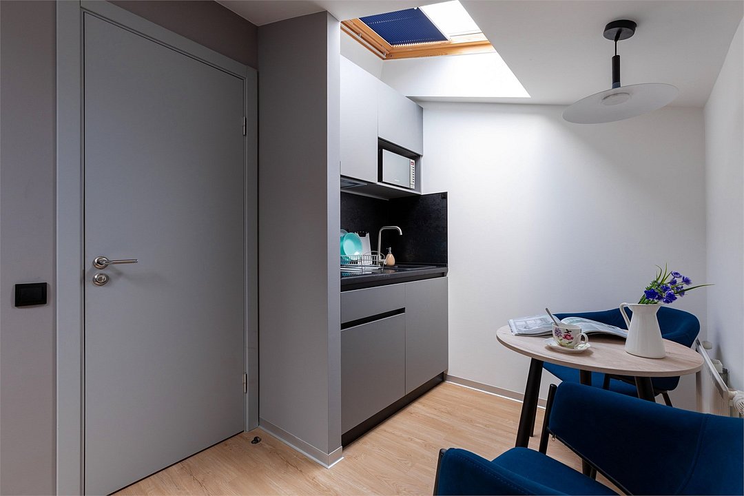 Одноместный мансардный номер с кроватью, с кухонным уголком и многофункциональной столовой зоной.Услуги и удобства