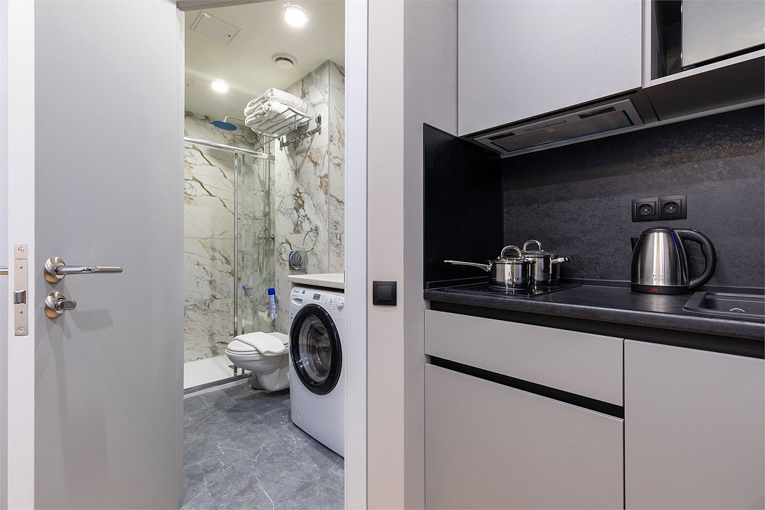Wi-Fi, кондиционер, фен, электронные замки, плита для приготовления пищи, микроволновая печь, утюг, обогреватель, ванная комната, водонагреватель, халаты, банные полотенца, тапочки, косметические средства, двуспальная кровать, гладильная доска, стулья, шкаф для одежды, вешалки, зеркало, набор посуды, информационная карта, меню, сейф, стиральная машина, чайник, унитаз, раковина, косметическое зеркало, питьевая вода, обеденная зона, отопление, душ, вид на город, вид во двор, ламинат, кухонная посуда, стаканы, кухонная утварь, столовые приборы, стол, туалетные средства, туалет, сплит-система, сушилка для белья, внутренний телефон, телевизор с плоским экраном, мини-холодильник, мини-кухня, кухонный уголок, номер для некурящих, электронный консьерж 24/7, можно с питомцамиВ аппартаментах