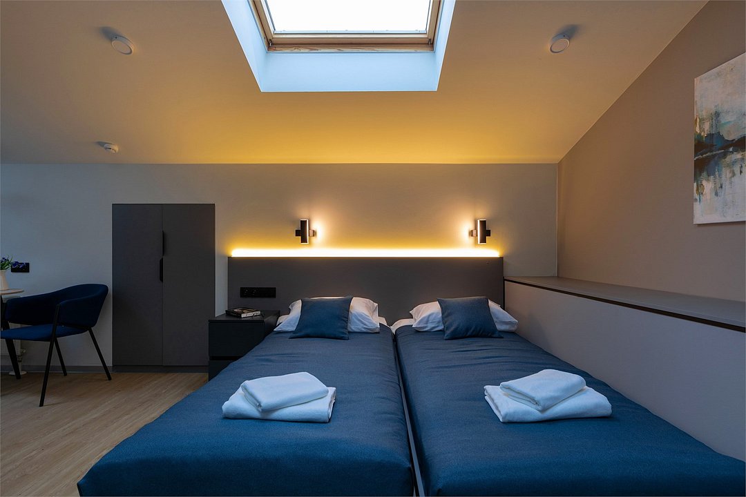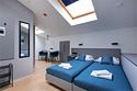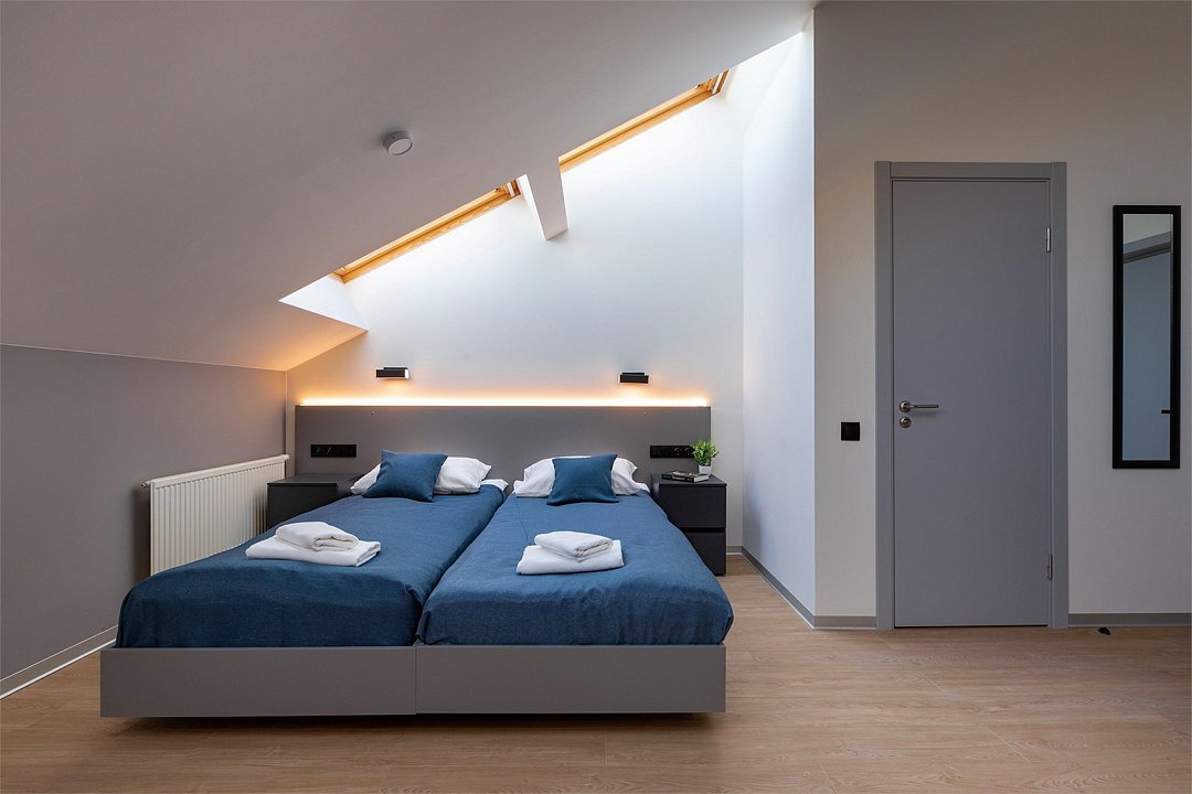 Просторная студия с мансардными окнами и 2 односпальными кроватями.Услуги и удобства