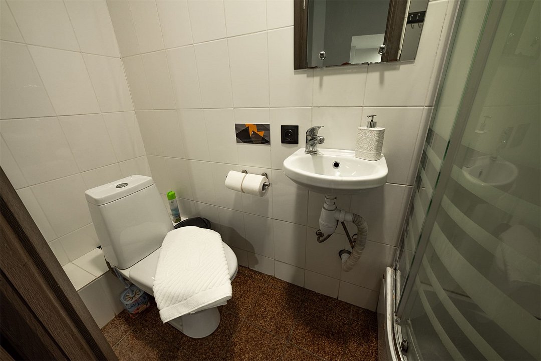 Площадь - от 20м2 до 28м2 Двухместные номера расположены на 1 или 2 этаже с видом на тихий двор, оборудованы всем необходимым для комфортного проживания: двуспальной кроватью с пружинным матрасом, диван-кроватью, постельным бельем, по 2 полотенца на каждого гостя, телевизором с ТВ-приставкой. В номерах собственная ванная комната: душ, раковина, туалет, фен. В общем доступе: кухня с обеденной зоной (микроволновка, мультиварка, электрический чайник, холодильник, посуда, столовые приборы), стиральная машина, утюг и гладильные принадлежности. На всей территории работает высокоскоростной бесплатный Wi-Fi. Заселение происходит дистанционно, с помощью заранее отправленной инструкции. Дополнительно можно приобрести на ресепшен: - зубной набор - бритвенный - косметический - шапочку для душа - беруши - тапочкиУслуги и удобства