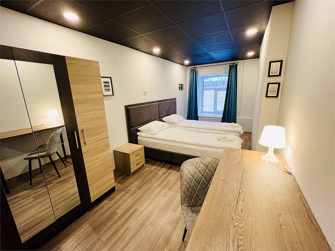 Площадь - от 14м2 до 22м2 Двухместные номера расположены на 1 и 2 этаже с видом на тихий двор, оборудованы всем необходимым для комфортного проживания: двумя односпальными кроватями с пружинным матрасом, комодом или шкафом, постельным бельем, по 2 полотенца на каждого гостя, телевизором с ТВ-приставкой. В общем доступе: 10 душевых и 11 туалетов, кухня с обеденной зоной (микроволновка, мультиварка, электрический чайник, холодильник, посуда, столовые приборы), стиральная машина, утюг и гладильные принадлежности. На всей территории работает высокоскоростной бесплатный Wi-Fi. Заселение происходит дистанционно, с помощью заранее отправленной инструкции. Дополнительно можно приобрести на ресепшен: - зубной набор - бритвенный - косметический - шапочку для душа - беруши - тапочкиУслуги и удобства