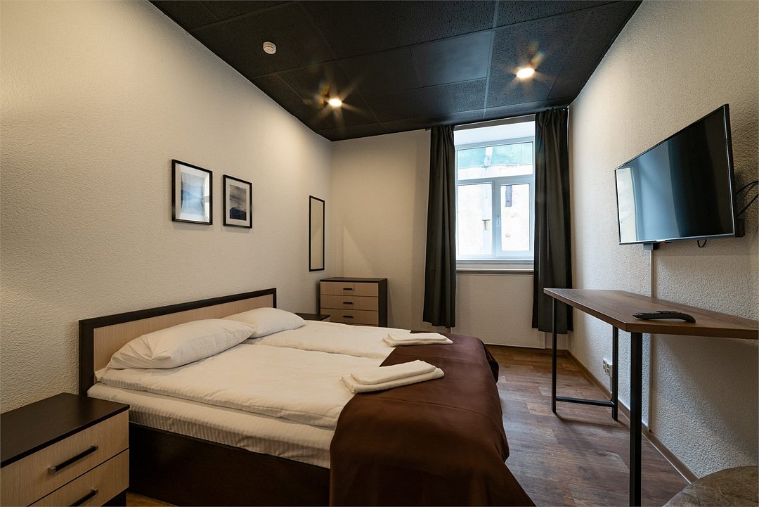 Площадь - от 8м2 до 15м2 Двухместные номера расположены на 2 этаже с видом на тихий двор, оборудованы всем необходимым для комфортного проживания: двуспальной кроватью с пружинным матрасом, комодом или шкафом, постельным бельем, по 2 полотенца на каждого гостя, телевизором с ТВ-приставкой. В общем доступе: 10 душевых и 11 туалетов, кухня с обеденной зоной (микроволновка, мультиварка, электрический чайник, холодильник, посуда, столовые приборы), стиральная машина, утюг и гладильные принадлежности. На всей территории работает высокоскоростной бесплатный Wi-Fi. Заселение происходит дистанционно, с помощью заранее отправленной инструкции. Дополнительно можно приобрести на ресепшен: - зубной набор - бритвенный - косметический - шапочку для душа - беруши - тапочкиУслуги и удобства