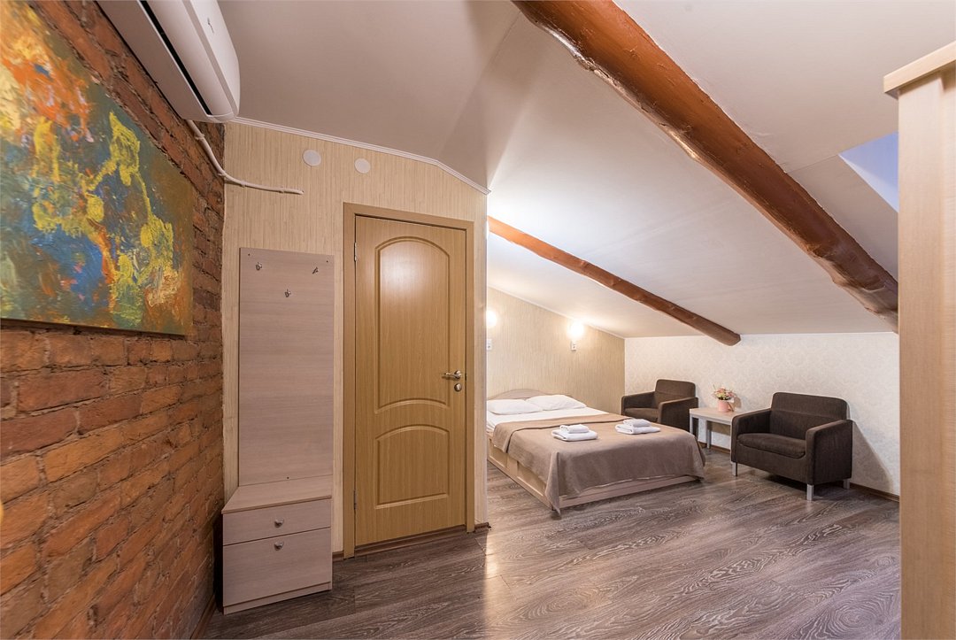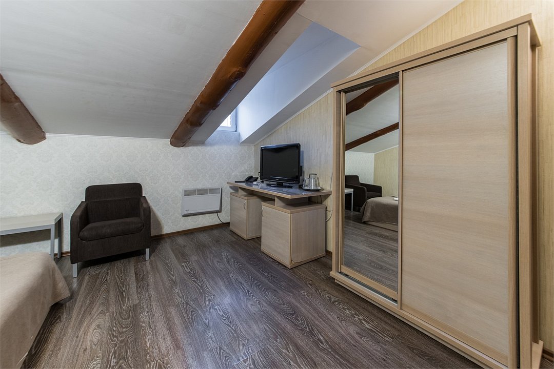 Номер “Стандарт Мансарда” – это идеальный выбор для тех, кто ценит уют, оригинальность и неповторимый шарм. Расположенный под самой крышей этот номер подарит Вам особое ощущение уединения и комфорта.Услуги и удобства