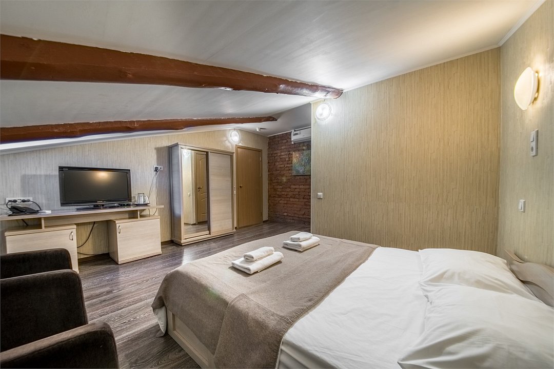 Wi-Fi, телефон, фен, электронные замки, утюг, банные принадлежности, банные полотенца, тапочки, гигиенические средства, двуспальная кровать, шкаф для одежды, письменный стол, сейф, унитаз, отопление, душ, кулер на этаже, стаканы, стул, тумба, туалет, телевизор с плоским экраном, мини-холодильник, мансардные окна, уборка номера, вешалки-плечики, мыло, затемняющая штора, зеркало в полный ростВ гостиничном номере