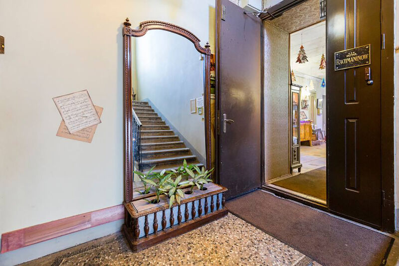 Разделен на три зоны: прихожую, спальню с гостиной, кабинет и ванную комнату. В прихожей - стена с газетными страницами, обклеенная в рахманиновский период.