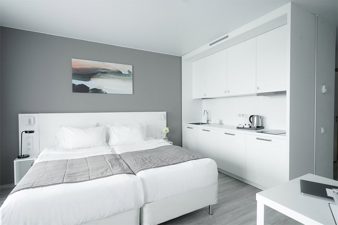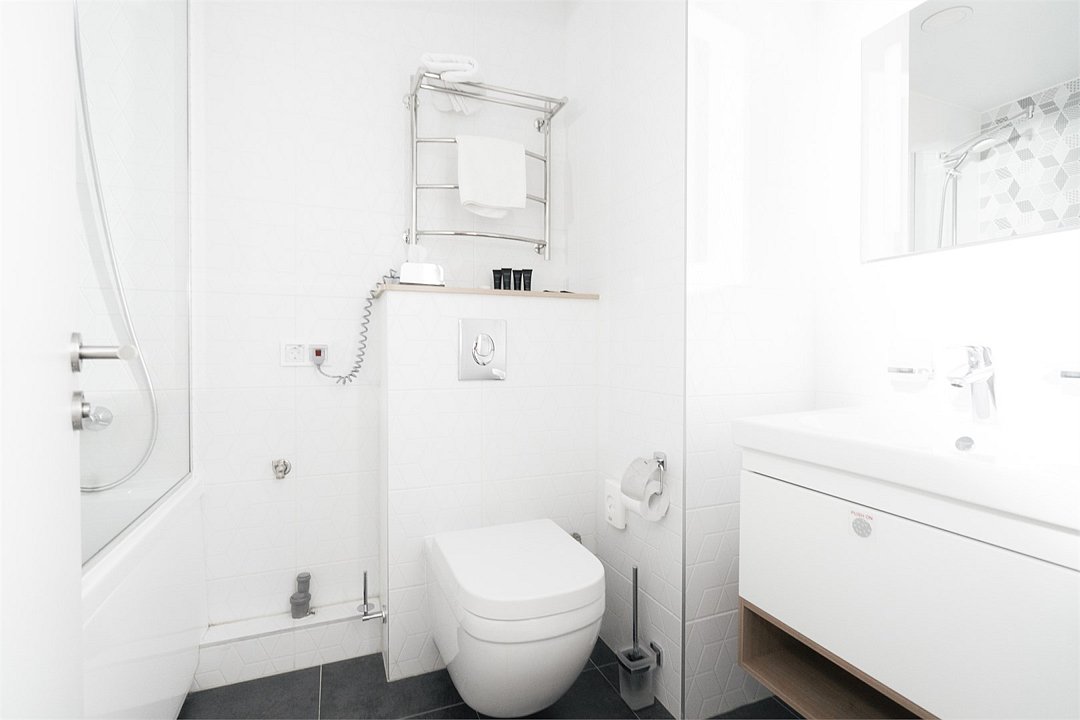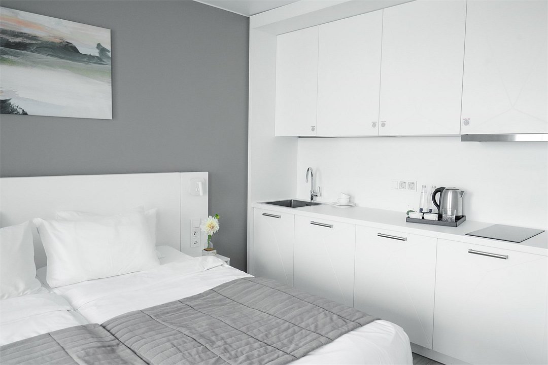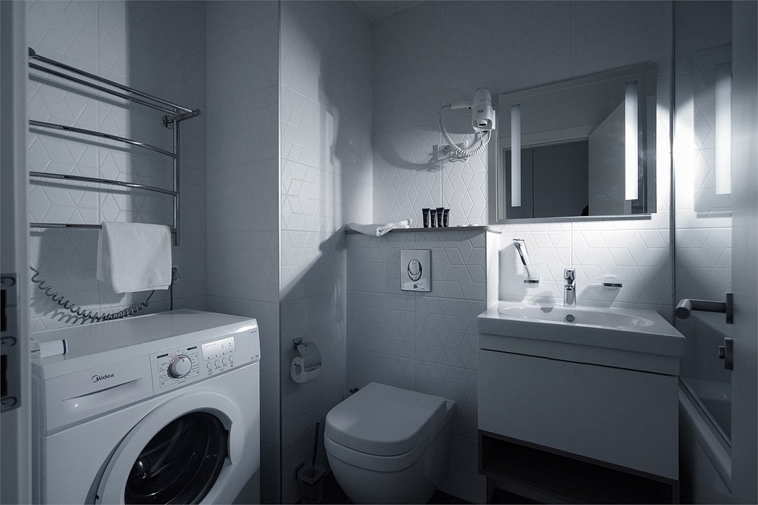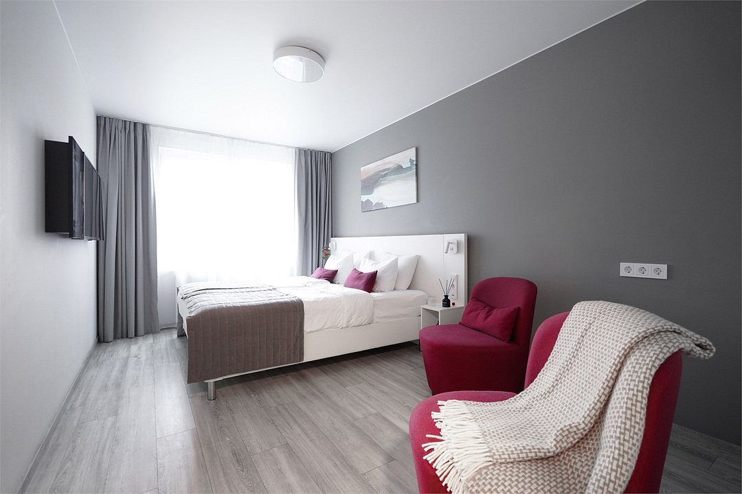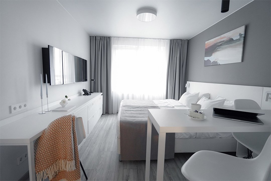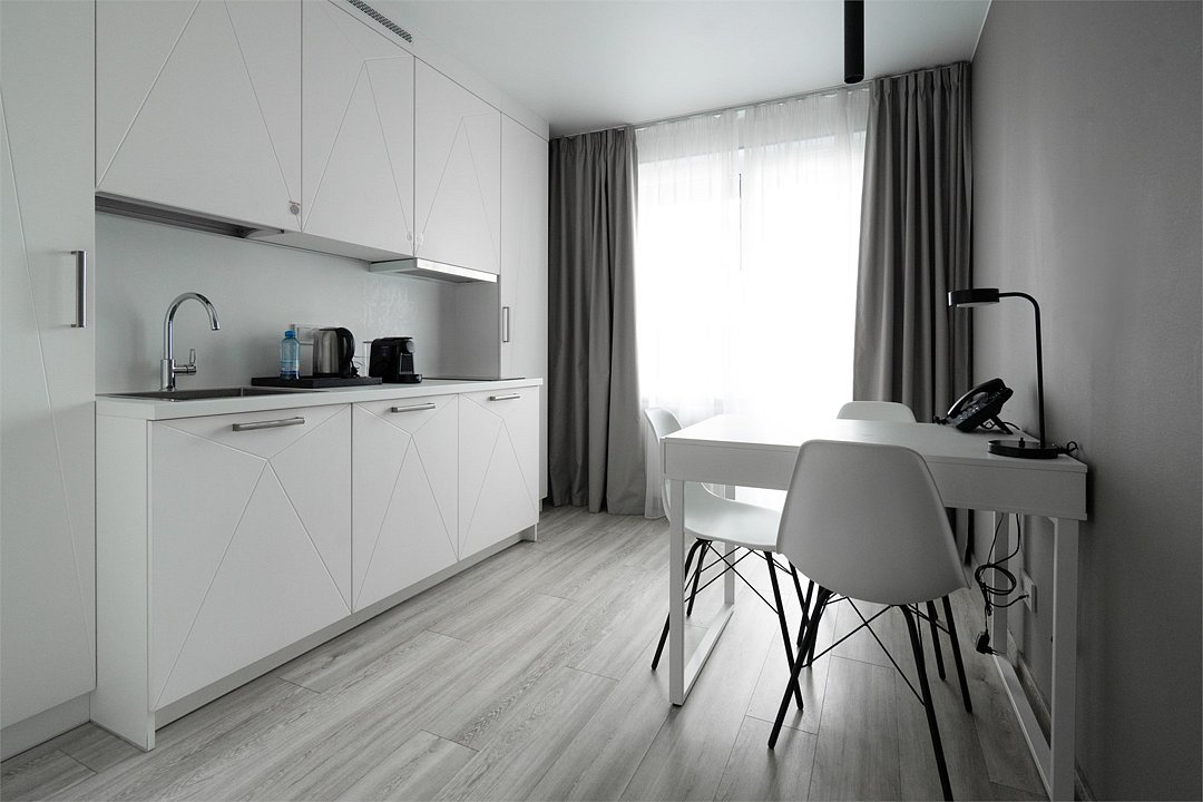 Просторный и комфортный номер с тщательно организованным пространством. Оригинальный дизайн интерьеров в стиле скандинавского минимализма и эффективного зонирования. Отдельная кухня-гостиная прекрасно подходит для встречи гостей - имеется полный комплект необходимой техники и посуды. В ванной комнате установлена стиральная машина для экономии времени и высокого качества немецкая сантехника. Обращаем внимание, что каждое первое число месяца в бассейне и сауне Fitness House проводится санитарный день. Посещение фитнес-центра и бассейна доступно только для гостей старше 14 лет! Регистрационный сбор для иностранных граждан составляет 300 р. за каждого гостя и оплачивается непосредственно в отеле при заселении.Услуги и удобства