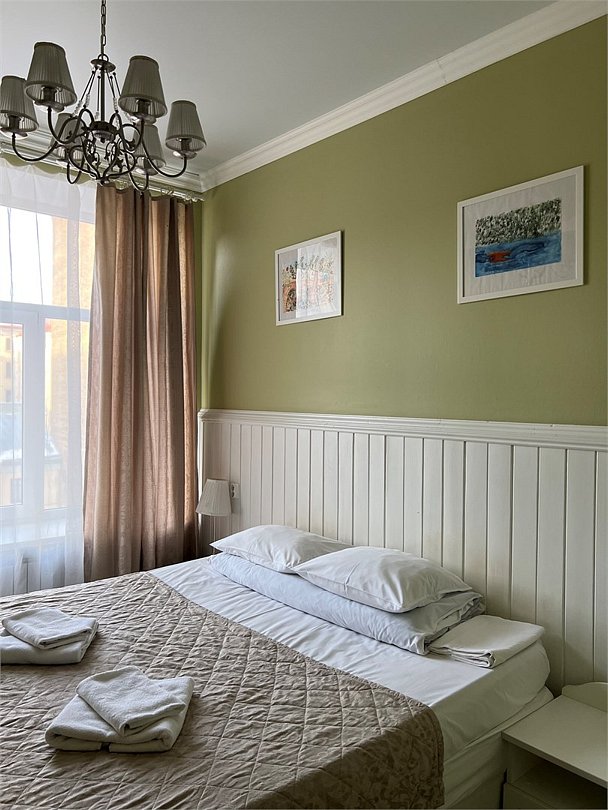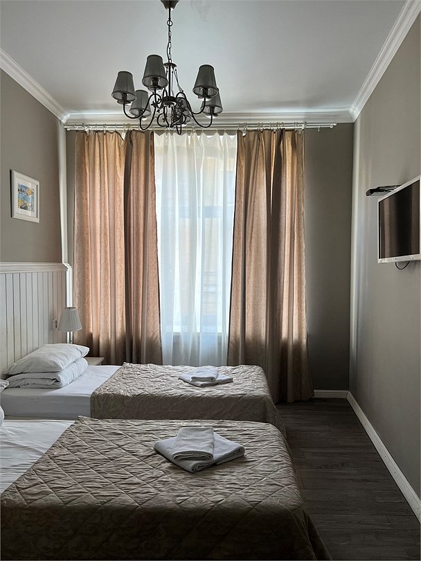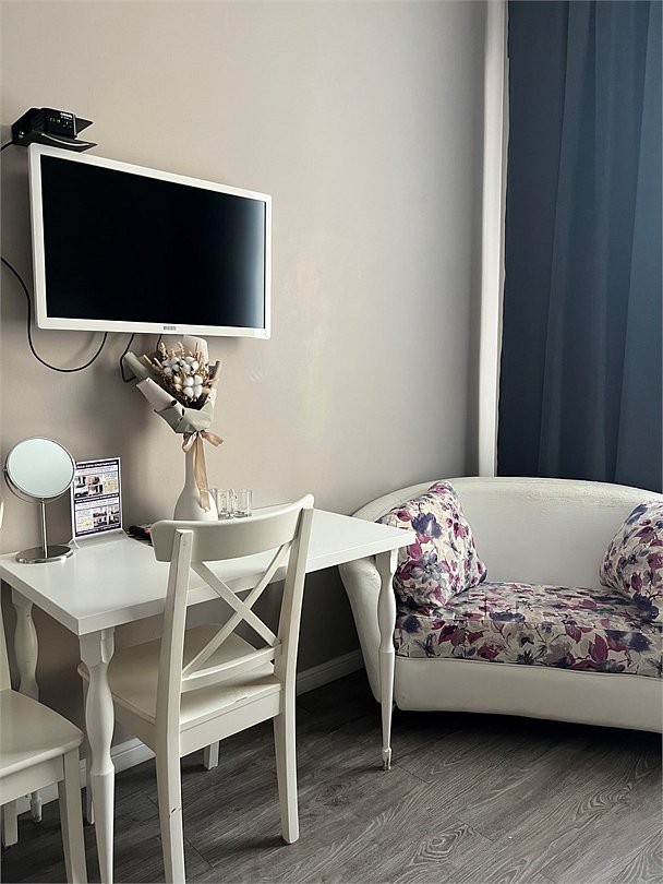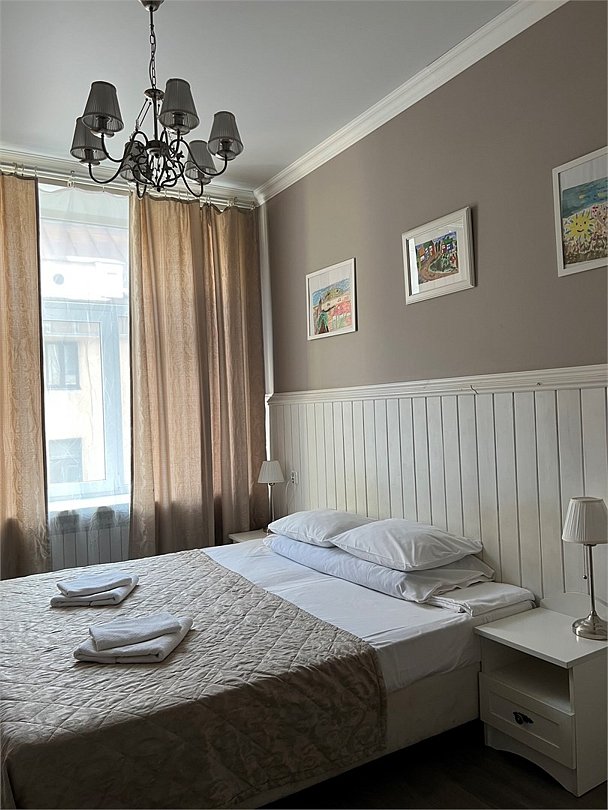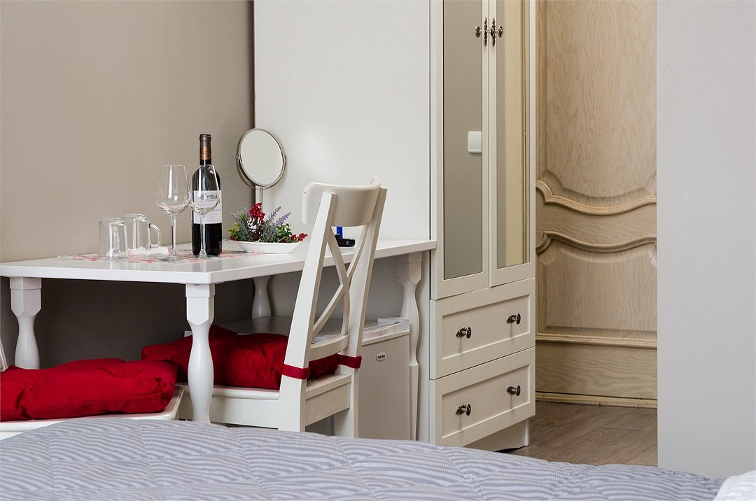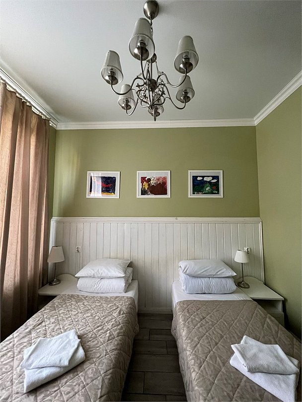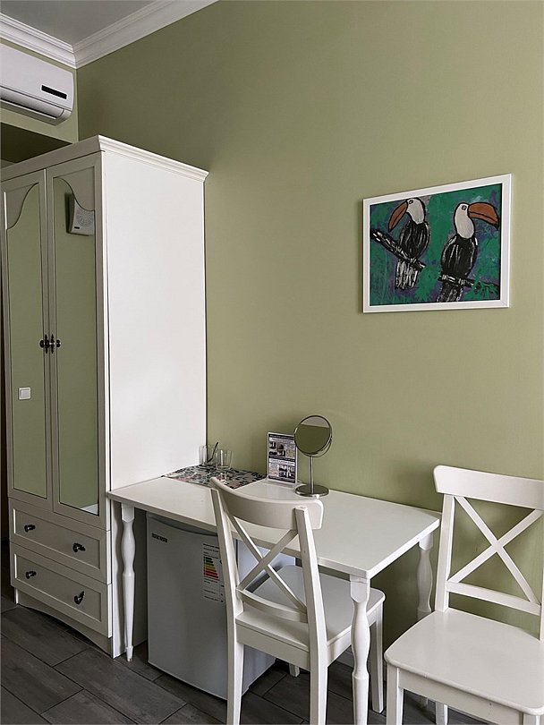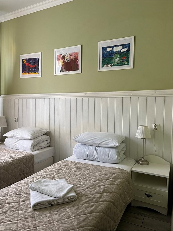 Воздушный легкий интерьер в стиле "Прованс" в светлых тонах, детские рисунки, одеяла в которых можно утонуть, уютная мебель, вид на тихую улицу – вся обстановка располагает к тому, чтобы Вы могли чувствовать себя как дома. В номере есть все необходимое для комфортного проживания: современная мебель, ТВ, кабельные/спутниковые телеканалы, бесплатный WI-FI, телефон, индивидуальный кондиционер. Ванная комната оборудована современной сантехникой и предметами личной гигиены. Это отличный вариант как для длительного, так и для краткосрочного проживания.Услуги и удобства