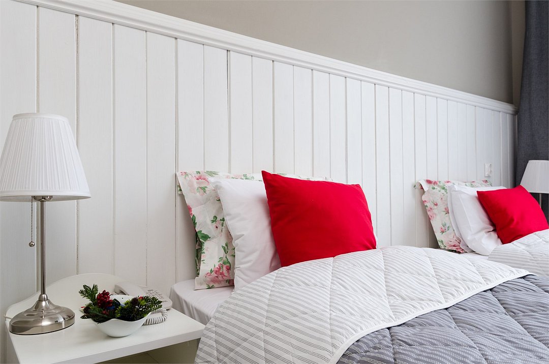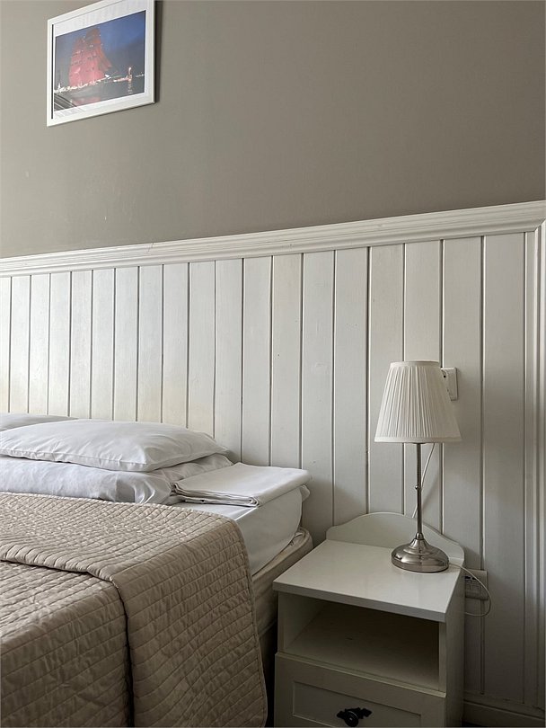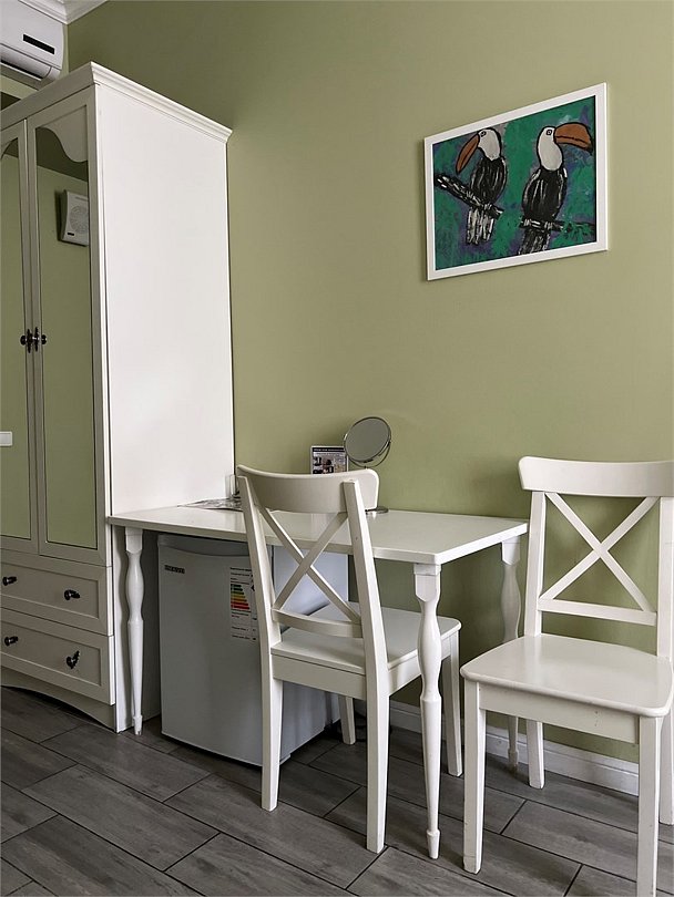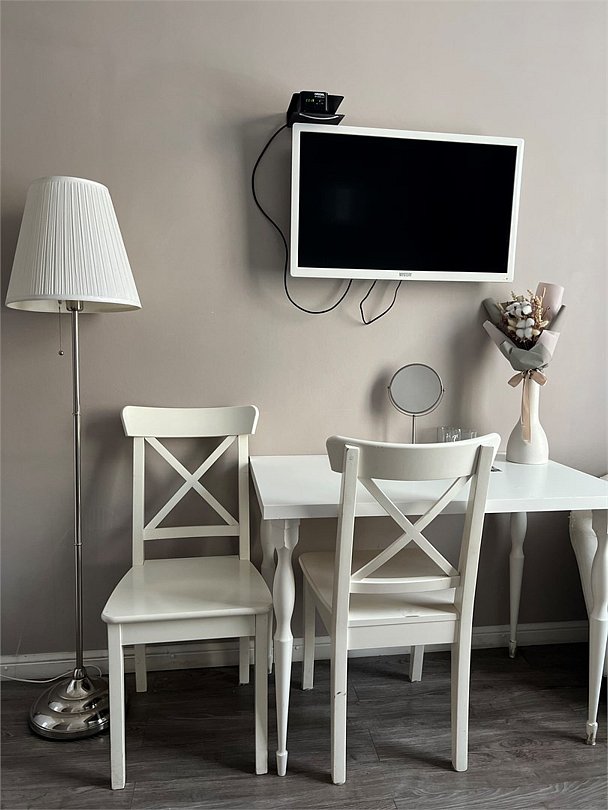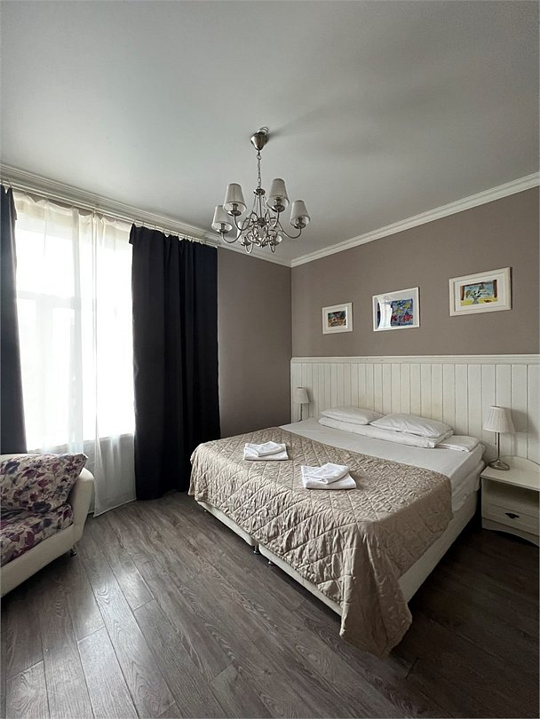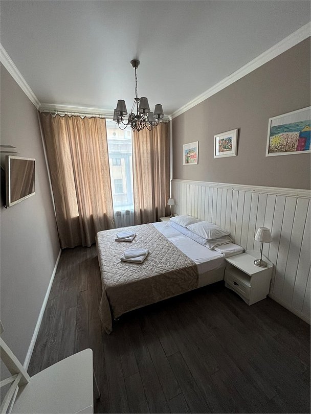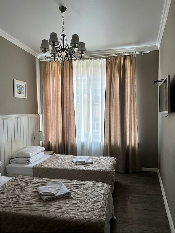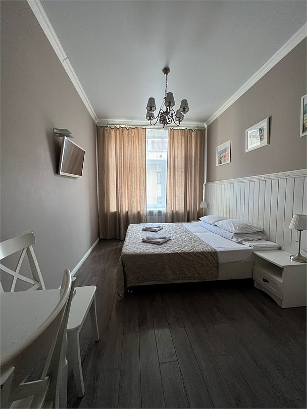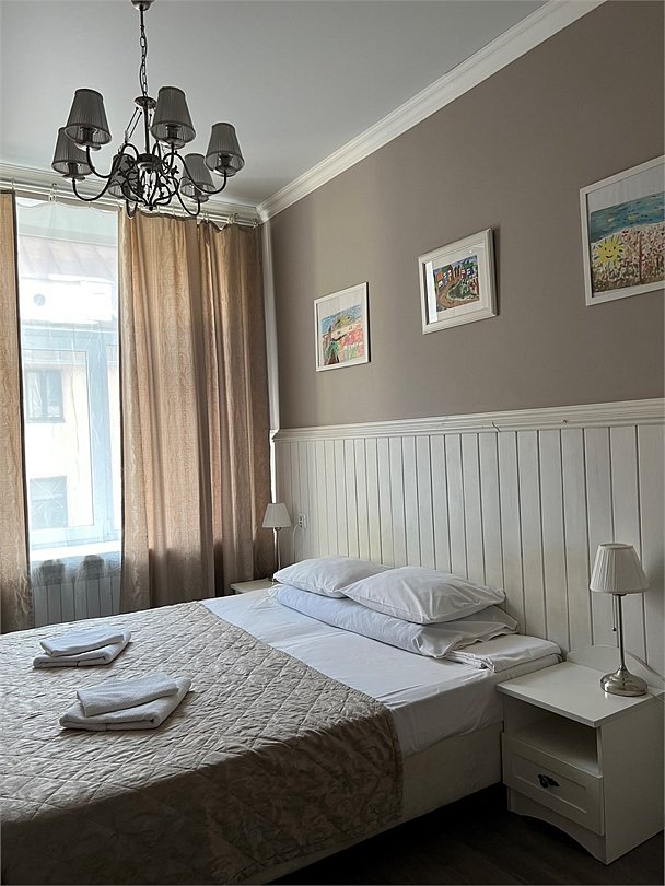 Воздушный легкий интерьер в стиле "Прованс" в светлых тонах, детские рисунки, одеяла в которых можно утонуть, уютная мебель, вид на тихую улицу – вся обстановка располагает к тому, чтобы Вы могли чувствовать себя как дома. В номере есть все необходимое для комфортного проживания: современная мебель, ТВ, кабельные/спутниковые телеканалы, бесплатный WI-FI, телефон, индивидуальный кондиционер. Ванная комната оборудована современной сантехникой и предметами личной гигиены. Это отличный вариант как для длительного, так и для краткосрочного проживания.Услуги и удобства