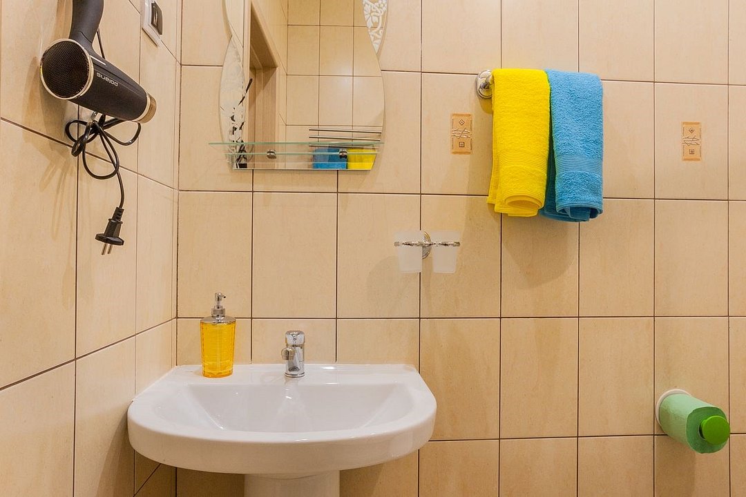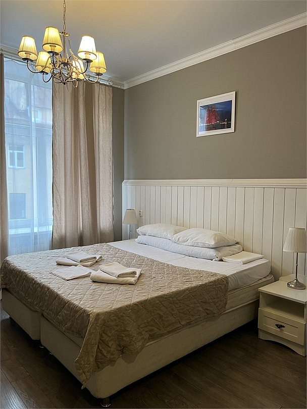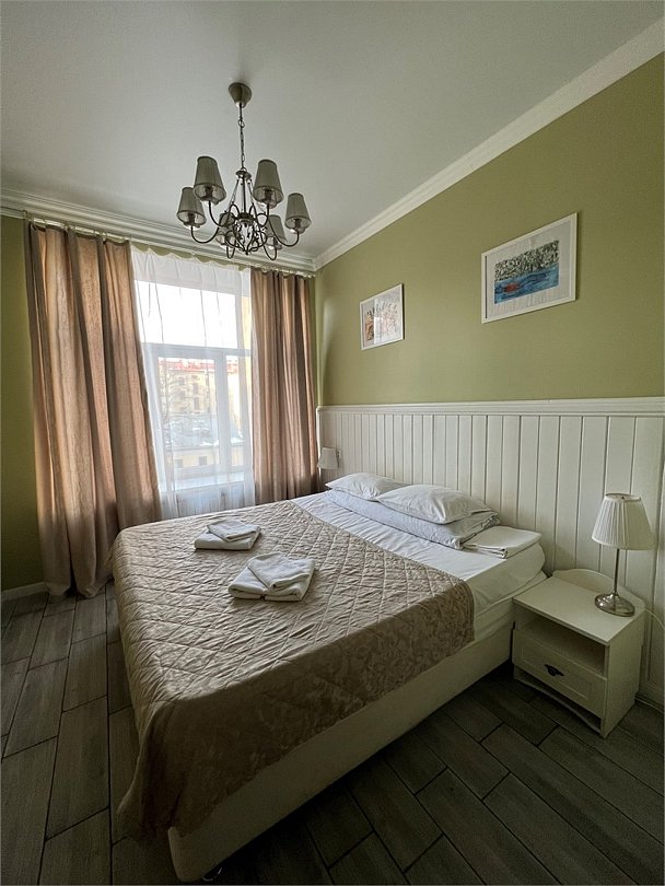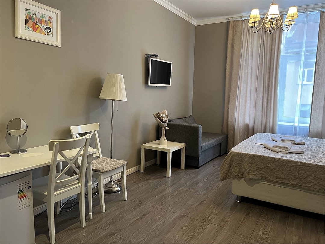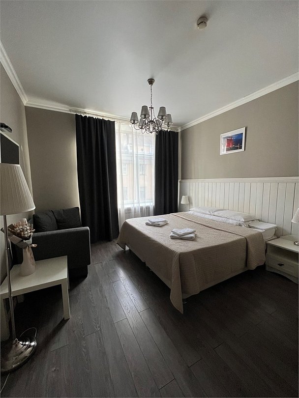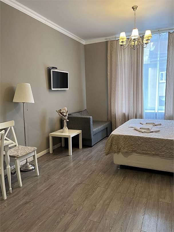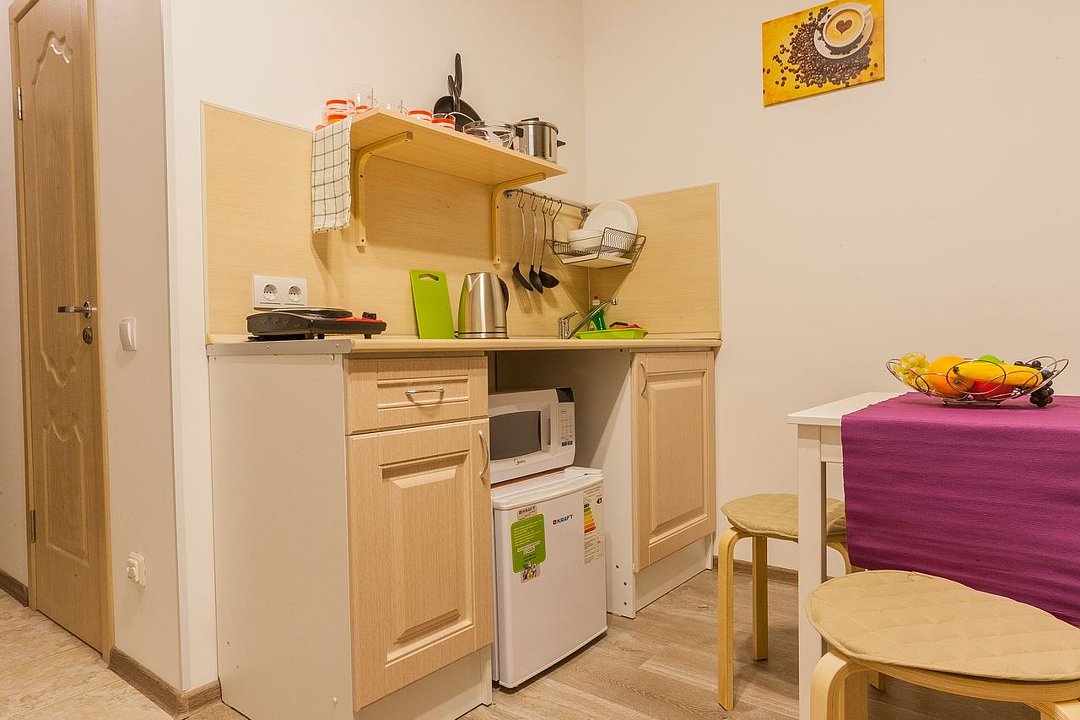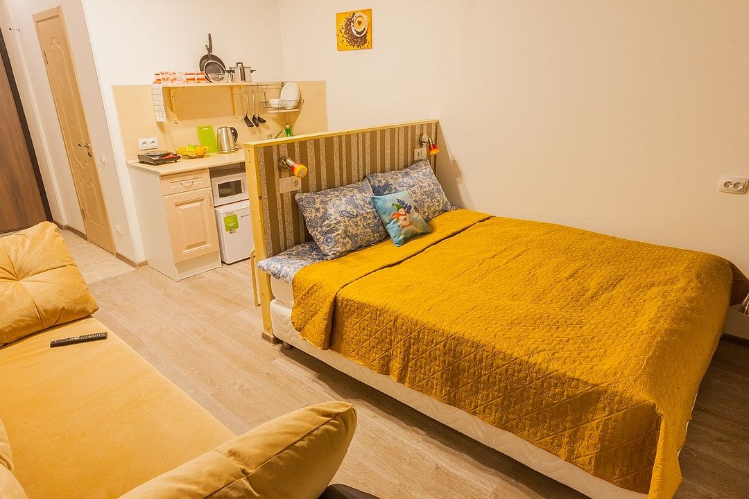 Уютная и максимально комфортная студия, которая подходит для размещения, как двух, так и трех человек: в комнате в наличии диван и удобная двуспальная кровать (160*200), полностью оборудованная мини-кухня с микроволновой печью, холодильником и электрическим чайником, а также необходимой посудой и столовыми приборами. В апартаментах есть все необходимое для комфортного проживания: современная мебель, ТВ, кабельные/спутниковые телеканалы, бесплатный WI-FI, стиральная машина. В собственной ванной комнате предоставлены фен и предметы личной гигиены. К услугам гостей ежедневная уборка апартаментов. Теплые и светлые апартаменты являются наилучшим выбором как для туристов, так и для приехавших по рабочим вопросам гостей, которым хочется немного отдохнуть после насыщенного дня и почувствовать себя в Санкт-Петербурге как дома.Услуги и удобства