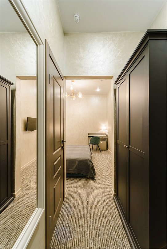 Wi-Fi, кондиционер, светильник, настольные лампы, фен, электронные замки, обогреватель, банные полотенца, тапочки, гигиенические средства, двуспальная кровать, шкаф для одежды, вешалки, письменный стол, зеркало, сейф, унитаз, раковина, ковровое покрытие, отопление, душ, кулер на этаже, вид во двор, стул, тумба, мини-холодильник, телевизор со Smart TV, номер для некурящих, мыло, затемняющая штора, без питомцевВ гостиничном номере