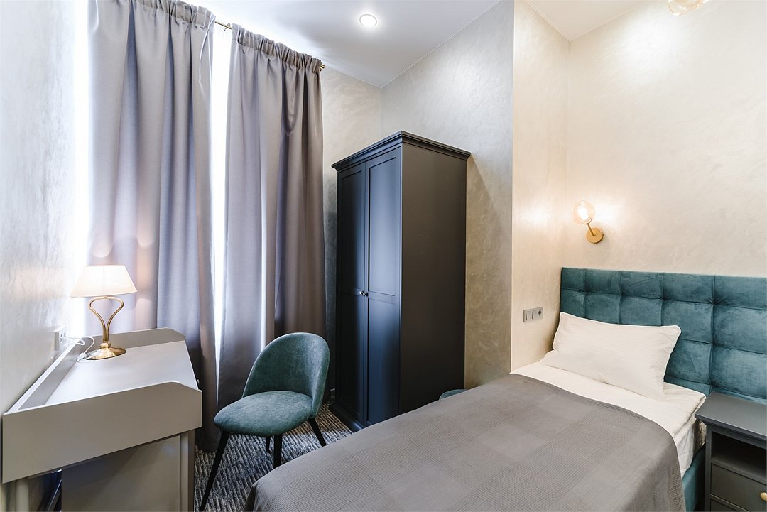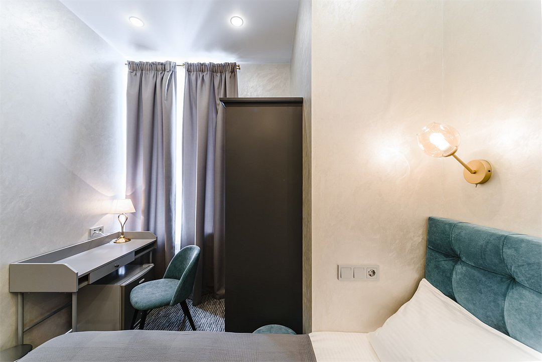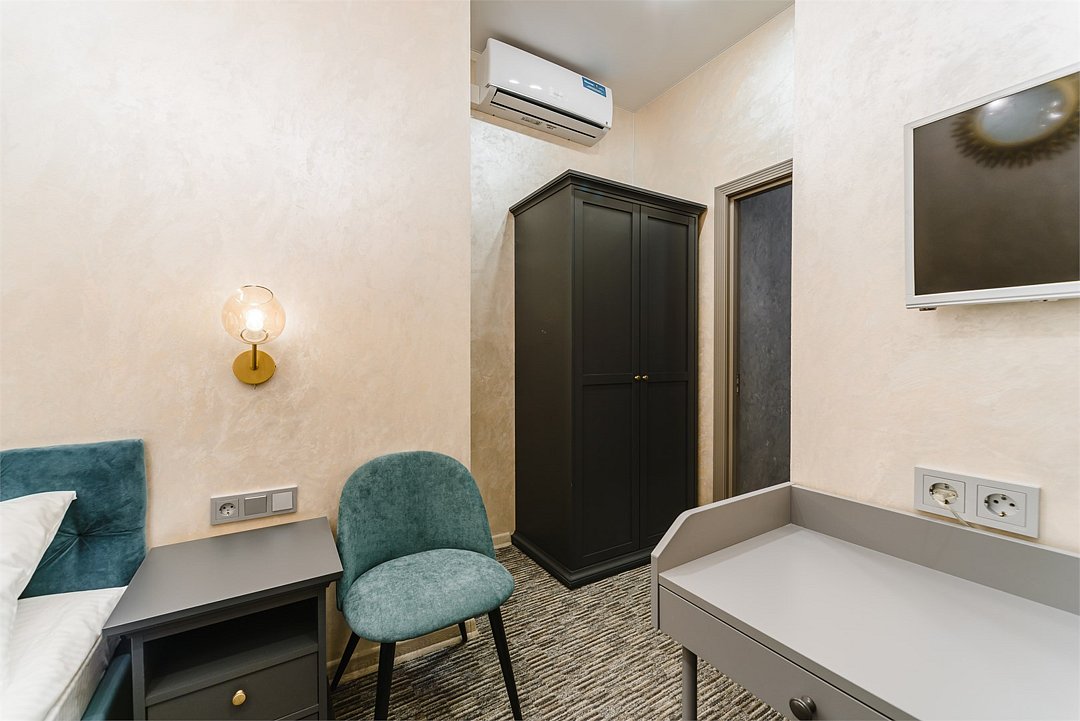 В одноместном номере без окна имеется всё самое необходимое для комфортного проживания. Односпальная кровать с удобным матрасом и прикроватная тумбочка, вместительный шкаф с личным сейфом, письменный стол, мини-холодильник, смарт-ТВ и личные удобства. В ванной комнате: набор полотенец для каждого гостя, тапочки и зубные наборы, фен, шампунь и гель для душа. В общей зоне отеля расположен кулер с питьевой водой, посуда и столовые приборы, микроволновая печь и гладильные принадлежности.Услуги и удобства