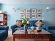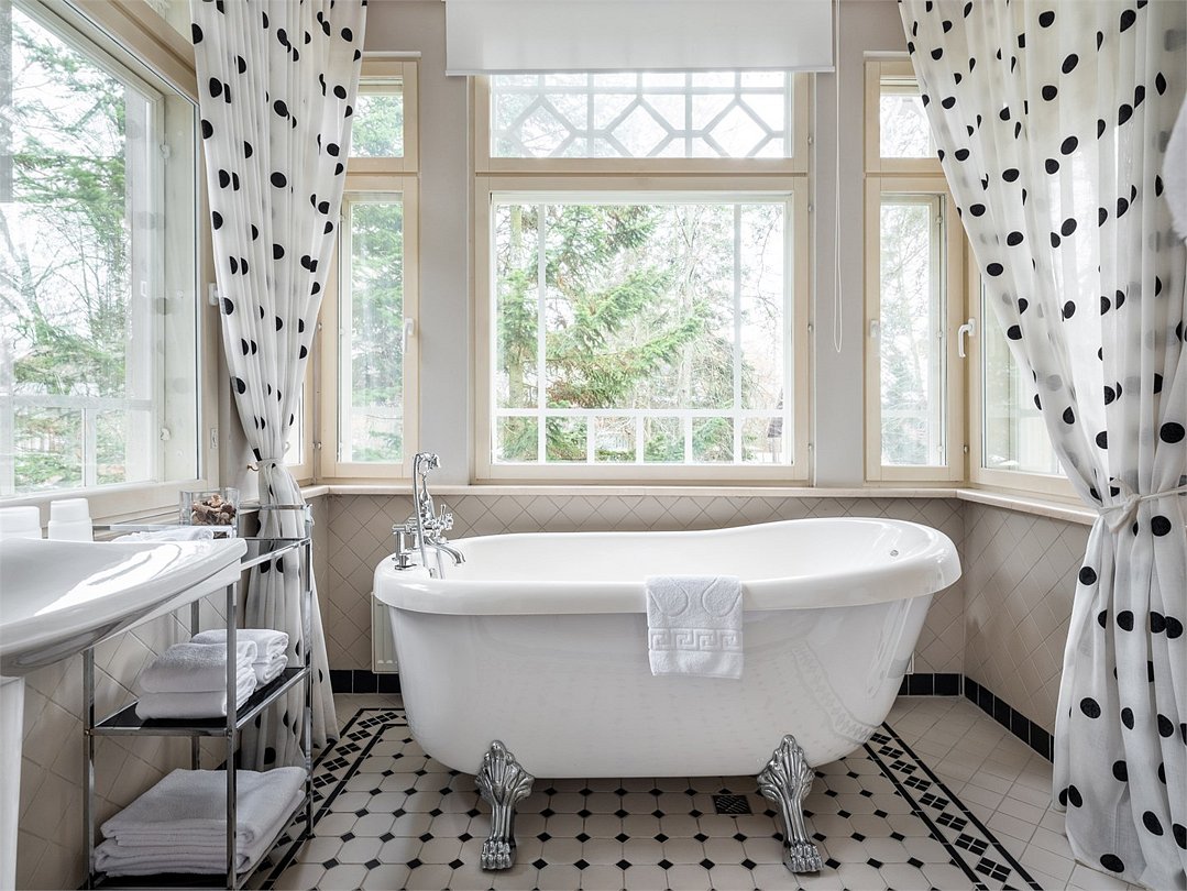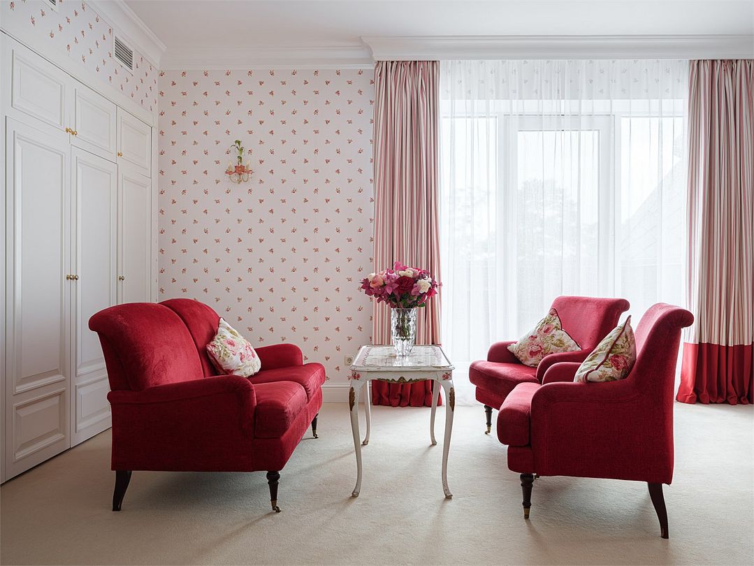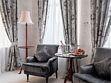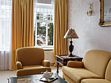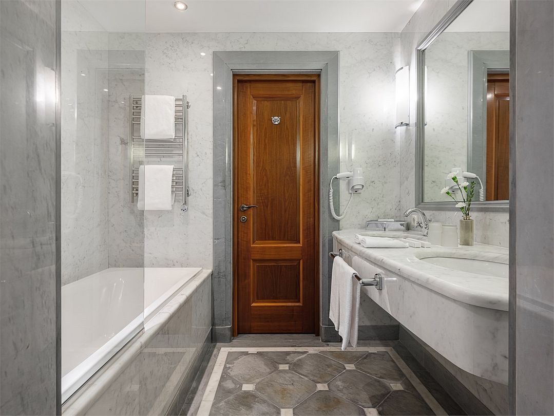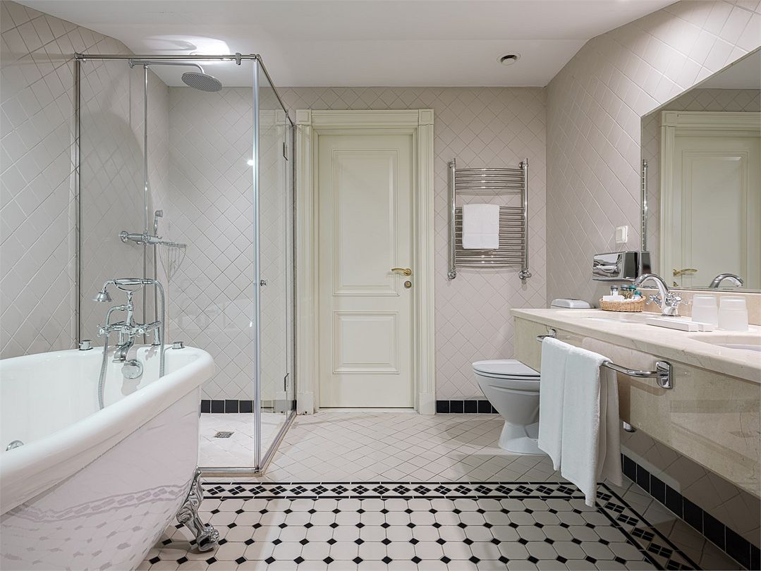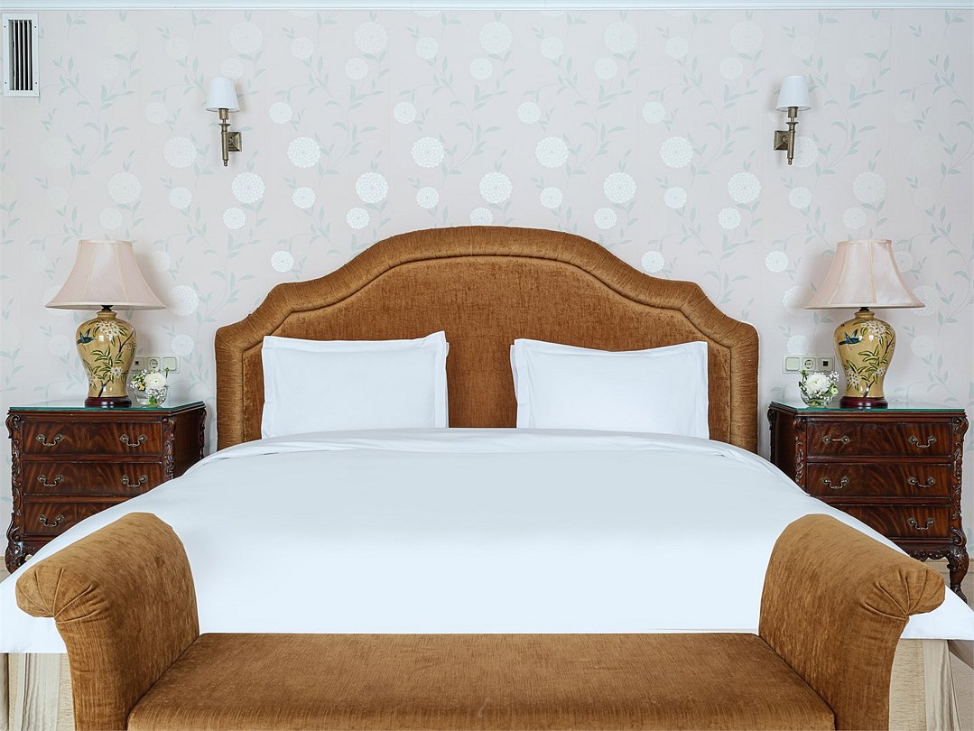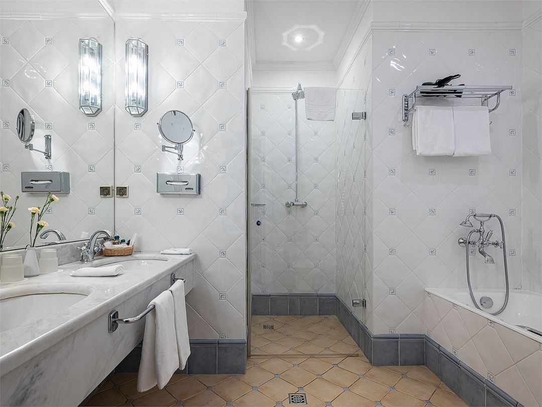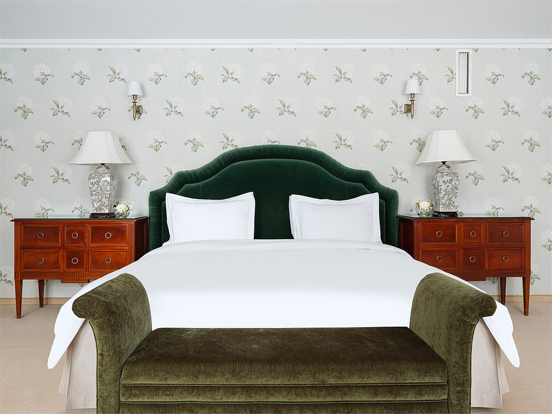 Просторный трехкомнатный номер, площадью 110 кв.м., оформленный в классическом стиле в золотых и зеленых тонах, прекрасно подойдёт для отдыха большой семье или двум парам. Уникальный по расположению и планировке, он совмещает в себе две полноценные спальни с персональными ванными комнатами, полностью отделанными мрамором, просторную гостиную, а также шикарную террасу с видом на бассейн и Финский залив.