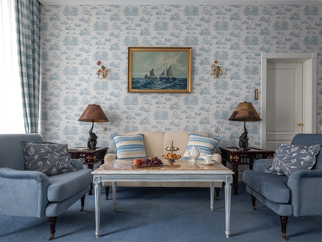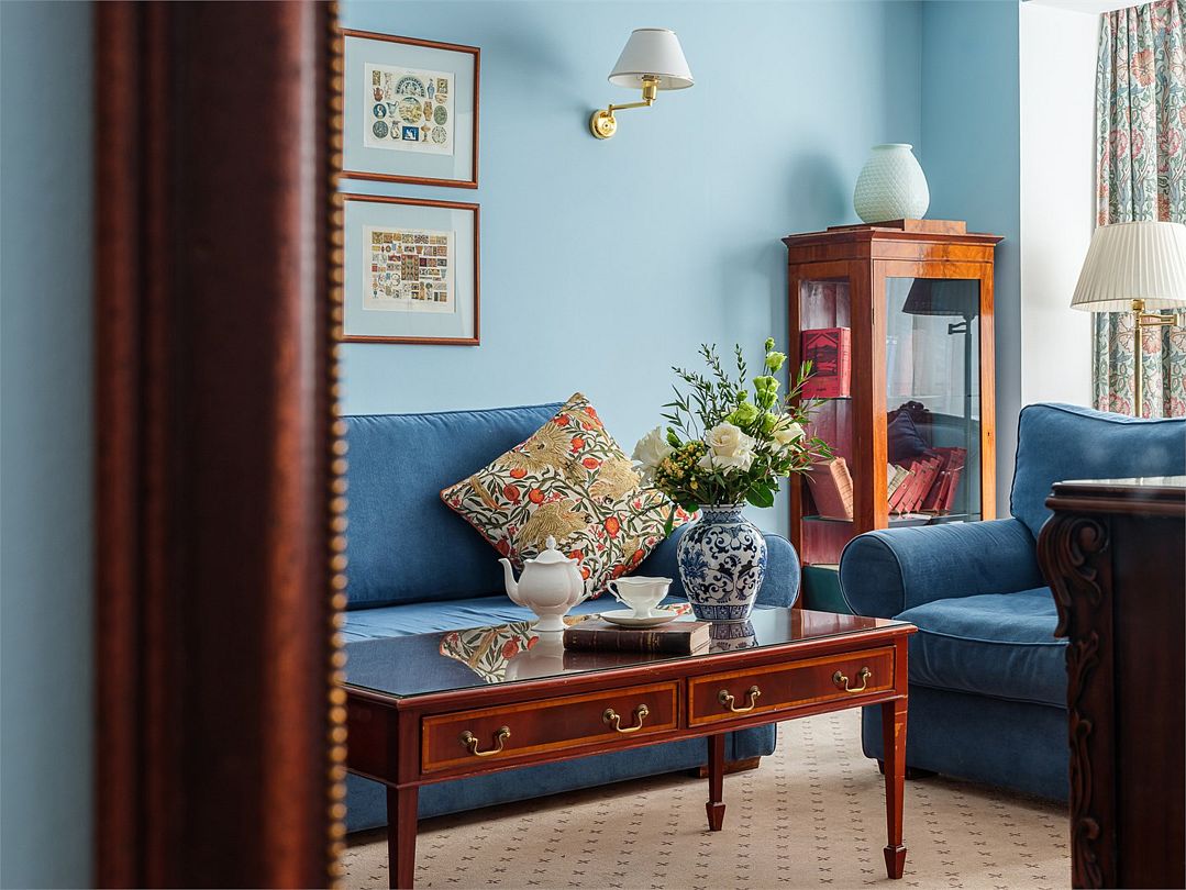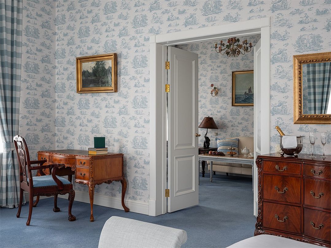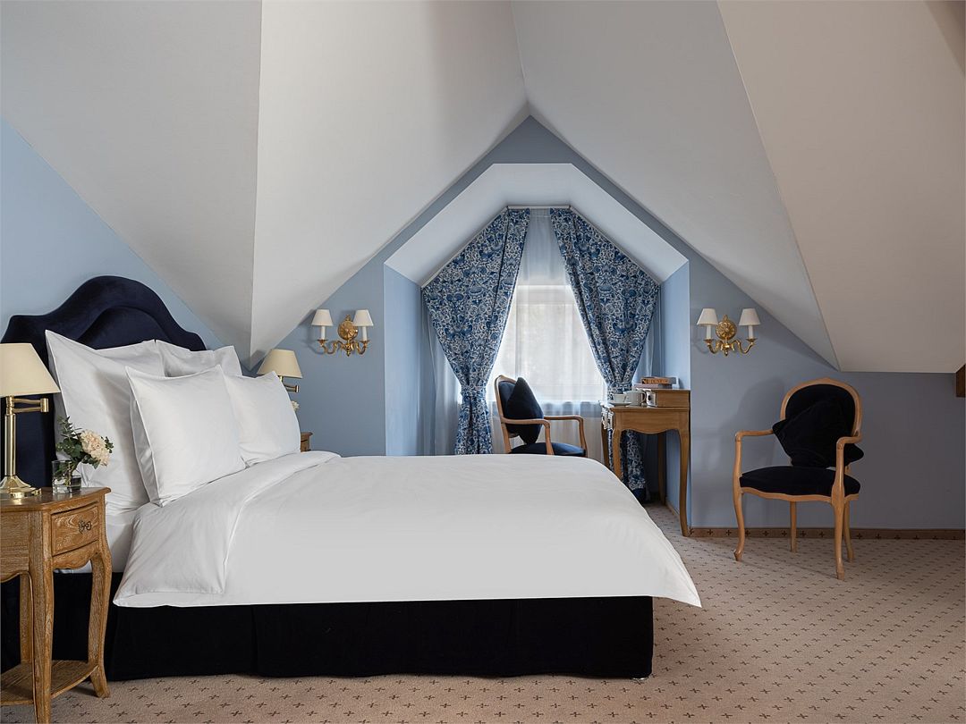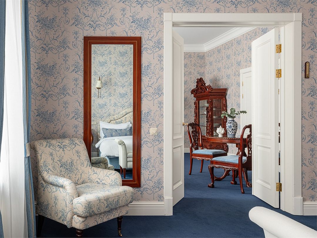 Роскошно оформленный двухкомнатный сьют площадью более 60 кв. м. расположен на втором этаже Дачи Шелепина, из номера открывается вид на Финский Залив. В дизайне интерьера преобладает голубое цветовое решение, и номер шикарно обставлен предметами антиквариата. В номере большая двуспальная кровать, мягкая мебель, письменный стол, журнальный столик, встроенный гардероб с отделениями для багажа, телефон, беспроводной доступ в Интернет, LCD телевизор, сейф, комплементарный мини бар с ассортиментом безалкогольных напитков и легких закусок. В ванной комнате: ванна, душевая кабина, фен, полы с подогревом, набор хлопковых полотенец, халаты, тапочки и европейские косметические принадлежности. Ресторанное обслуживание в номере 24 часа.