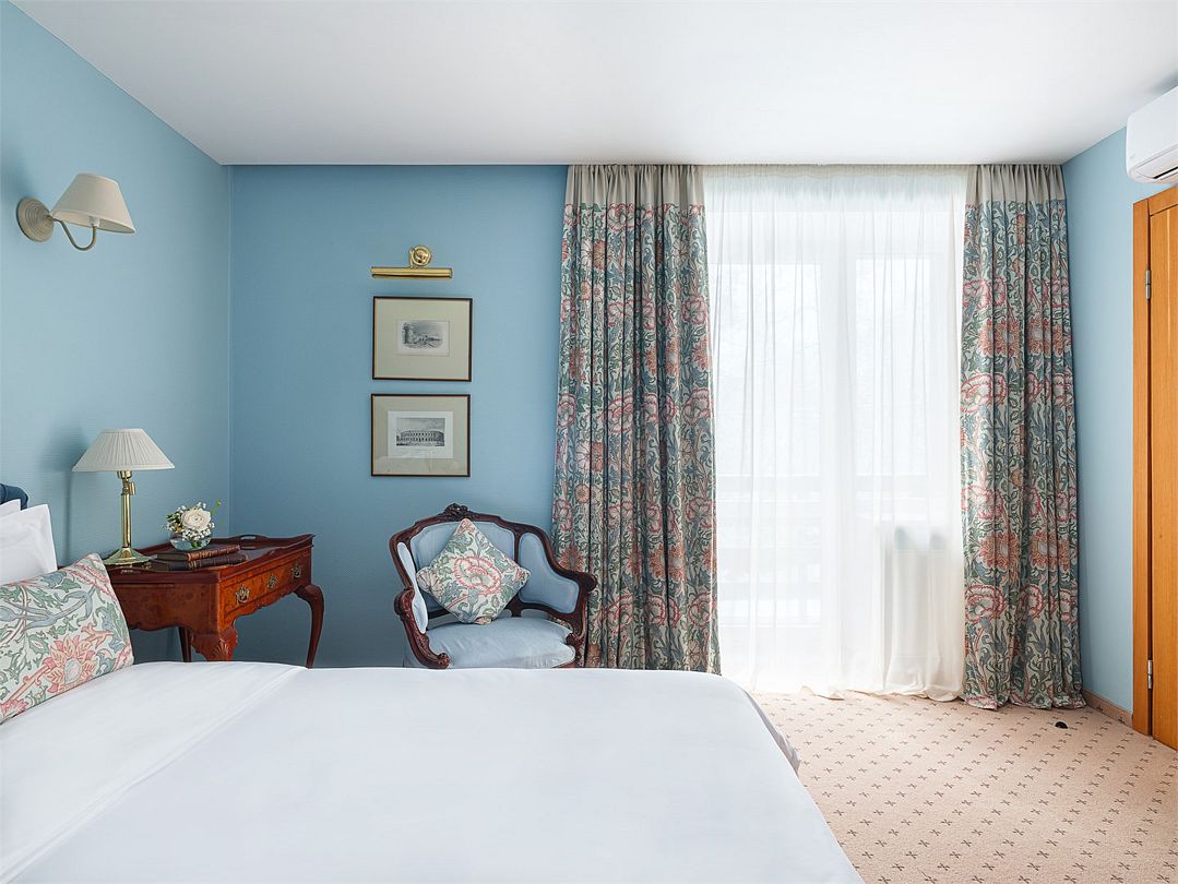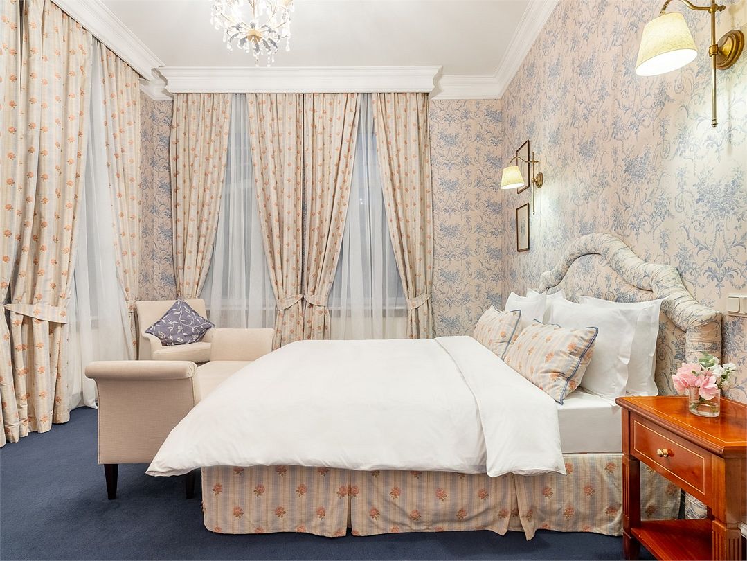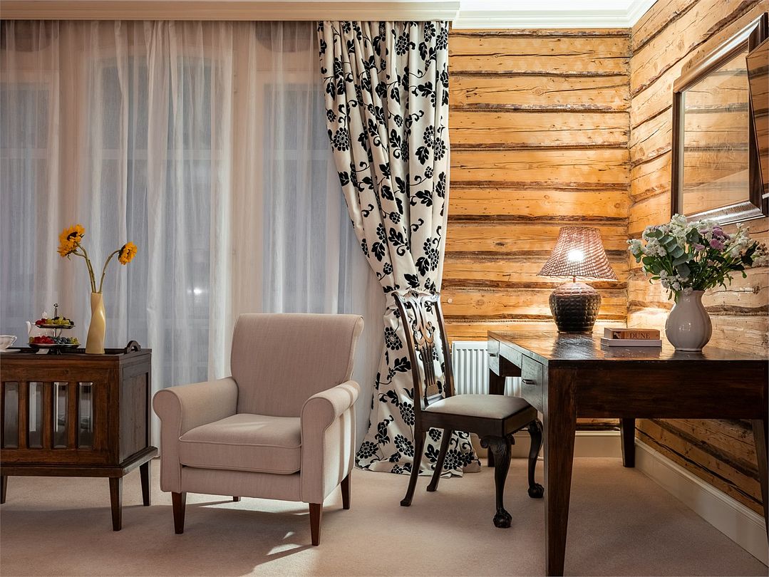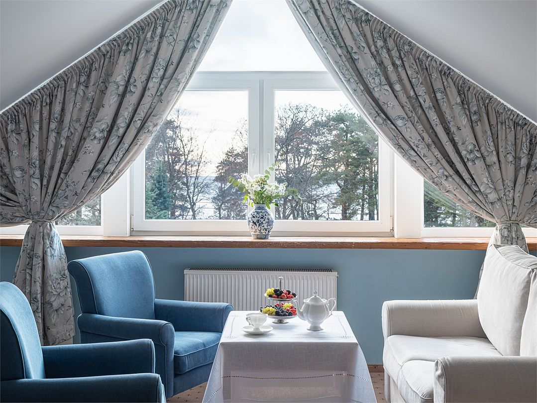 Элегантный однокомнатный номер, площадью более 40 кв. м., с изысканным интерьером в классическом стиле и элементами антиквариата. Номер оснащен собственной террасой с видом на Финский залив и персональной сауной. Здесь Вы найдёте всё для приятного романтического отдыха.