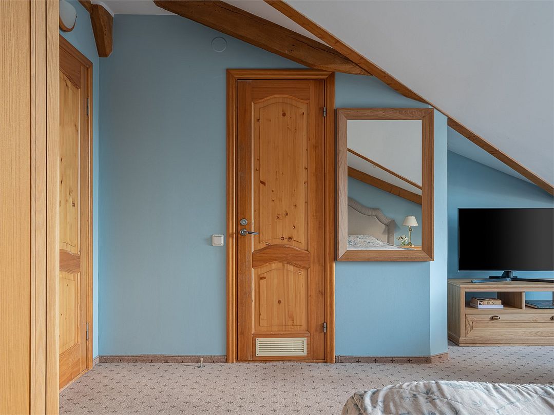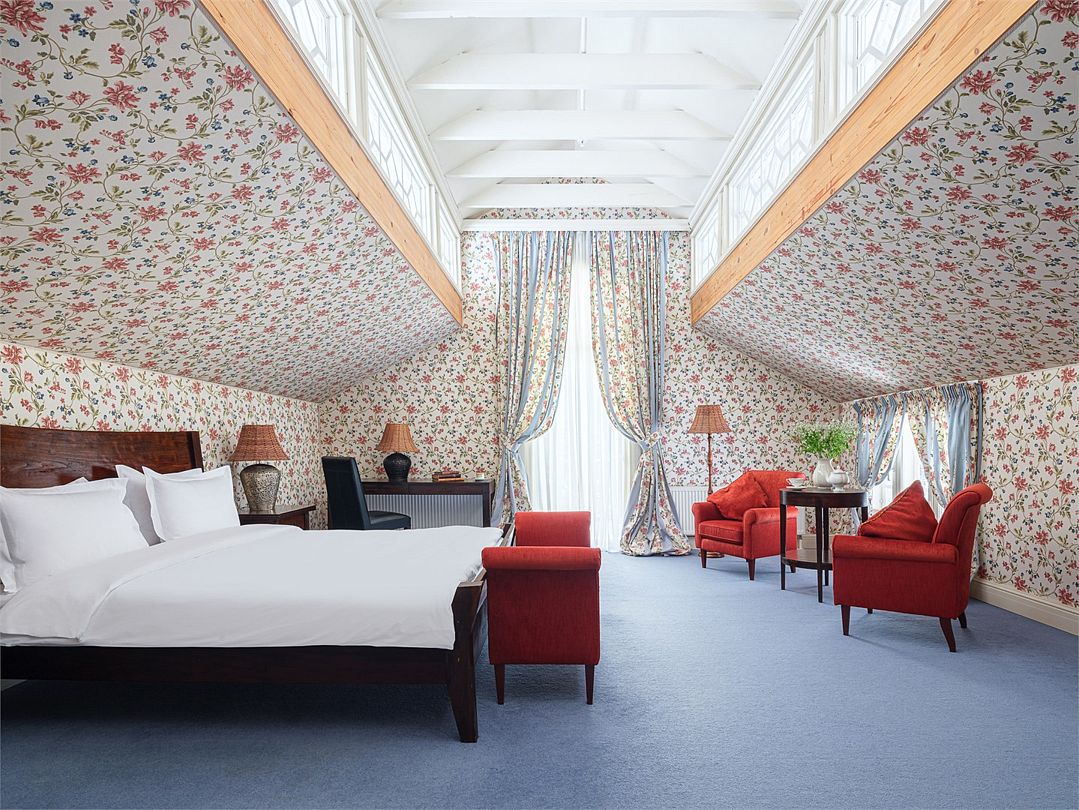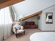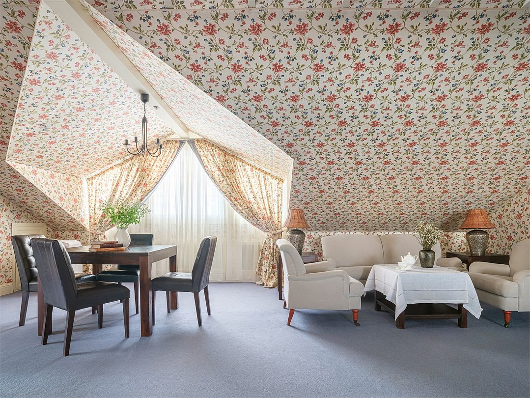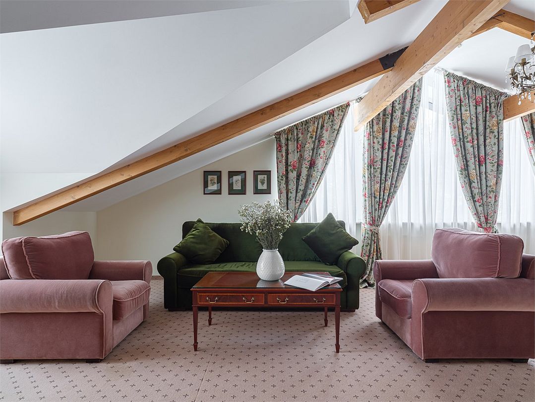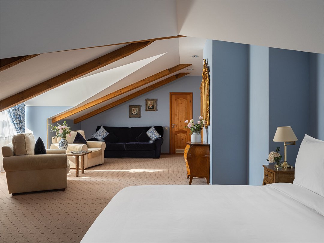 Просторный номер мансардного плана находится на 3м этаже основного корпуса Загородного клуба «Скандинавия» и СПА, общая площадь 60 кв. м., с изысканным интерьером в классическом стиле и элементами антиквариата, в дизайне интерьера преобладают бежево-зеленые тона. Гостиная и спальня разделены перегородкой, два TV, сейф, мини-бар. В гостиной находится два мягких кресла, двухместный диван, журнальный столик, шкаф-гардероб, кофейный столик со стульями. Спальня оборудована большой двухспальной кроватью, раскладным диваном, прикроватными тумбами, настольными лампами, торшером, у окна находится будуарное кресло. Вид из гостиной на дачу Лихачёва и бассейн, из спальни — на бизнес-центр. Ресторанное обслуживание в номере 24 часа.