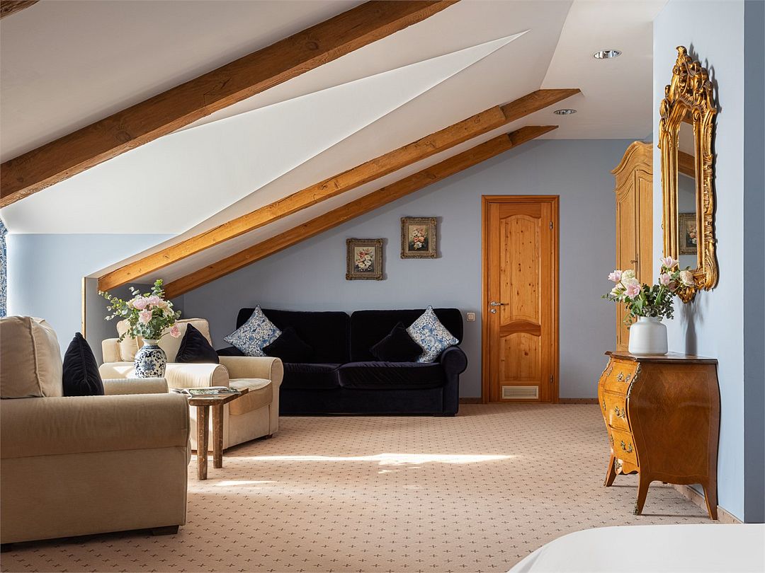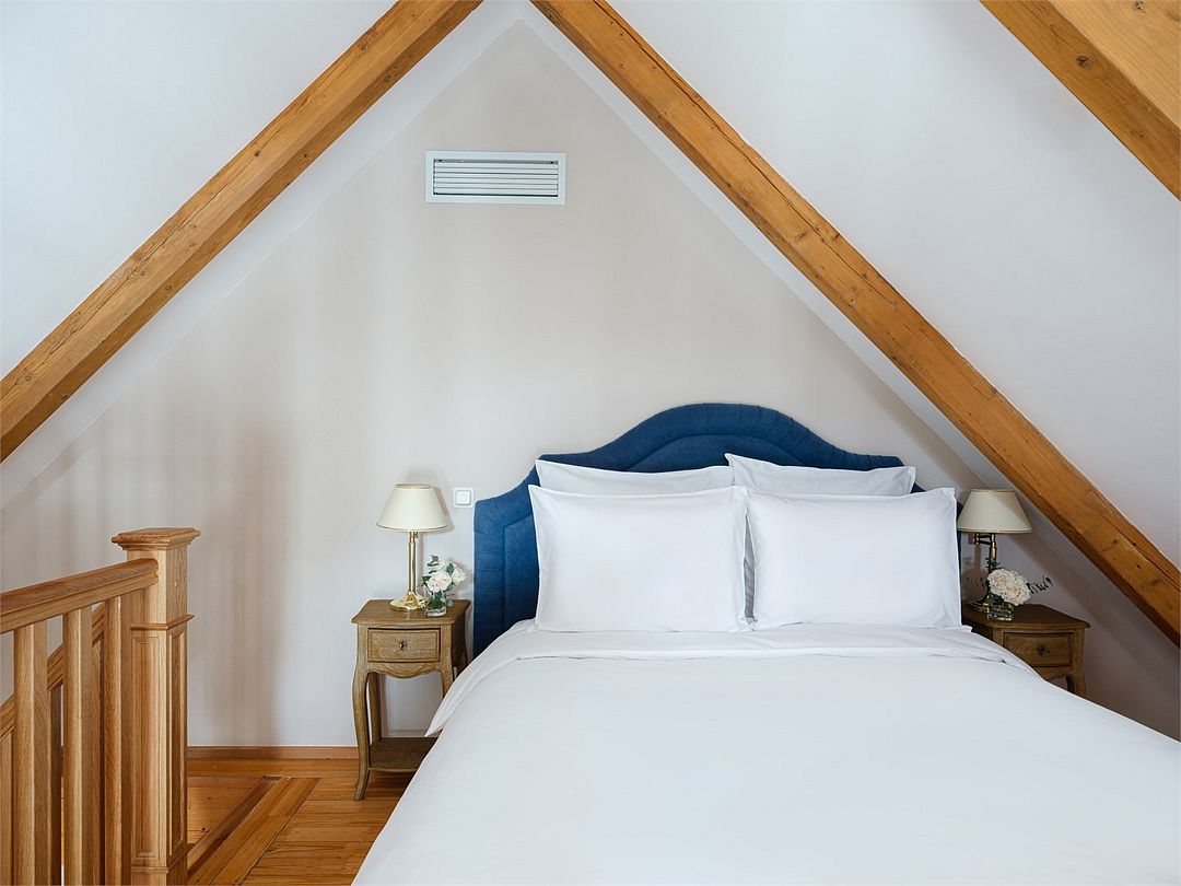Роскошный мансардный апартамент площадью 150 кв. м. с двумя спальнями, просторной гостиной, удобным кухонным блоком, большой ванной комнатой, гостевой туалетной комнатой и небольшим балконом занимает весь третий этаж дачи Лихачева. Он идеально подходит для длительного проживания или празднования знаменательных событий. В номере к вашим услугам: две двуспальные кровати, мягкая мебель, письменный стол, журнальный столик, два обеденных стола на 8 и 4 человек, LCD телевизор, беспроводной доступ в Интернет, сейф. Кухня оснащена встроенной плитой, микроволновой печью, посудомоечной машиной, холодильником и отдельной морозильной камерой. В большой ванной комнате расположены: ванна на львиных лапах и душевая кабина. В гостевой ванной комнате установлена душевая кабина. В обеих ванных комнатах – пол с подогревом, фен, комплекты халатов и полотенец, тапочки, европейские косметические принадлежности. Ресторанное обслуживание в номере 24.