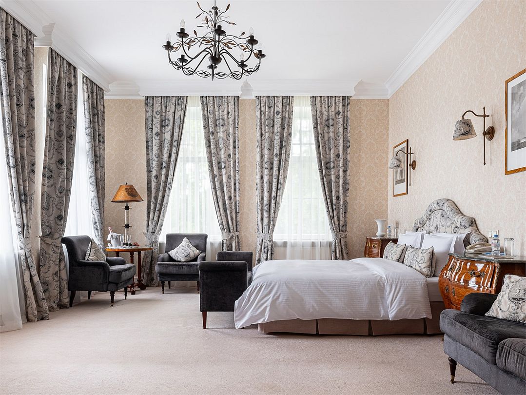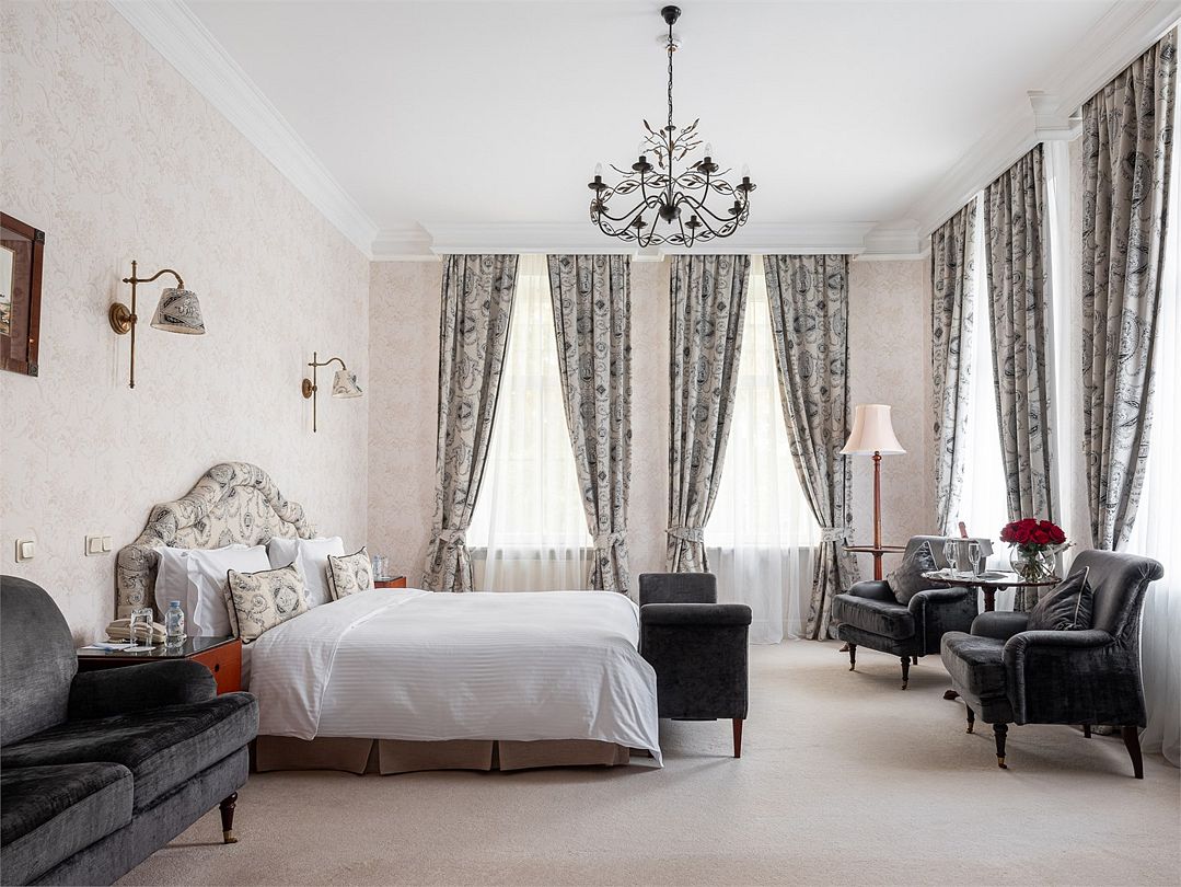 Однокомнатный сьют площадью более 40 кв.м., решенный в бежевых тонах, с видом на Финский Залив или Дачу Лихачева, декорированный предметами антиквариата и расположен на втором этаже Дачи Шелепина. В номере большая двуспальная кровать, мягкая мебель, письменный стол, журнальный столик, LCD телевизор, комплементарный мини бар с ассортиментом безалкогольных напитков и легких закусок, сейф. В ванной комнате: ванна, душевая кабина, пол с подогревом, фен, набор хлопковых полотенец, халаты, тапочки и европейские косметические принадлежности. Ресторанное обслуживание в номере 24 часа.