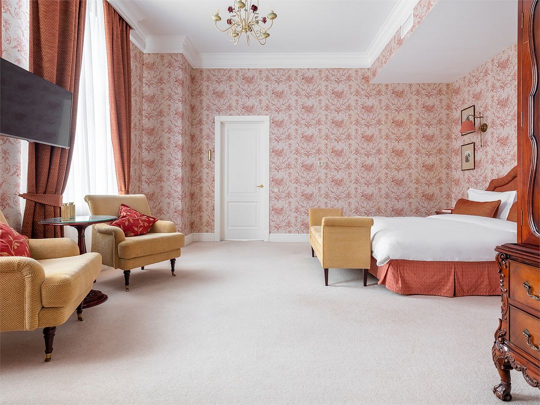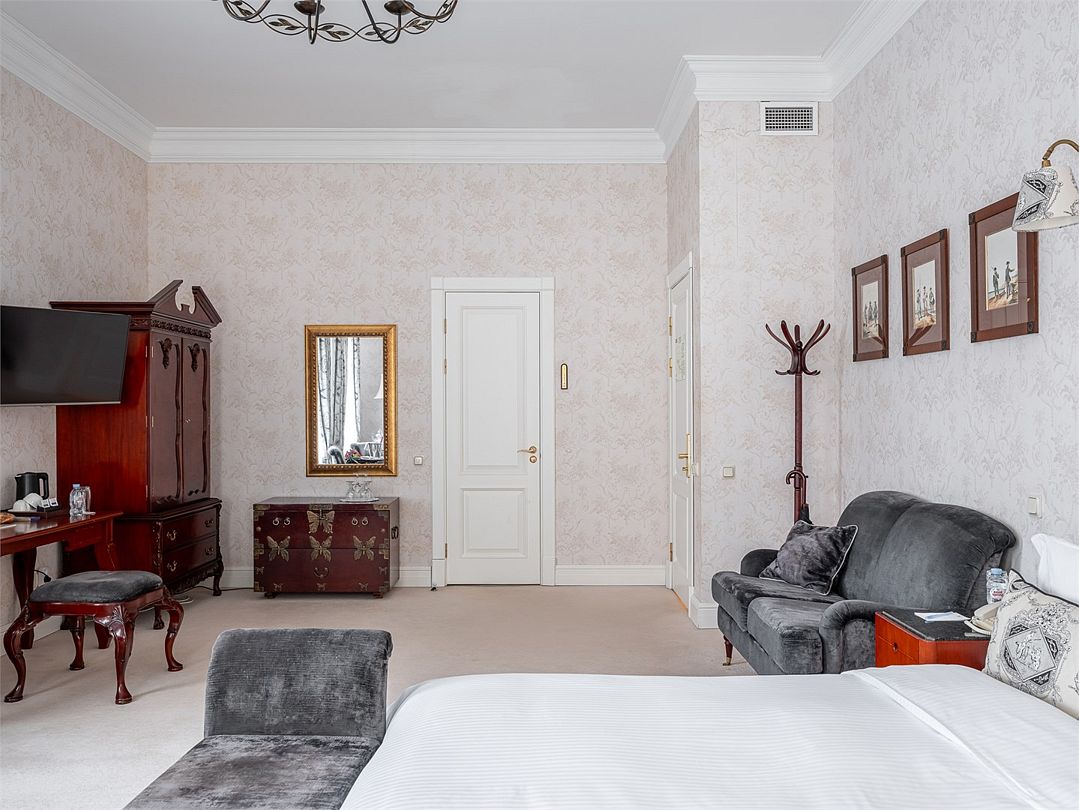 Это большой однокомнатный номер площадью около 35 кв. м. с видом тихую улицу. В номере к вашим услугам одна большая кровать, журнальный столик, диван, LCD телевизор, прямая телефонная линия, сейф, беспроводной доступ в Интернет и комплементарный мини бар с ассортиментом безалкогольных напитков. Ванная комната с ванной, полами с подогревом, феном, набором полотенец, тапочками, халатами и косметическими принадлежностями. Ресторанное обслуживание в номере 24 часа.